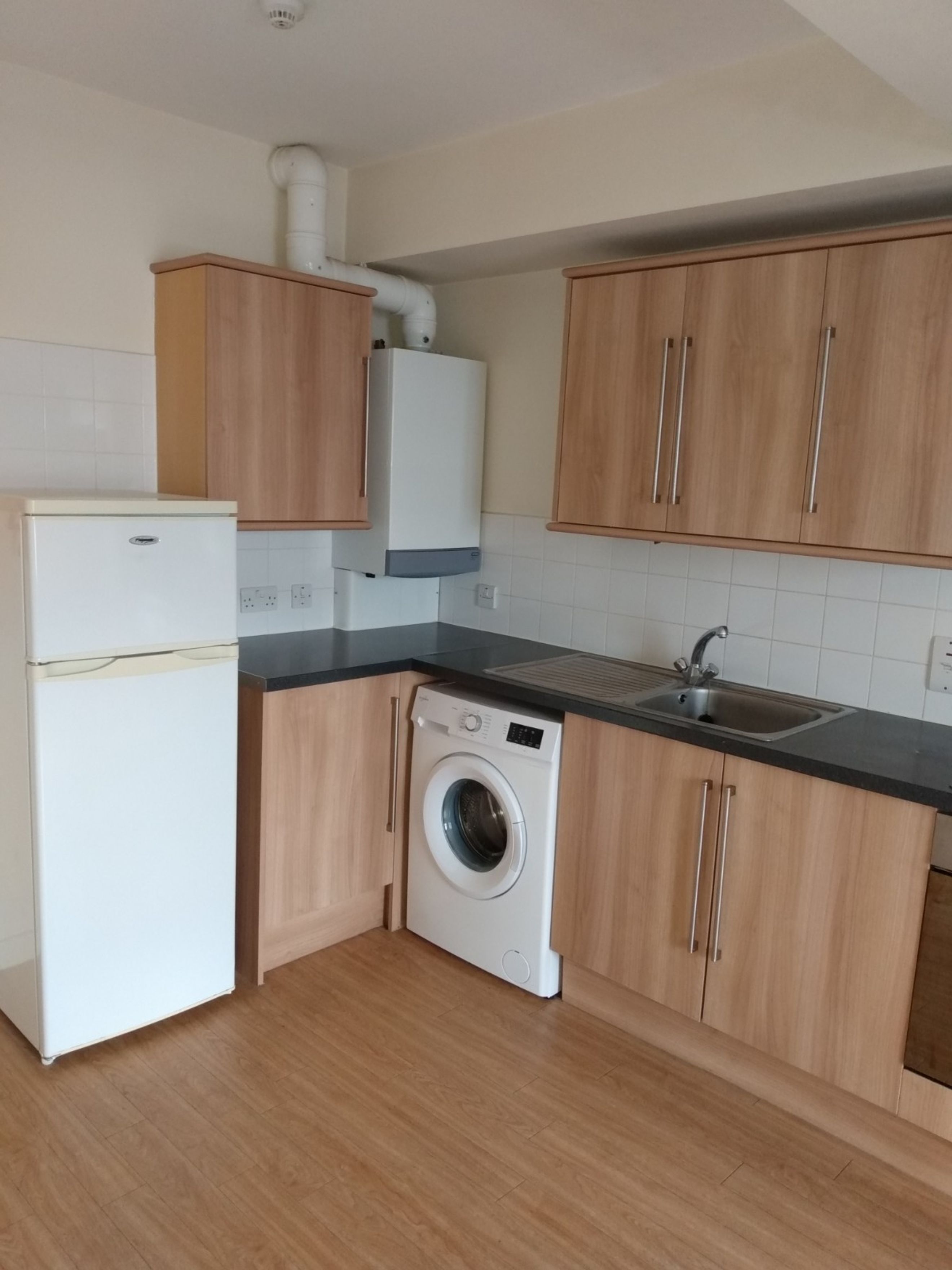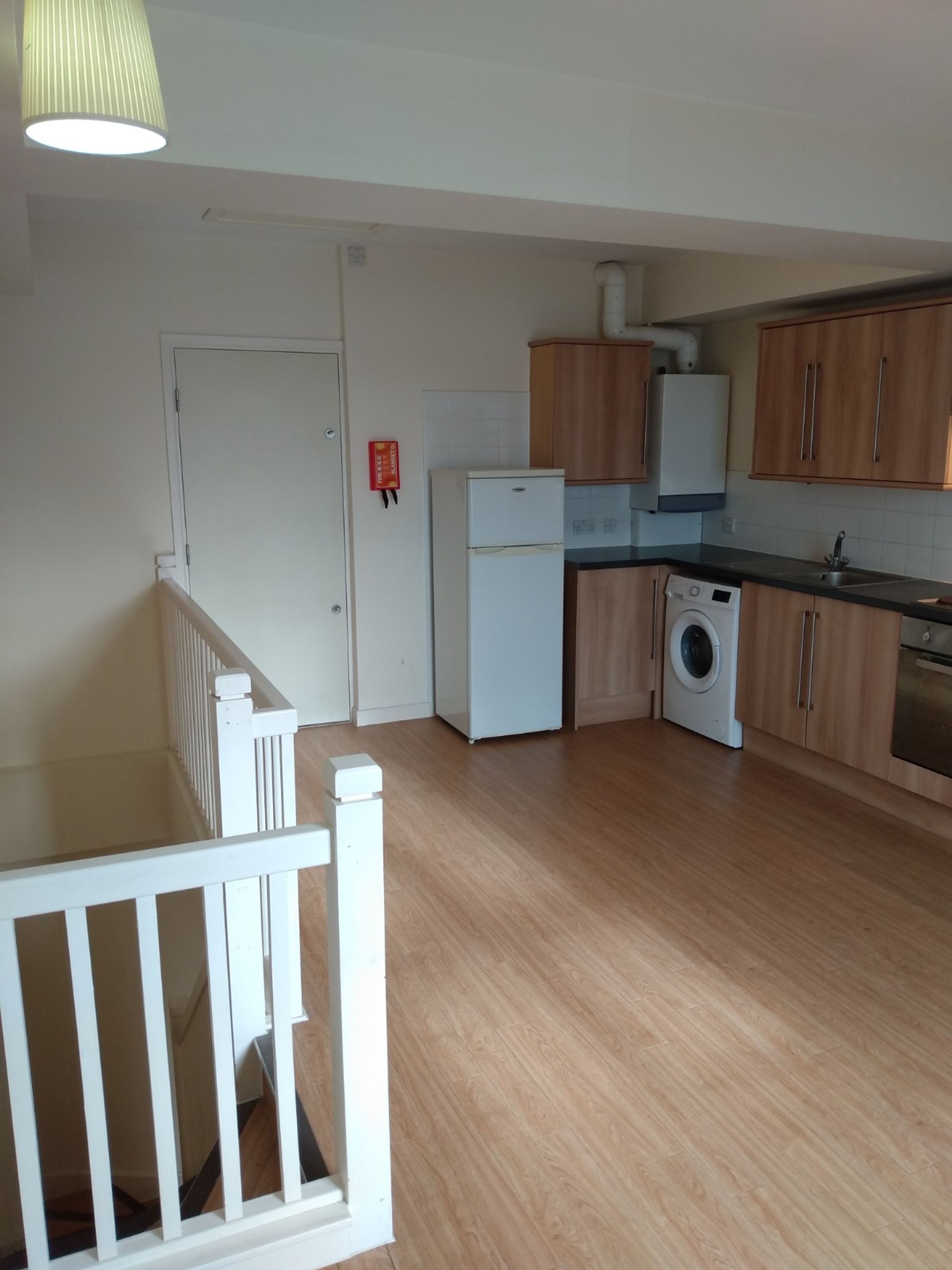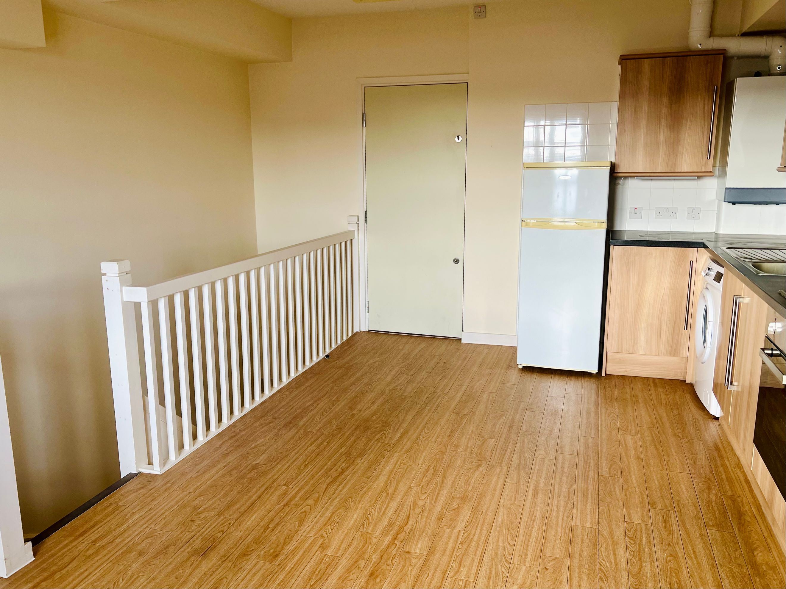 The flat features a modern layout with the bedroom and bathroom (with shower) on the lower floor, and a bright open-plan kitchen and living area on the upper level. The new kitchen is fitted with contemporary units and appliances, and the property benefits from gas central heating throughout.