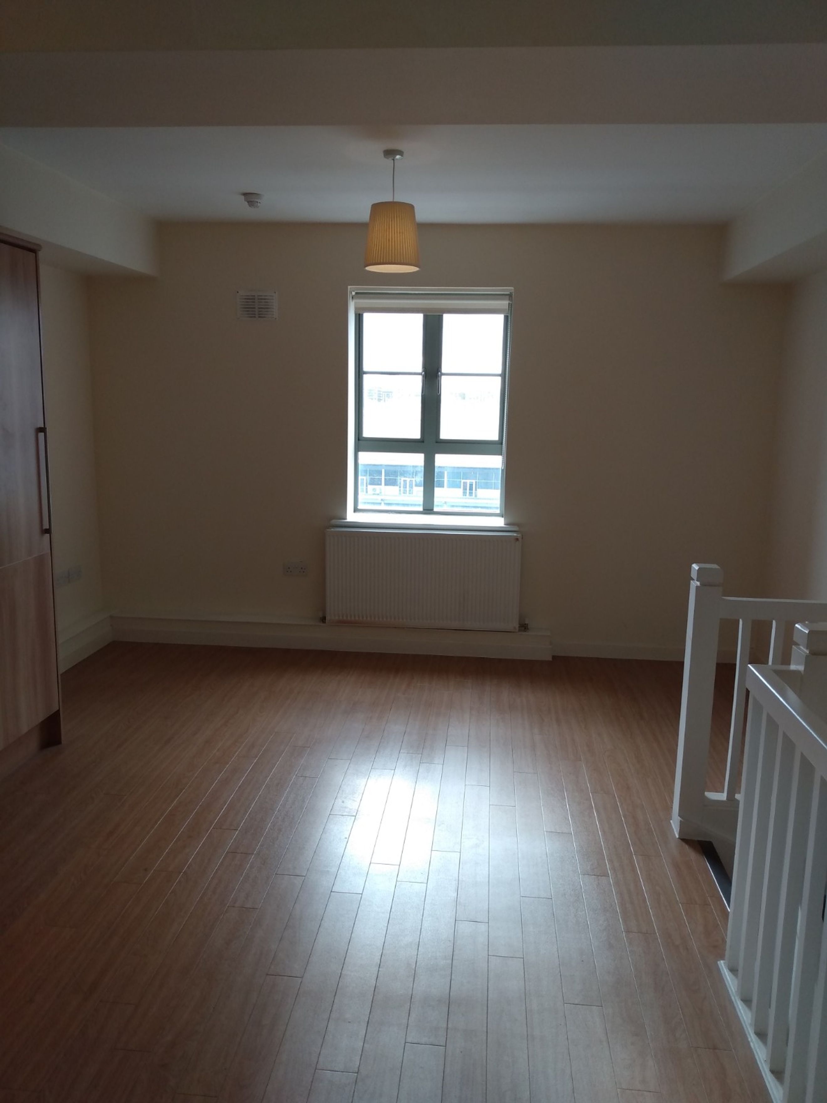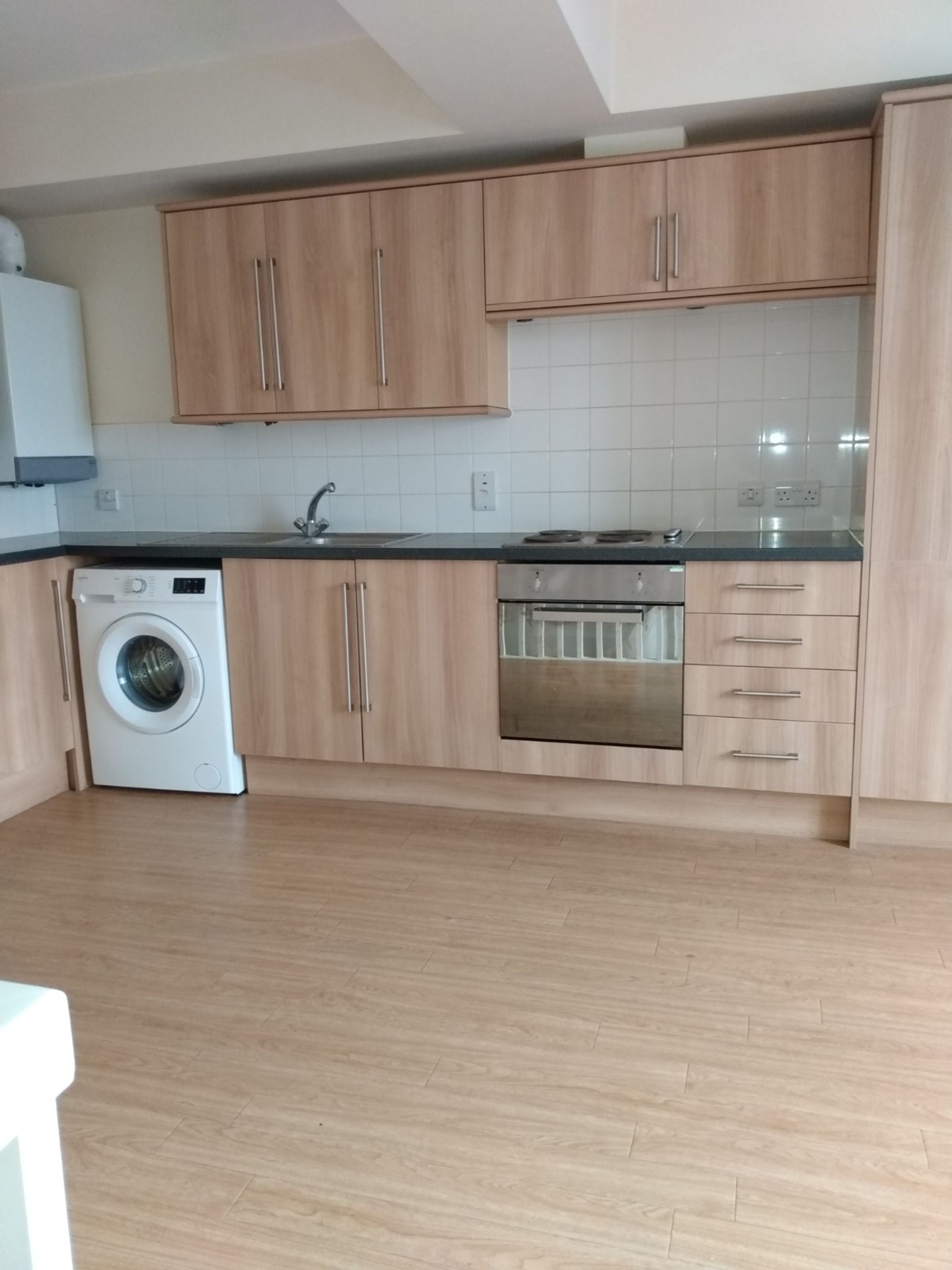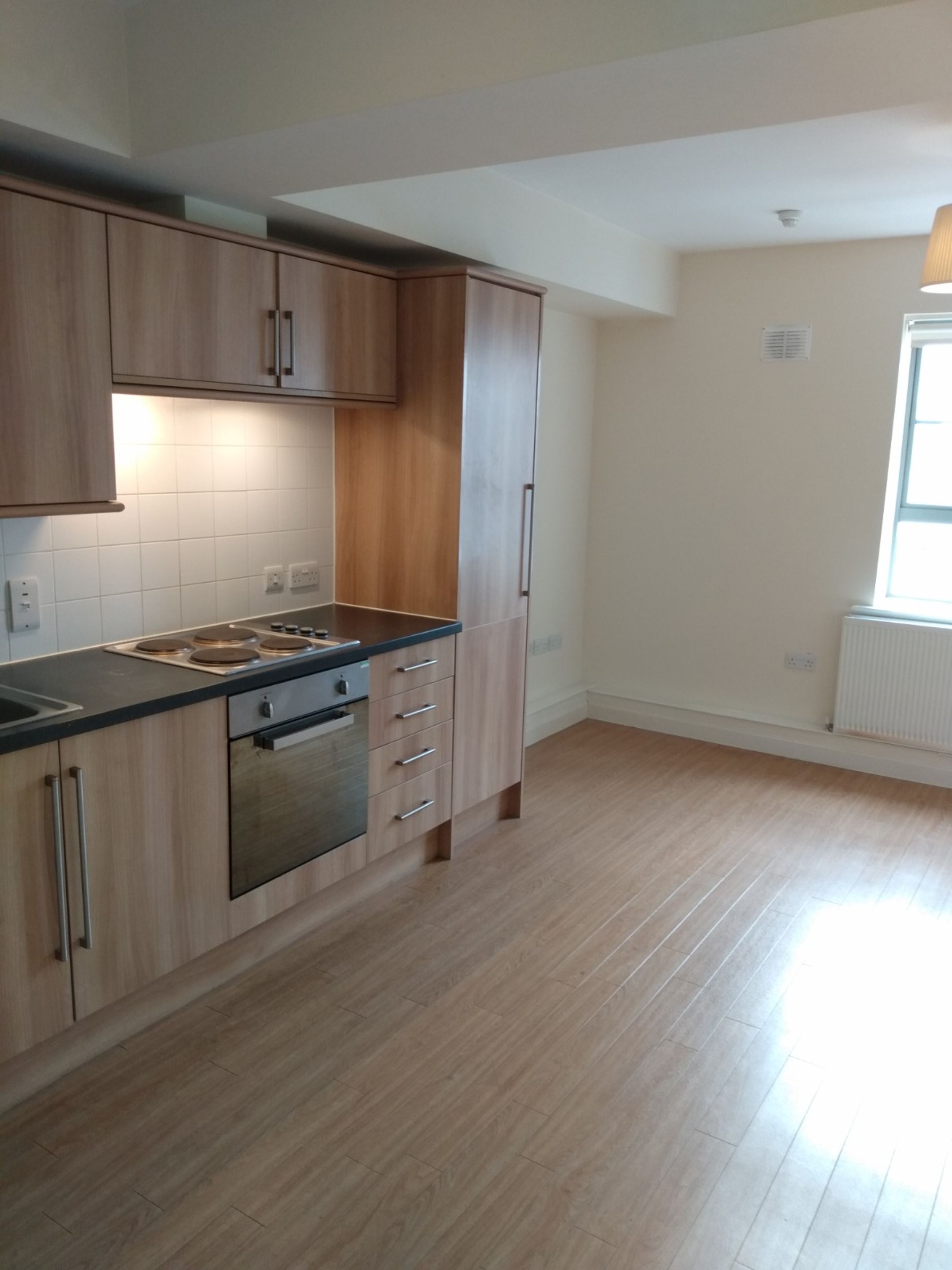 The flat features a modern layout with the bedroom and bathroom (with shower) on the lower floor, and a bright open-plan kitchen and living area on the upper level. The new kitchen is fitted with contemporary units and appliances, and the property benefits from gas central heating throughout.