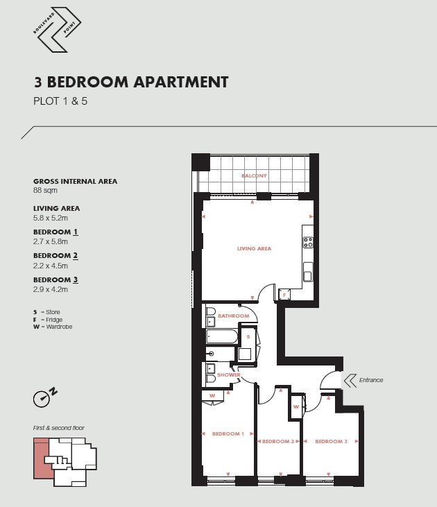 A spacious and luxurious three bedroom, two bathroom brand new apartment circa 947 sqft and located on the first floor. The accommodation comprises entrance hallway leading to a large open plan kitchen/living/dining room with modern fitted kitchen comprising of sandstone base units and grey wall cabinets with a White Caesarstone Snow quartz work surface. Single oven electric fan oven with cooker hood and integrated fridge freezer, dishwasher and washing machine. There are three bedrooms with ensuite shower room to principle bedroom and built in wardrobes in bedroom 1 & 2. There is main bathroom and an enclosed balcony directly off the living room.