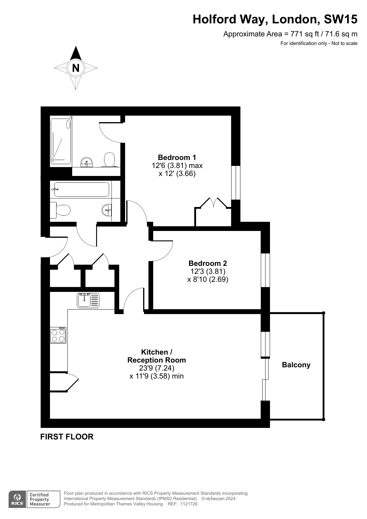 The property on the first floor comprises an entrance hall, a spacious living room with a modern open-plan kitchen, two bedrooms (one en-suite), and a bathroom with a private balcony.