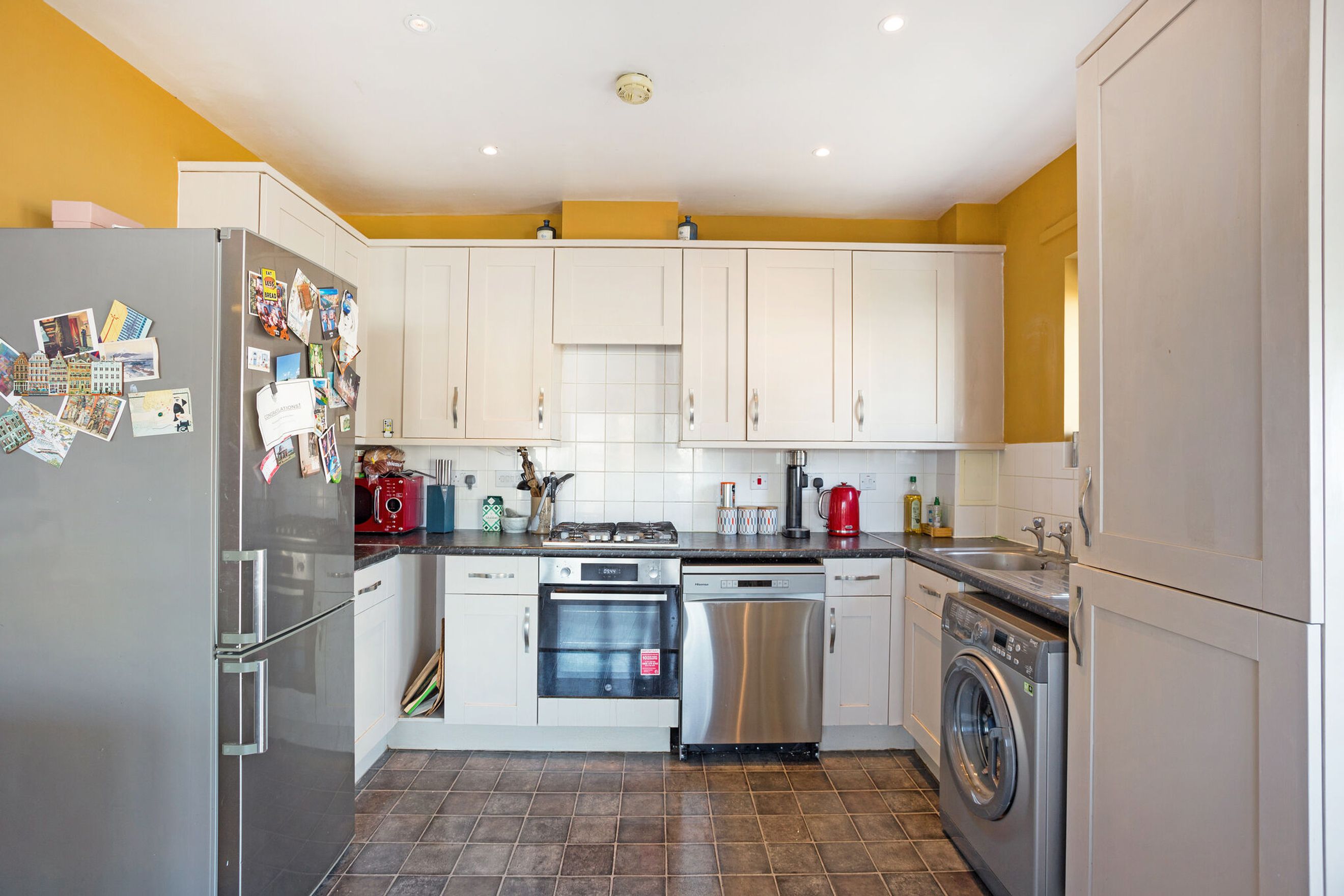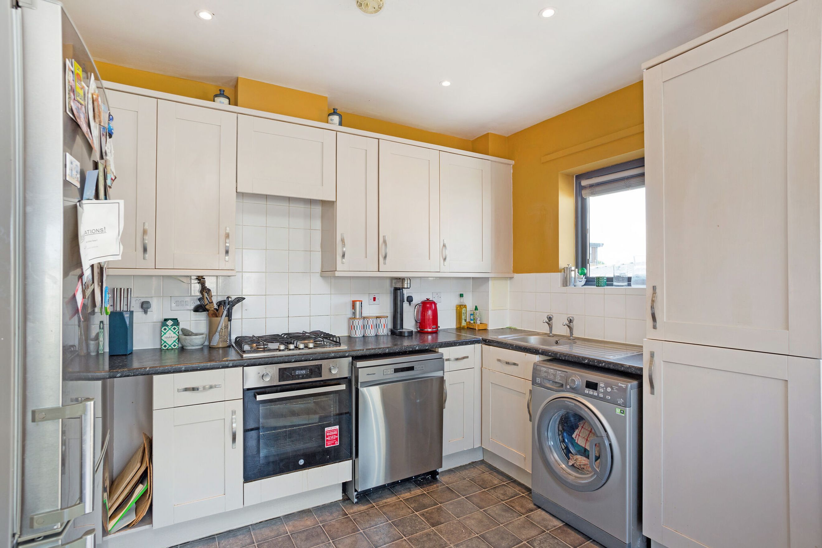 The modern kitchen is well-equipped with integrated appliances including an oven, hob, and extractor fan, making it both functional and stylish.