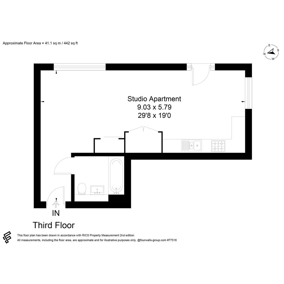 Upon entering your new property, you are greeted with your bathroom featuring a clean white design with black accents on the radiator, taps and showerheads. Moving to the spacious studio area with included storage cupboards for clothes and other items; you'll also find a full fitted and integrated kitchen offering a view of your new surroundings to your left. Given the spacious studio area, you will have enough space to fit all of your living essentials with freedom and space to move around.