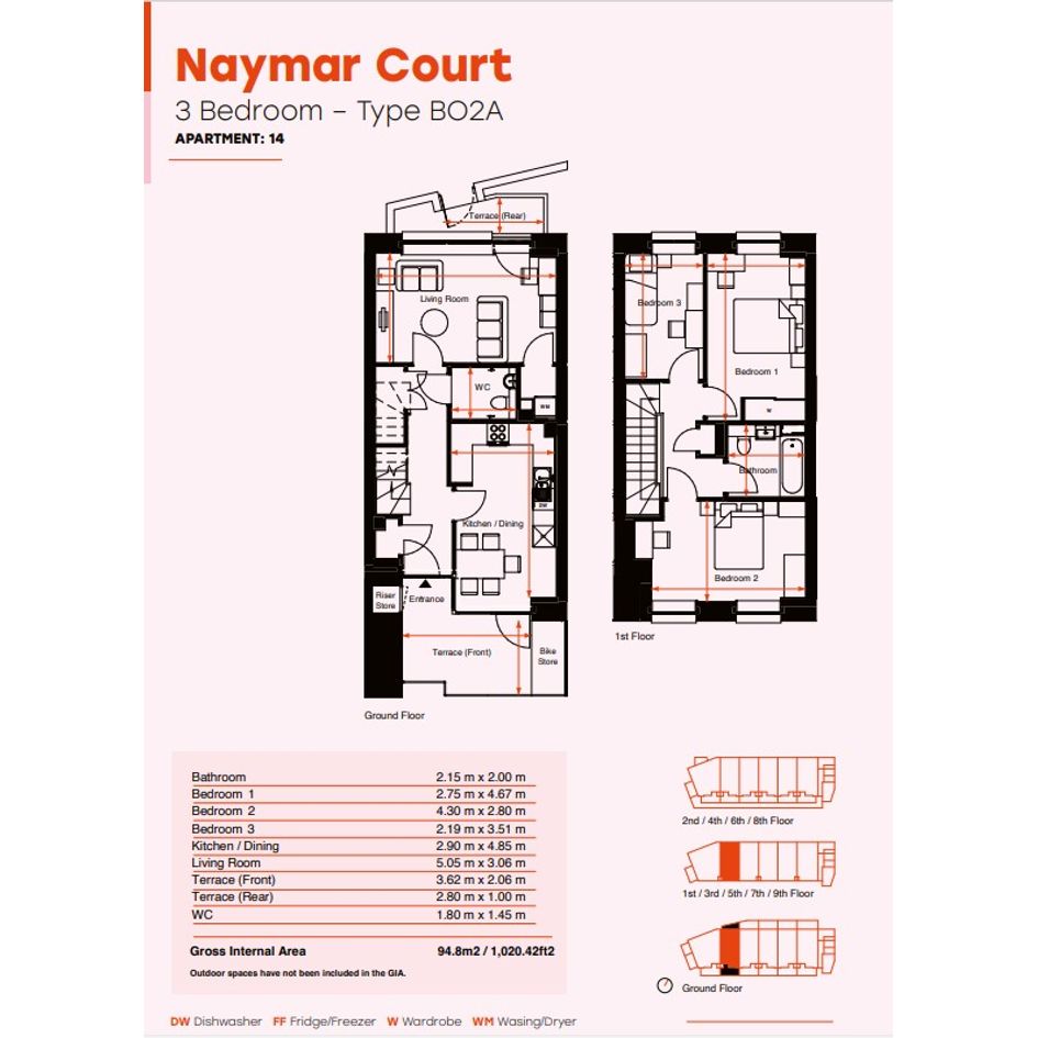 This outstanding three bedroom, duplex apartment offers spacious living and dining areas featuring premium flooring and kitchen colour in on-trend indigo and white. Chic floor-to-ceiling windows provide plenty of light to the open plan design. This duplex apartment offers two outdoor terraces to the front and back of the property, plus cycle storage. Upstairs the bedrooms include plush grey wool-mix carpets, and a stylish sliding wardrobe in the main bedroom. The bathroom is also designed to a high standard, there is also an additional WC and basin on the ground floor.