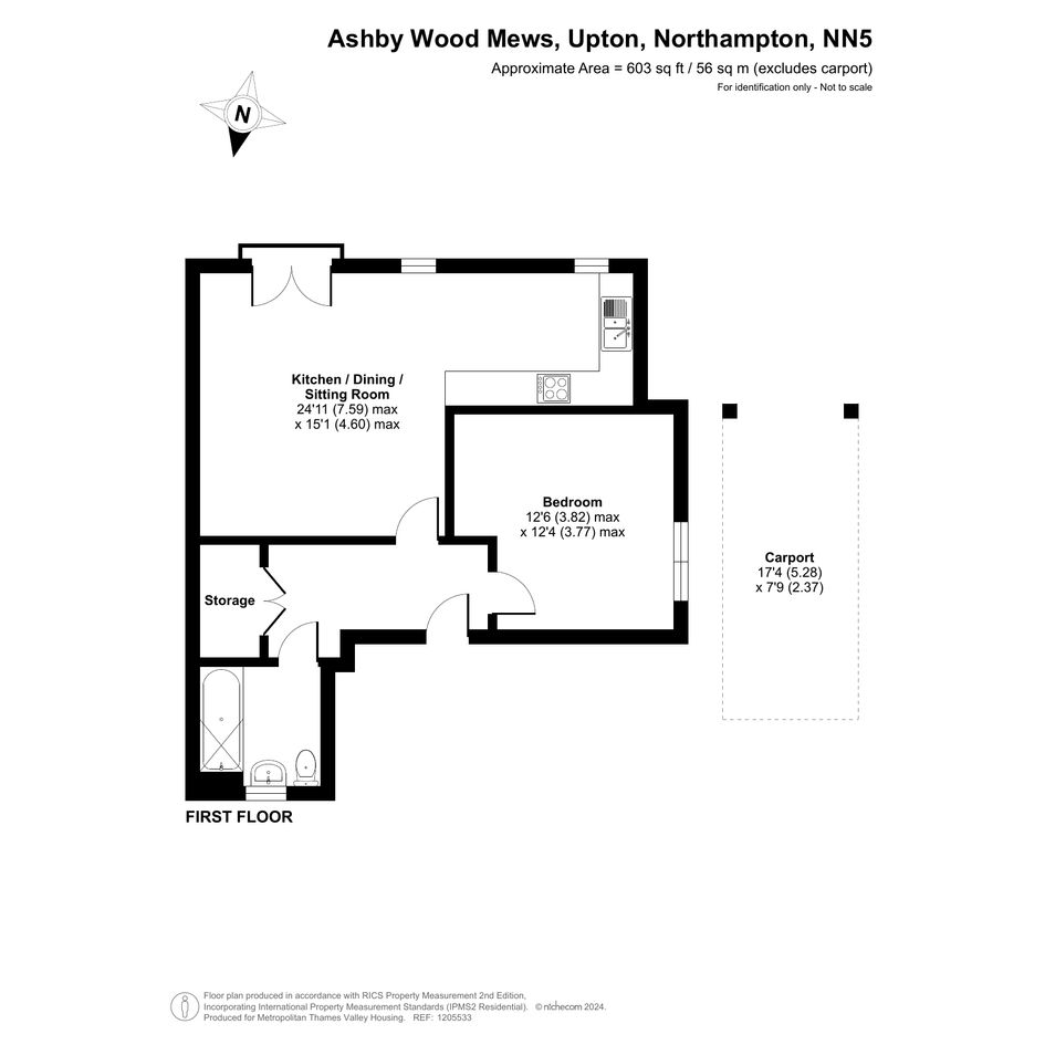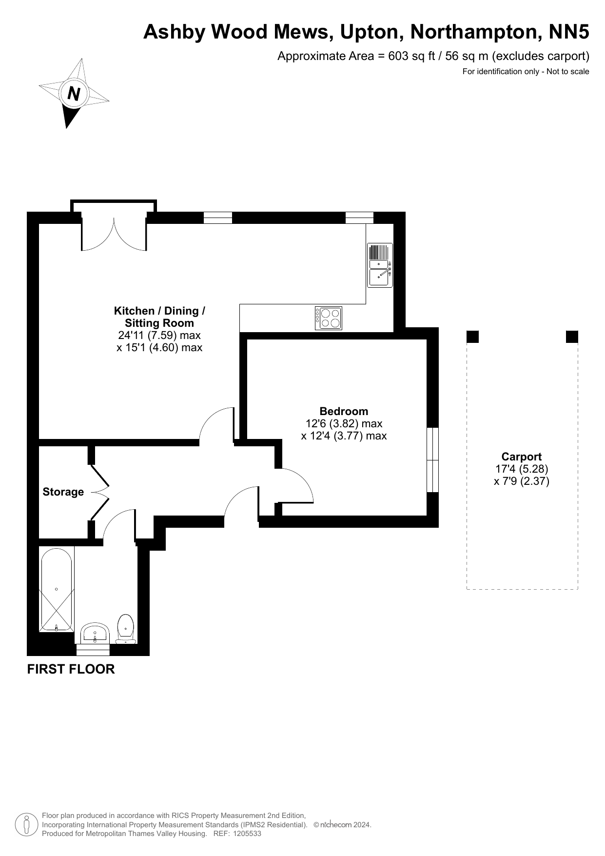 The property on the first floor was built in circa 2021 and comprises an entrance hall, a living room with a modern open-plan kitchen, one large bedroom and a bathroom.