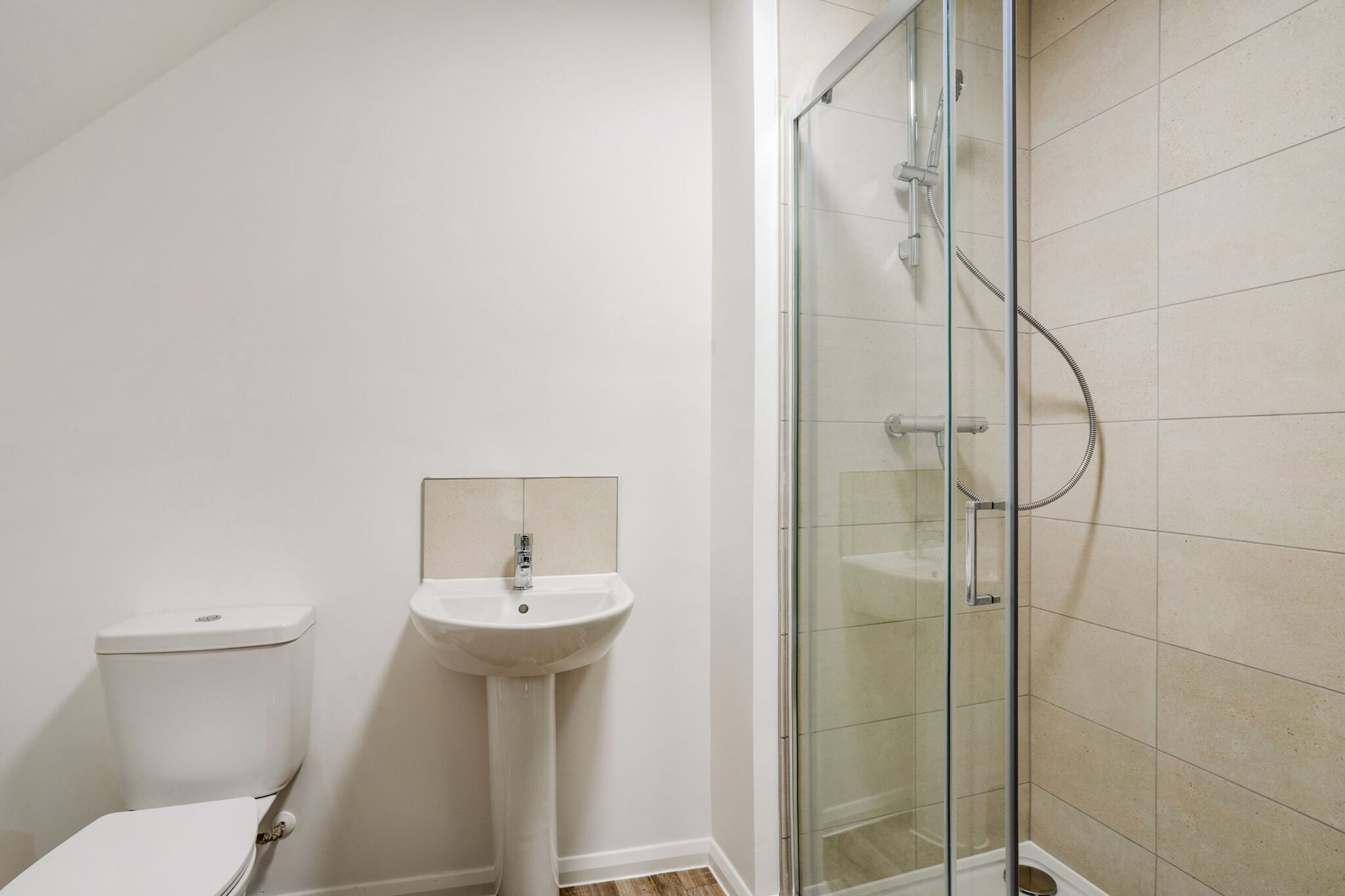 On the first floor, there are three bedrooms with a wardrobe to the master. The bathroom has a modern, white suite. Upstairs, there is an additional bedroom with a bay window and shower room.