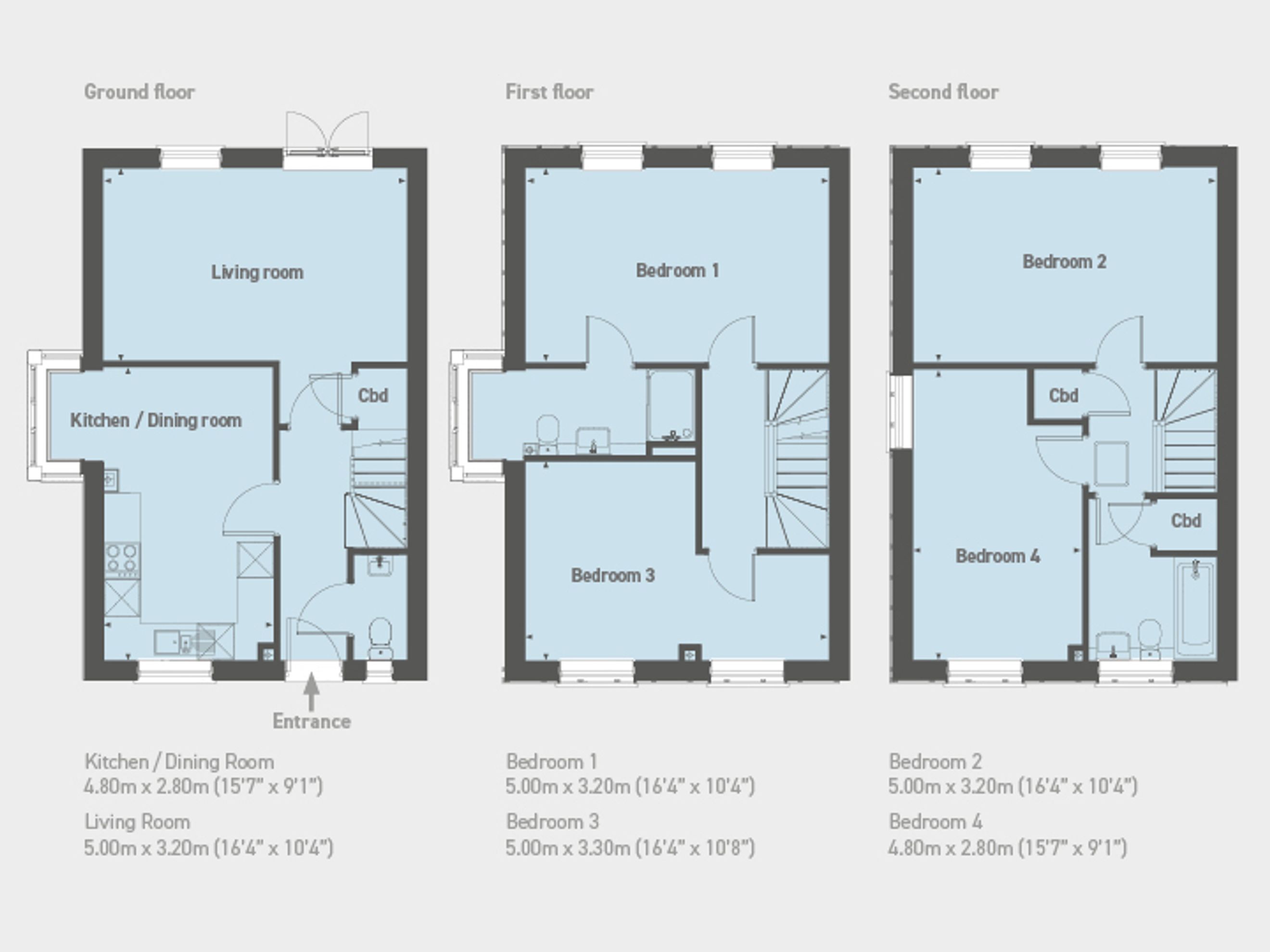 Each house type offers a spacious separate kitchen/dining room on the ground floor together with a useful cloakroom with WC and handbasin and a large living room with doors opening on to the rear garden. All homes whether two, three or four bedroom, benefits from allocated off-street parking.
