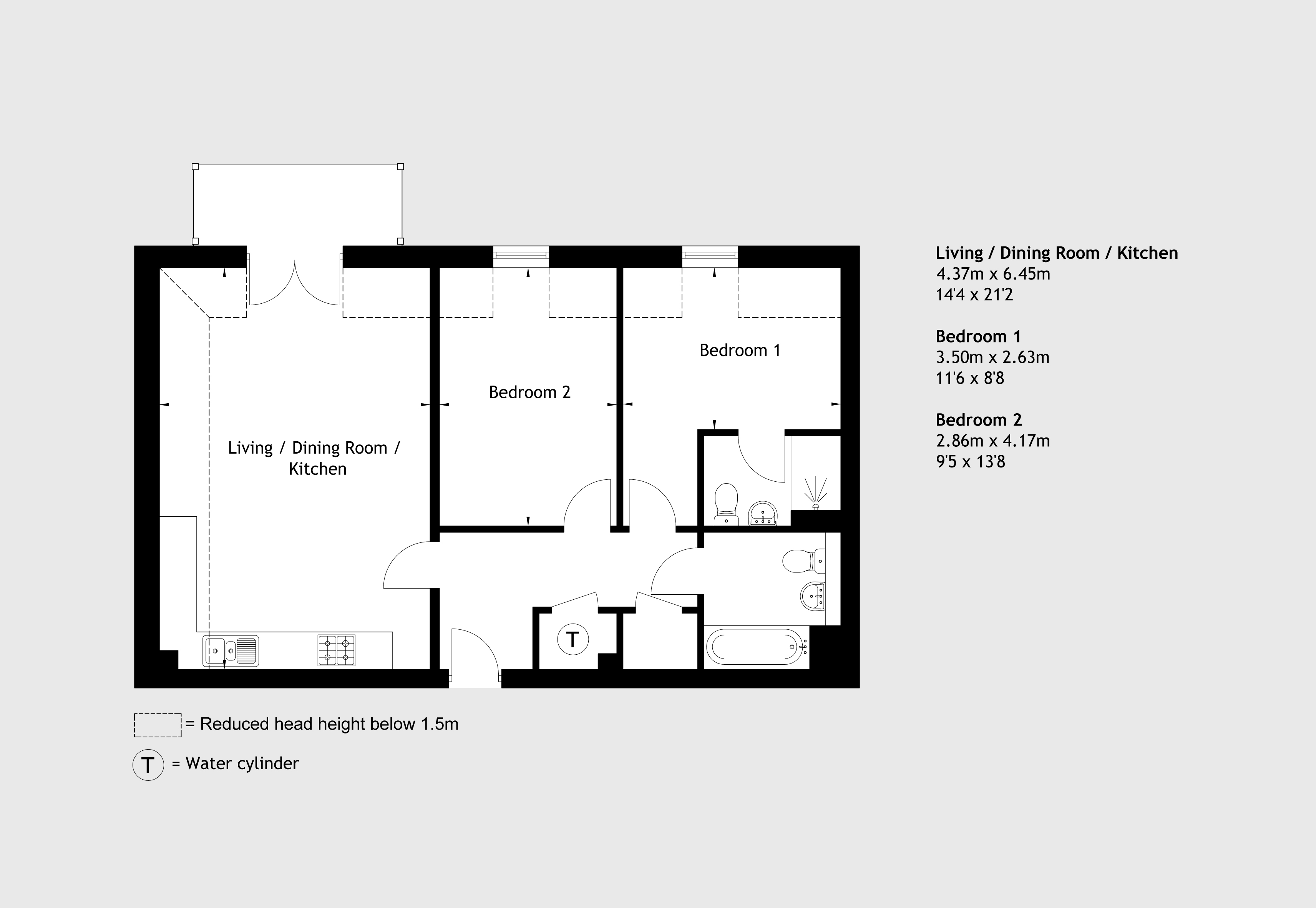 Featuring a spacious, open-plan living area with doors leading to a balcony. The kitchen is fitted with an oven, hob and extractor fan.
