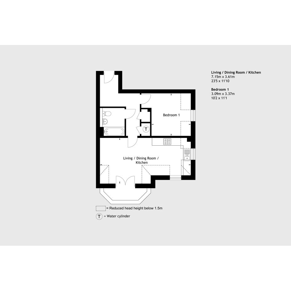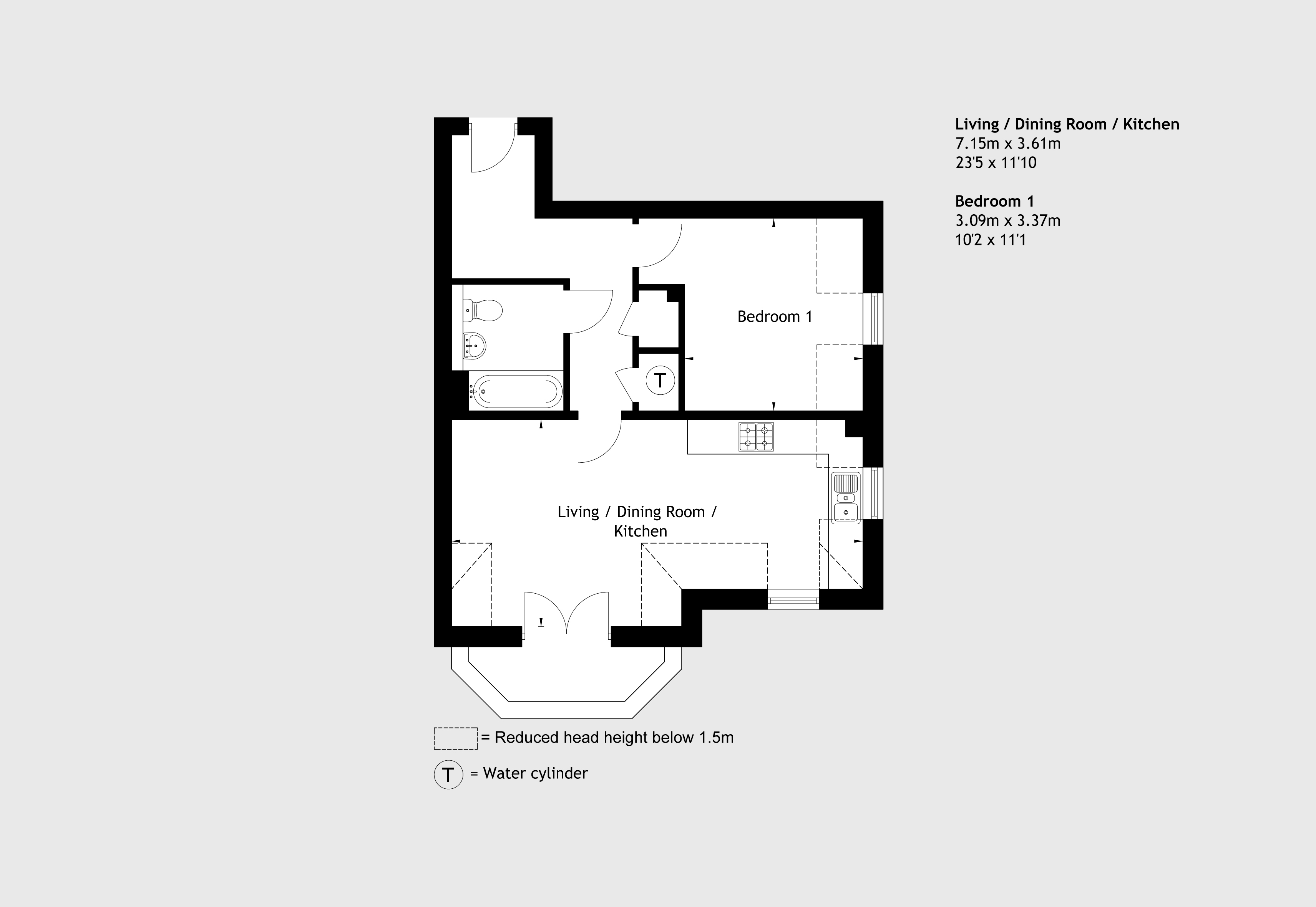 Featuring a spacious, open-plan living area with doors leading out to a picturesque bay balcony. The kitchen is fitted with an oven, hob and extractor fan.