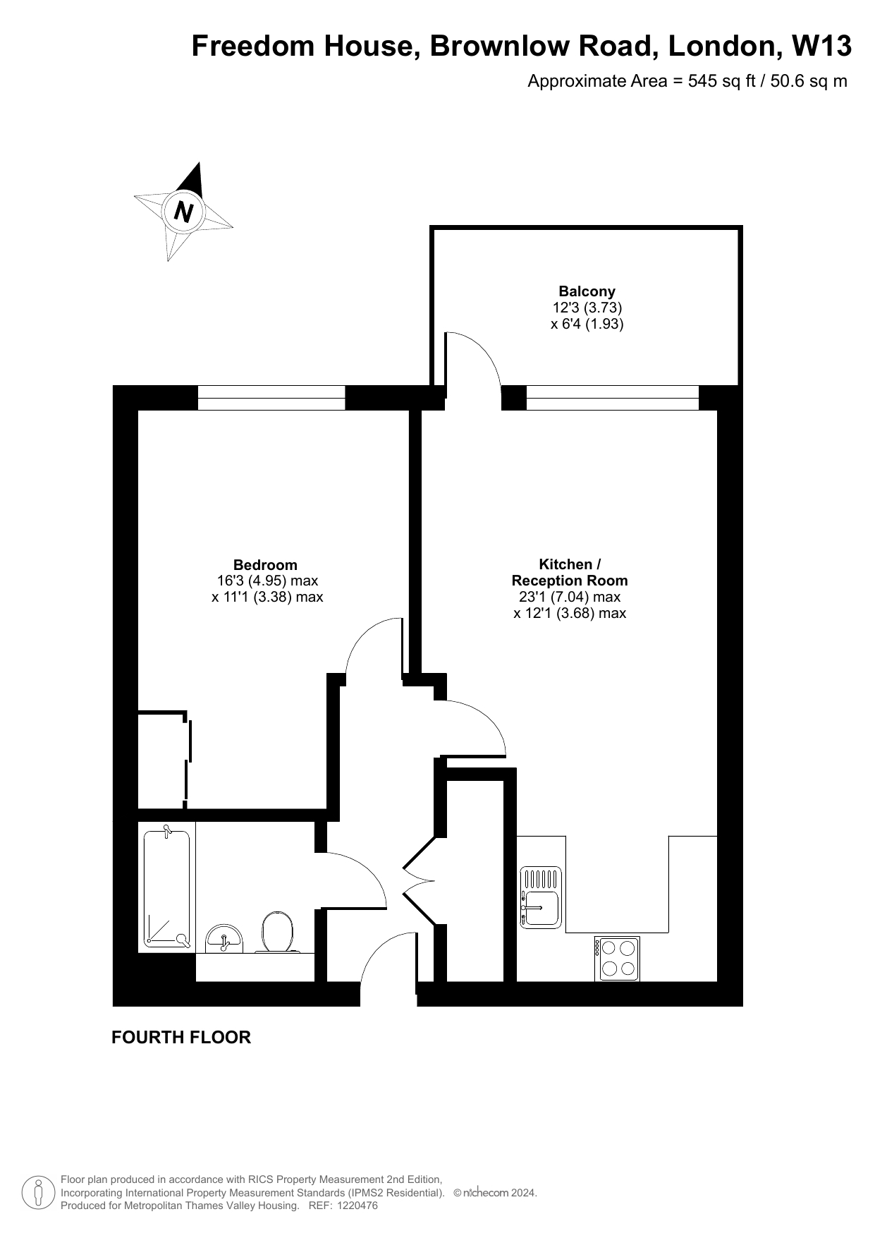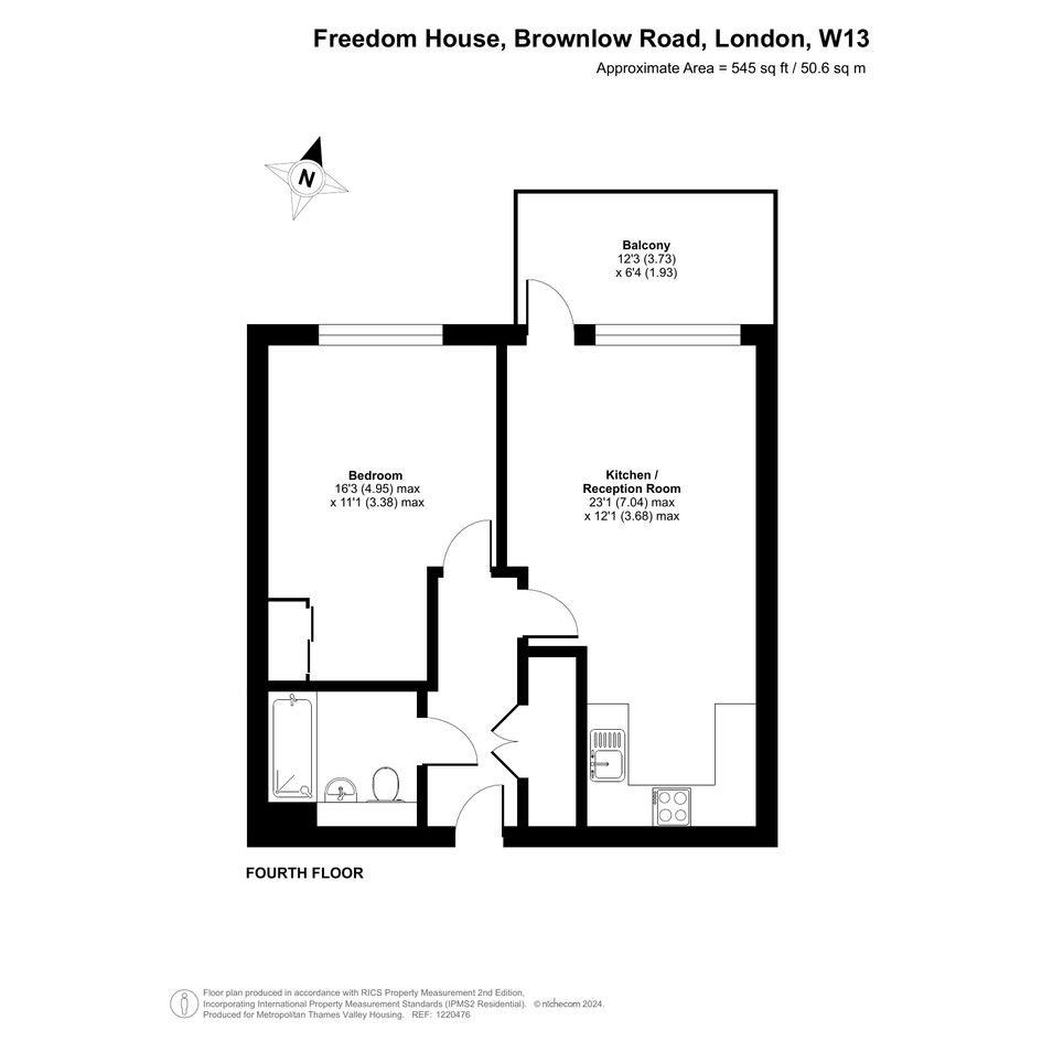 The property sits on the fourth floor and comprises a wide living room with a private balcony, an open-plan fitted kitchen, a bedroom, and a bathroom.