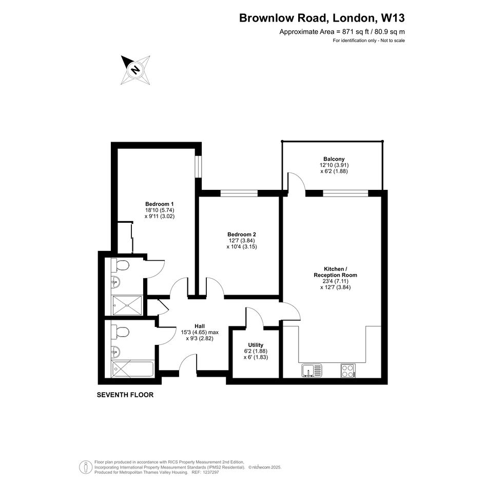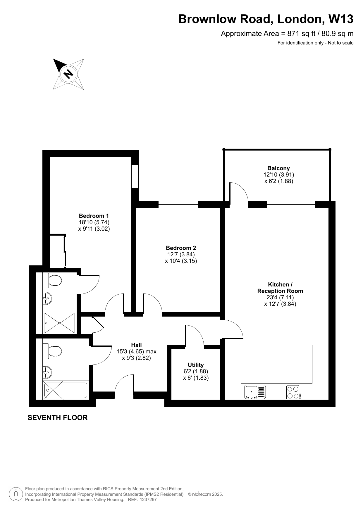 The property sits on the seventh floor and comprises a wide living room with a private balcony, an open-plan fitted kitchen, an ensuite bedroom, a smaller one, and a shared bathroom.