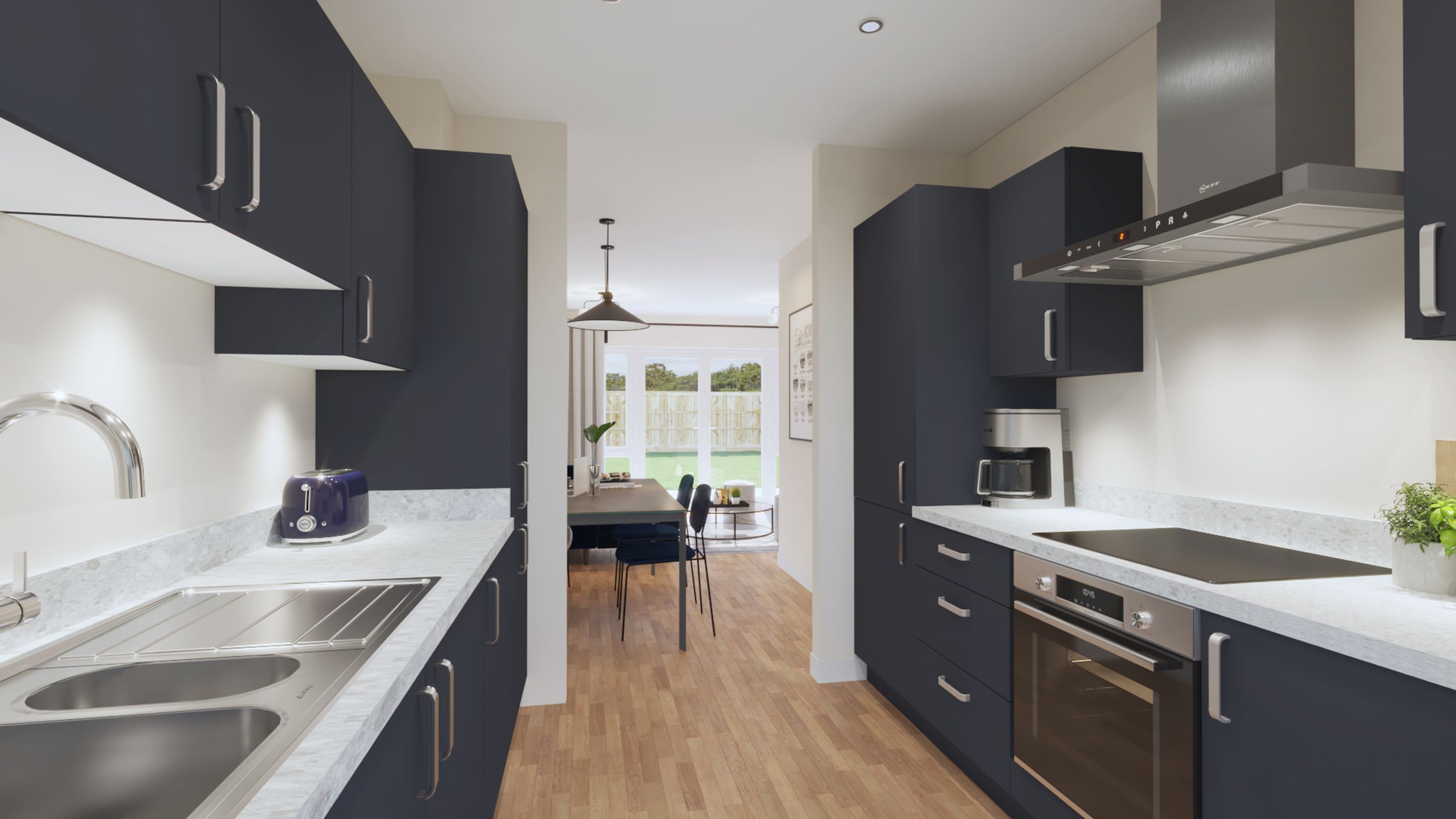 On the ground floor, a welcoming hallway leads to a spacious WC and into the heart of the home — a bright and airy open-plan kitchen, living and dining area. Designed for modern lifestyles, this versatile space is perfect for everyday living, family time and entertaining. Patio doors open directly onto the private rear garden, allowing natural light to flood in and creating a seamless connection between indoor and outdoor living.