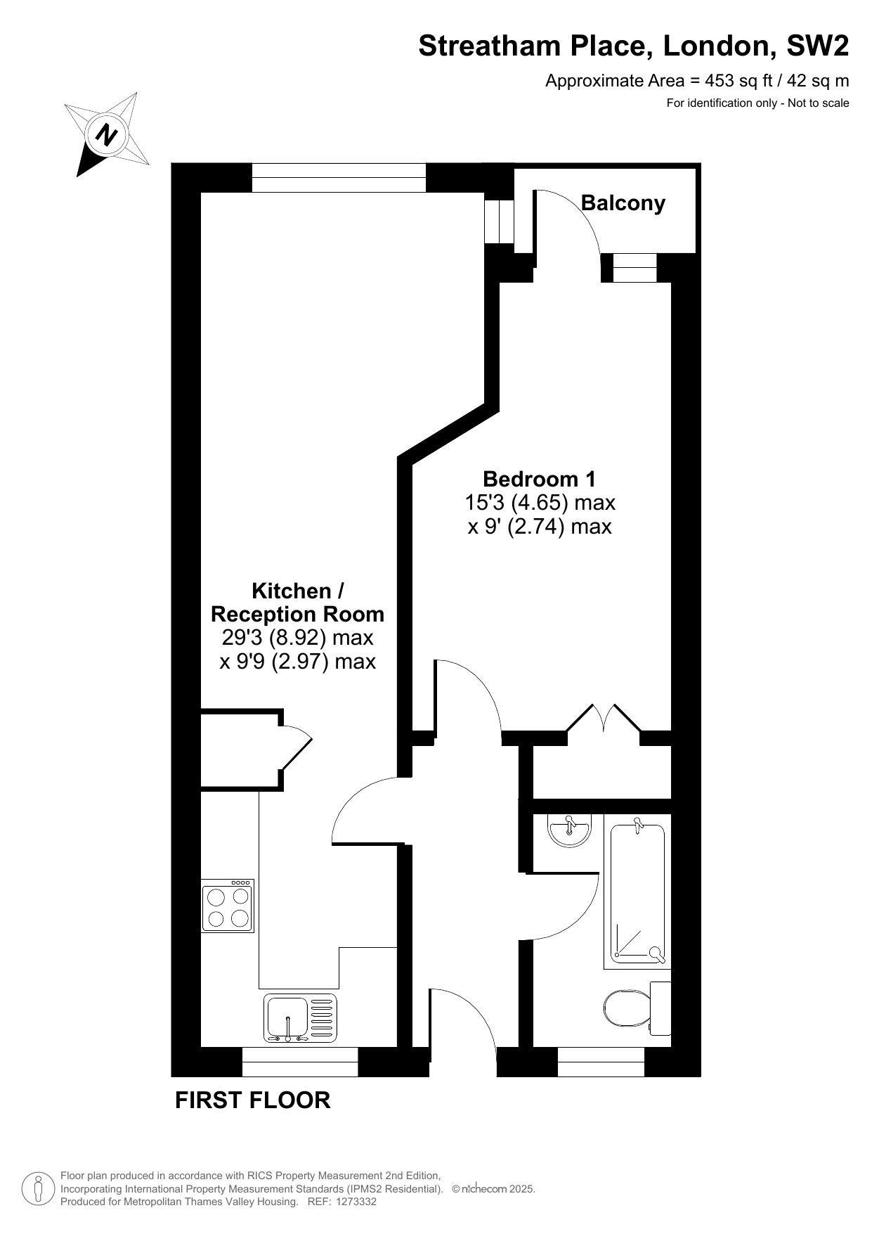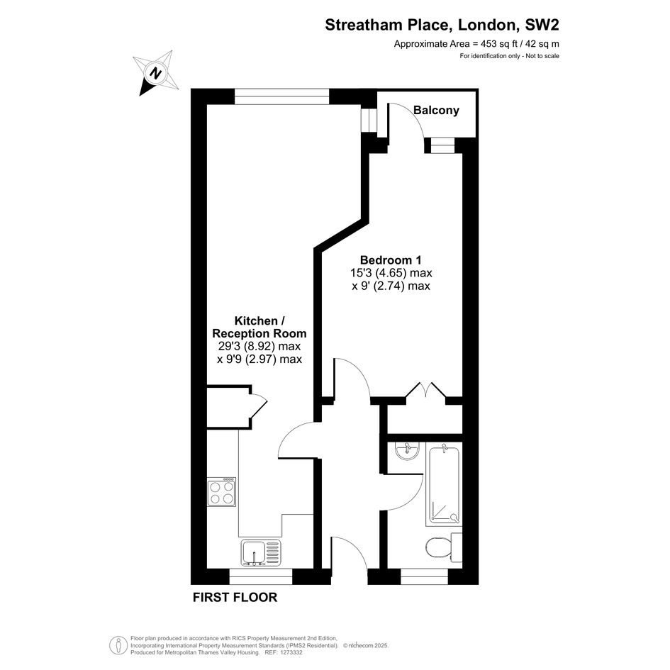 The first-floor property comprises an entrance with storage, a living room with a fitted kitchen, a large bedroom, and a bathroom.