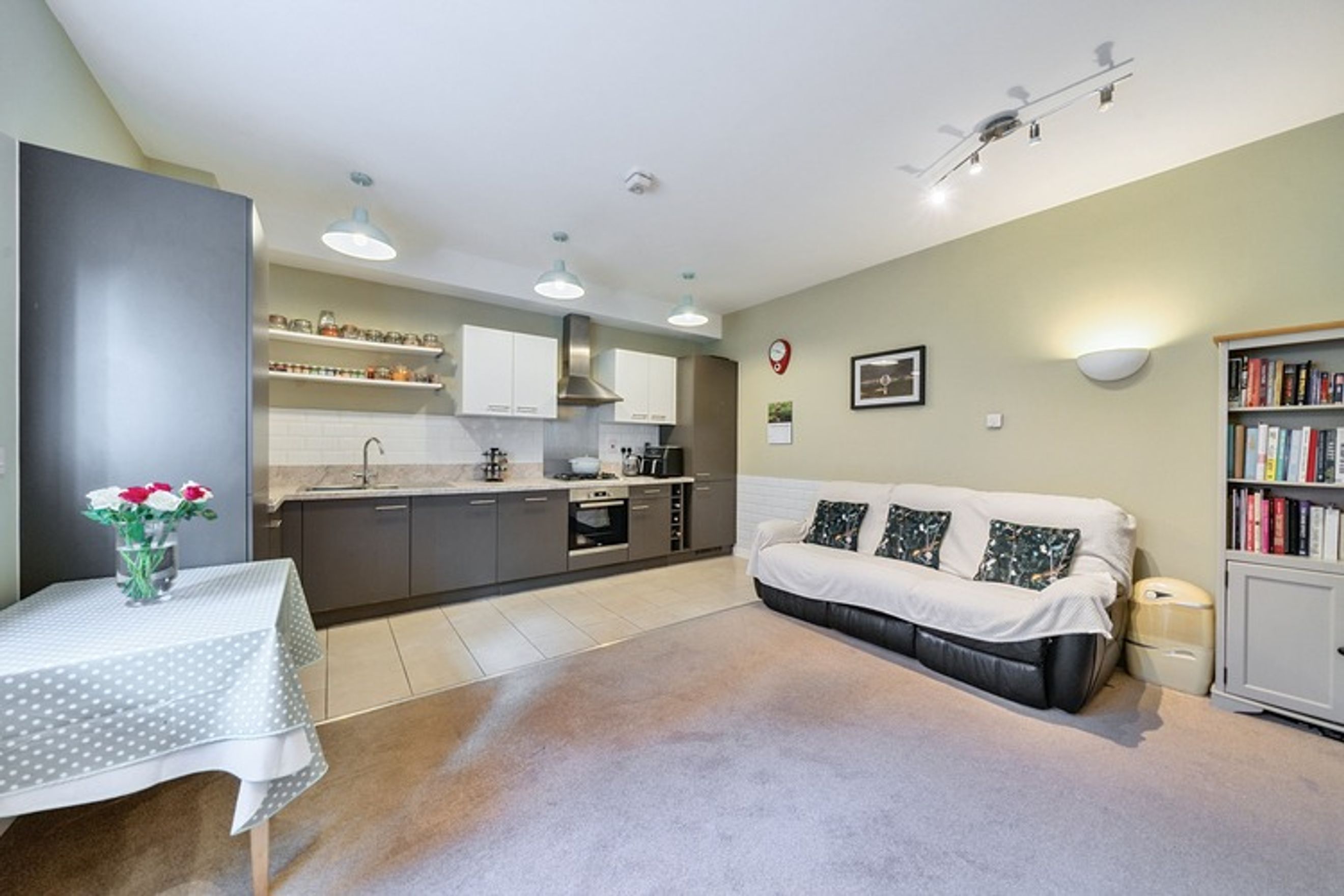 The ground-floor property is set in a well-maintained development. This bright, airy apartment offers a spacious, open-plan living area, boasting a modern kitchen, a generous double bedroom with built-in storage, and a sleek contemporary bathroom. High ceilings throughout the property.
