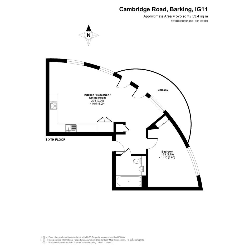 The property is on the sixth floor and comprises a wide living room, an open-plan kitchen, a bedroom and a bathroom. There's also a large private balcony surrounding the flat.