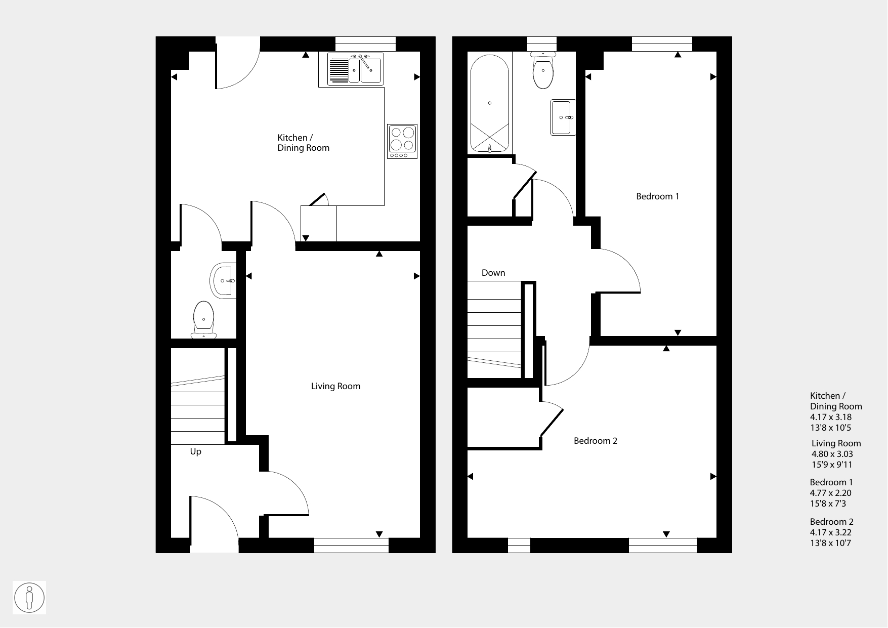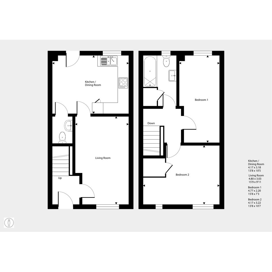 Upstairs, there are two comfortable bedrooms. The bathroom has a modern, white suite.