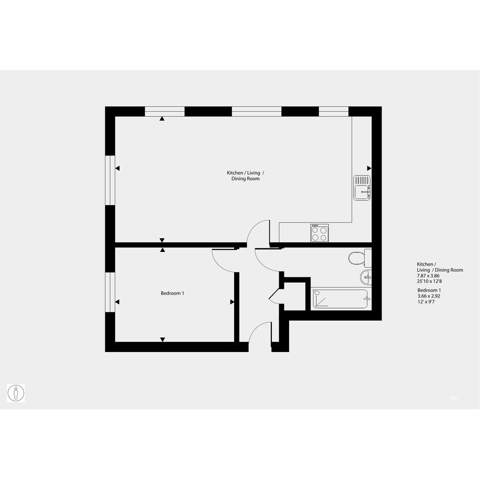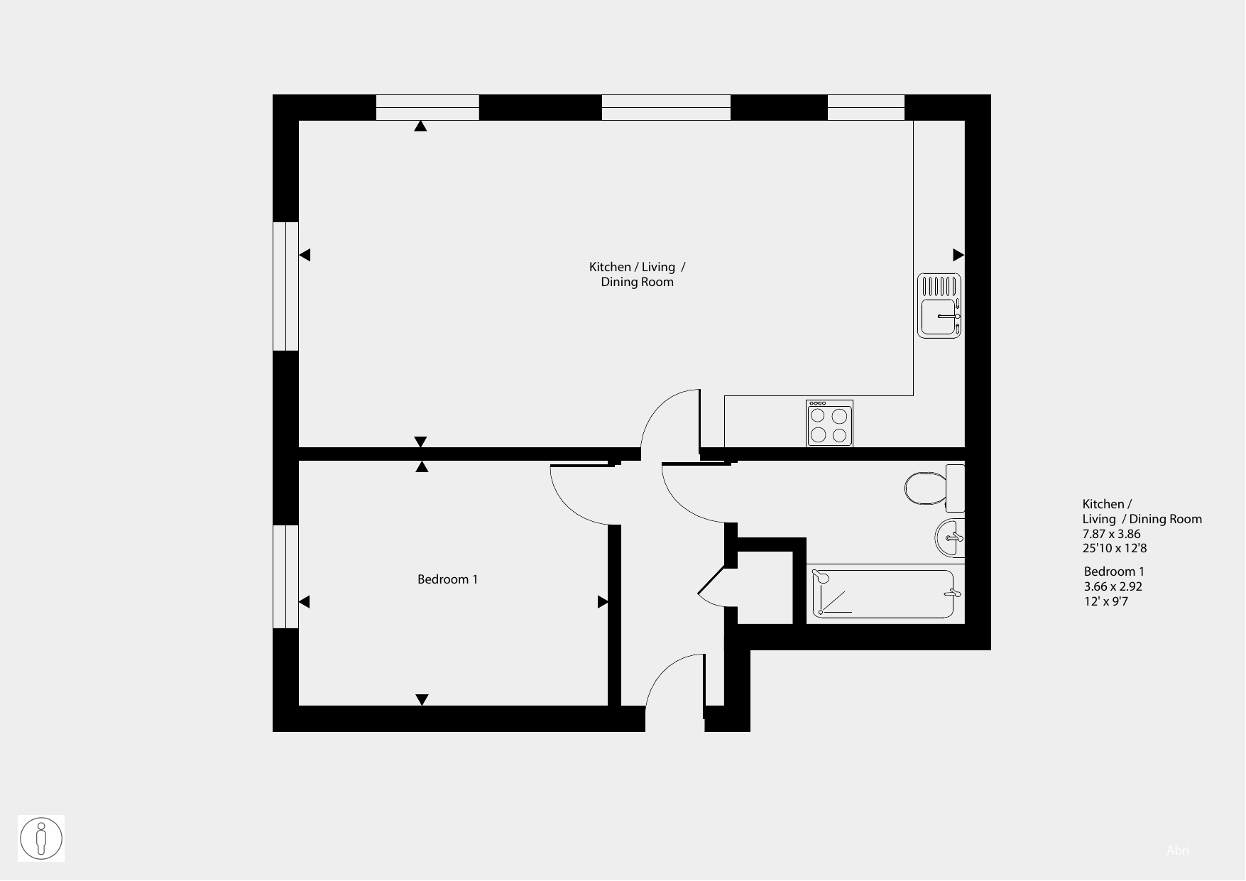 Featuring a spacious open-plan living area with dual-aspect windows. The kitchen is fitted with an oven, gas hob and hood. The bedroom is a spacious double. The bathroom has a modern, white suite.