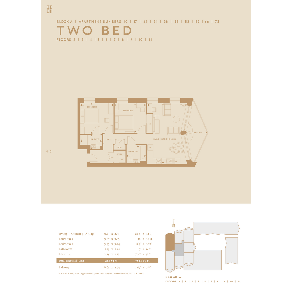 This two bedroom home in the Icon development is the very best in luxe urban living, with high-end but understated contemporary design that leaves you scope to make your own mark. Open-plan living space, ideal for relaxing or entertaining alike, feature soft tones, high-quality flooring, recessed spotlights and built-in media and data points. The kitchen has contemporary units in shades of white or grey, soft-close doors and drawers, stone/concrete effect worktops and brushed-steel-finish integrated appliances that include fan oven, extractor fan, ceramic hob, fridge-freezer and dishwasher. A washer-drier comes as standard, cleverly concealed in a hall cupboard.