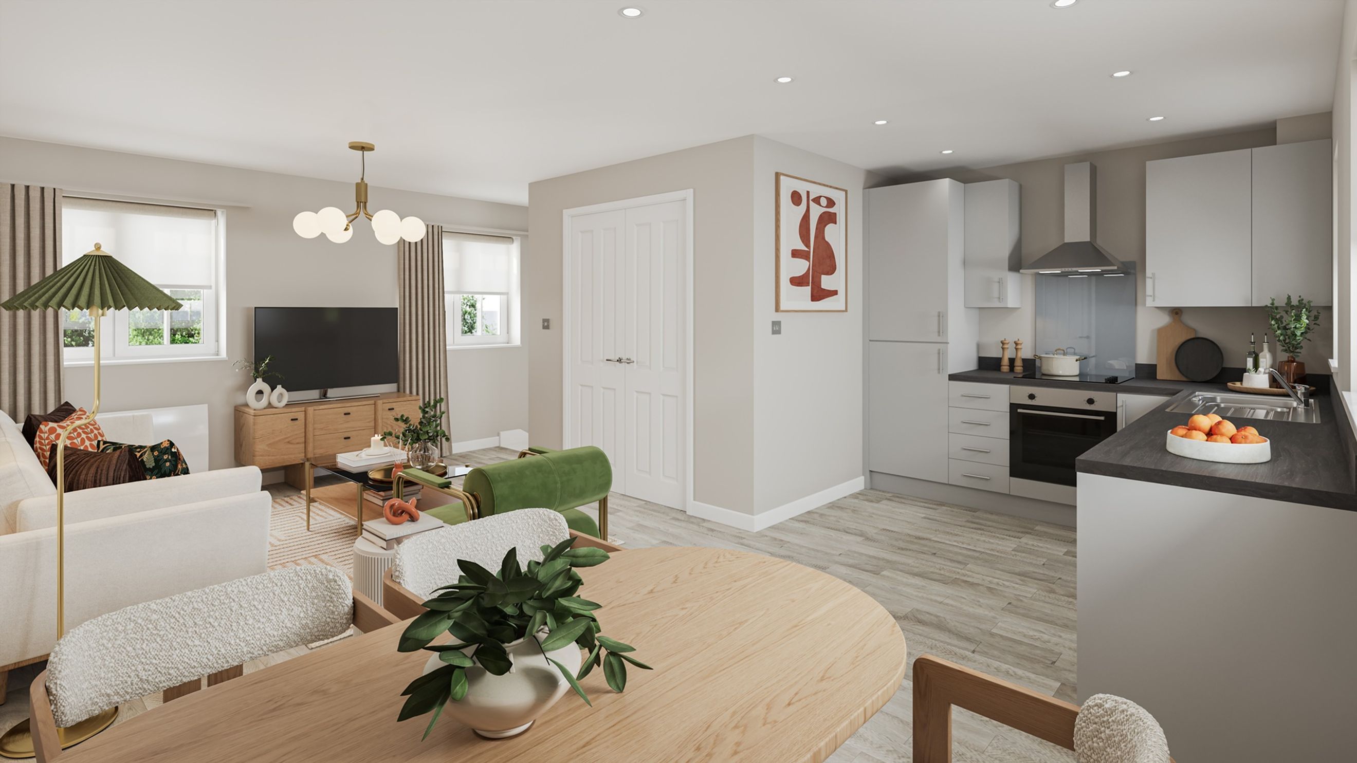 - Modern open-plan layout with integrated kitchen appliances