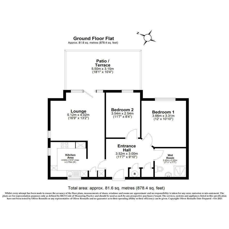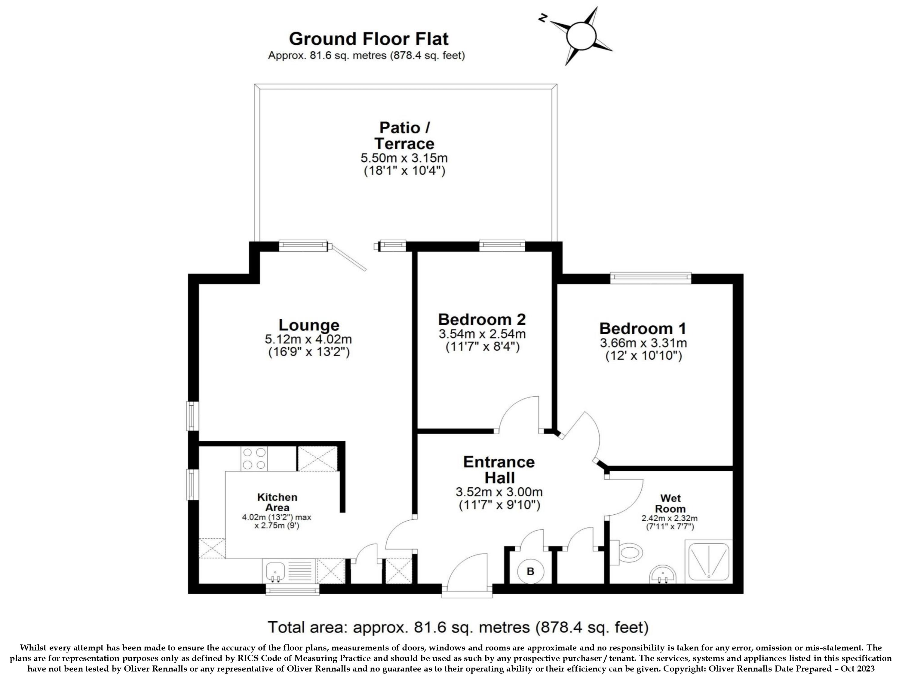 Entrance: Hallway with storage cupboard. Carpeted flooring. Living room: Spacious living area with floor-to-ceiling windows and direct access to the terrace. Carpeted flooring. Kitchen: Mahogany units with black worktop and stainless-steel splashback. Mix of integrated and freestanding appliances. Bedroom 1 & 2 : Double bedroom with carpeted flooring. Bathroom: White suite with shower over bath. Partially tiled. Outside: Spacious terrace, communal garden.