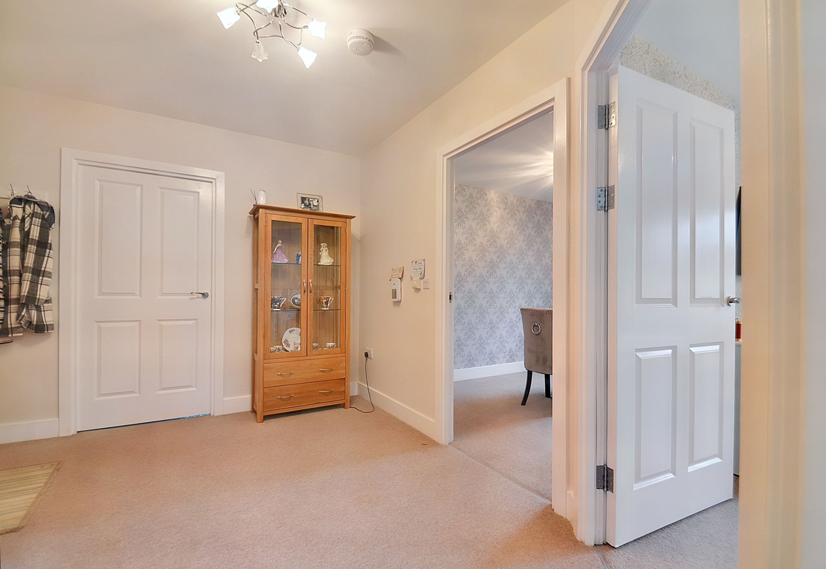 Entrance: Hallway with storage cupboard. Carpeted flooring.