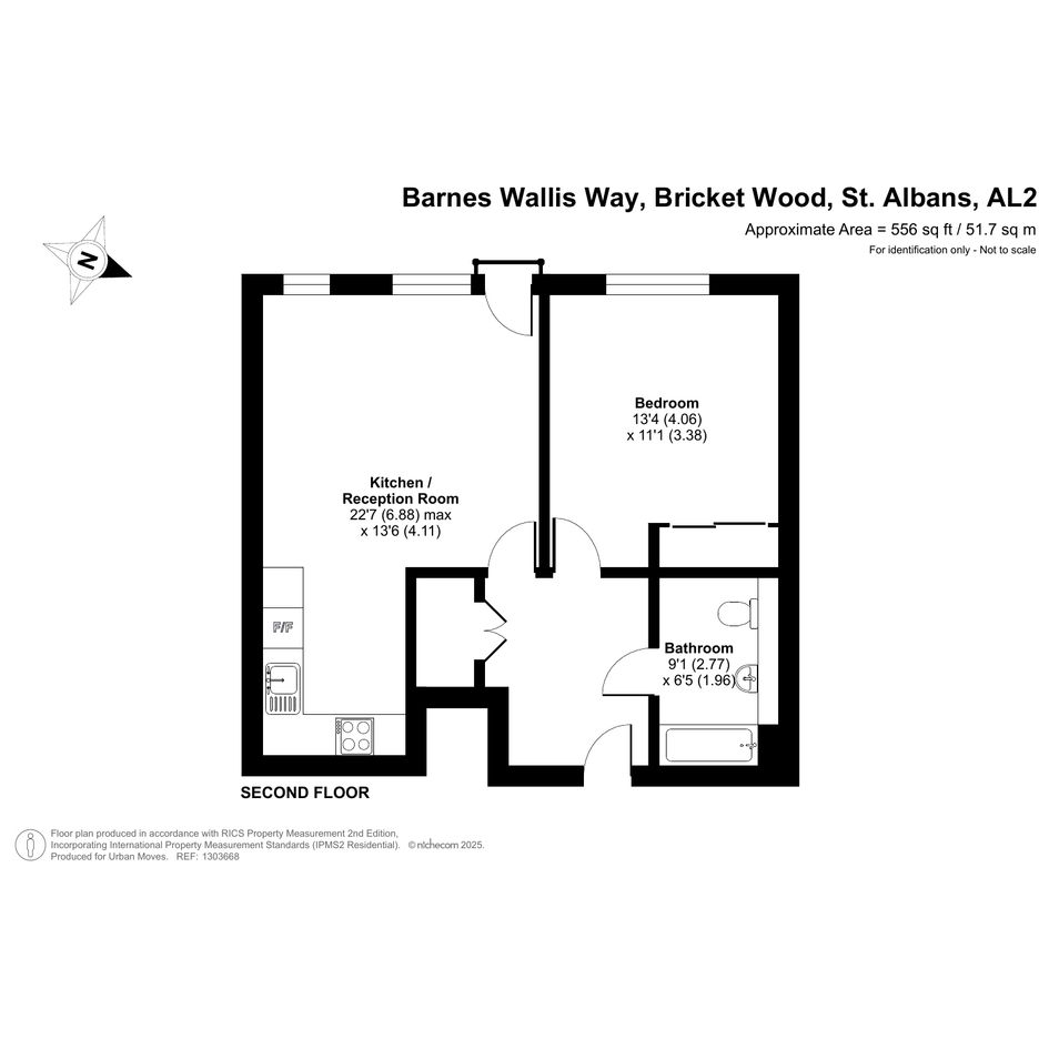 A well-presented and well-proportioned flat on the top (second) floor. The property is west/south-west-facing and has a Juliette balcony which provides a very pleasant view of the large communal rear garden. The reception room is semi-open-plan to a smart modern kitchen with integrated appliances and induction hob. There is a bedroom with fitted, mirror-fronted wardrobe, a spacious bathroom and a hallway storage/utility cupboard. Waddington House is a modern development and the insulation standards, high performance glazing and gas central heating system make for a very good energy-efficiency rating. The flat comes with use of an allocated parking space and the location allows convenient access to the North Orbital Road, the M1 and the M25. Alternatively, Bricket Wood Railway Station is within comfortable walking distance or a brief cycle ride.