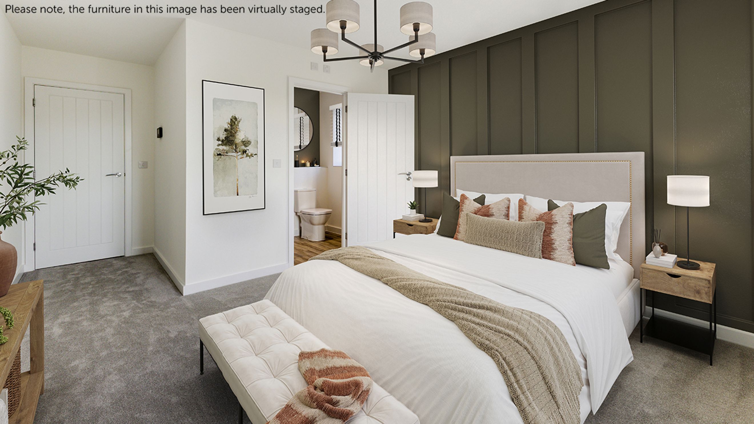 Upstairs, there are four bedrooms with an ensuite to the master. And a bathroom which has a modern, white suite. Outside, you'll have your own turfed garden, garage and parking.