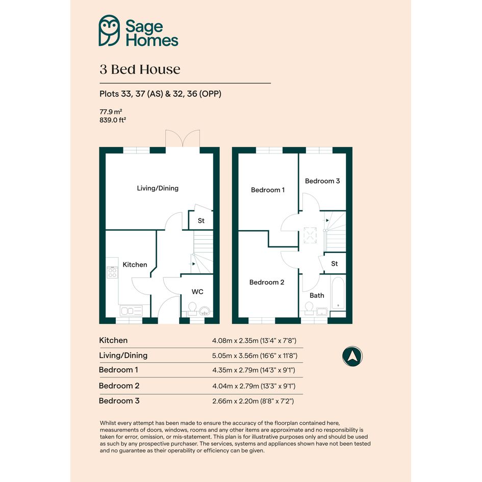 This is a modern two-storey, three-bedroom home designed by Sage Homes. The ground floor features a well-proportioned kitchen, a spacious open-plan living and dining area, a WC, and a storage cupboard. Upstairs, the first floor includes three bedrooms, two generously sized doubles and a smaller third bedroom, along with a family bathroom and additional storage.