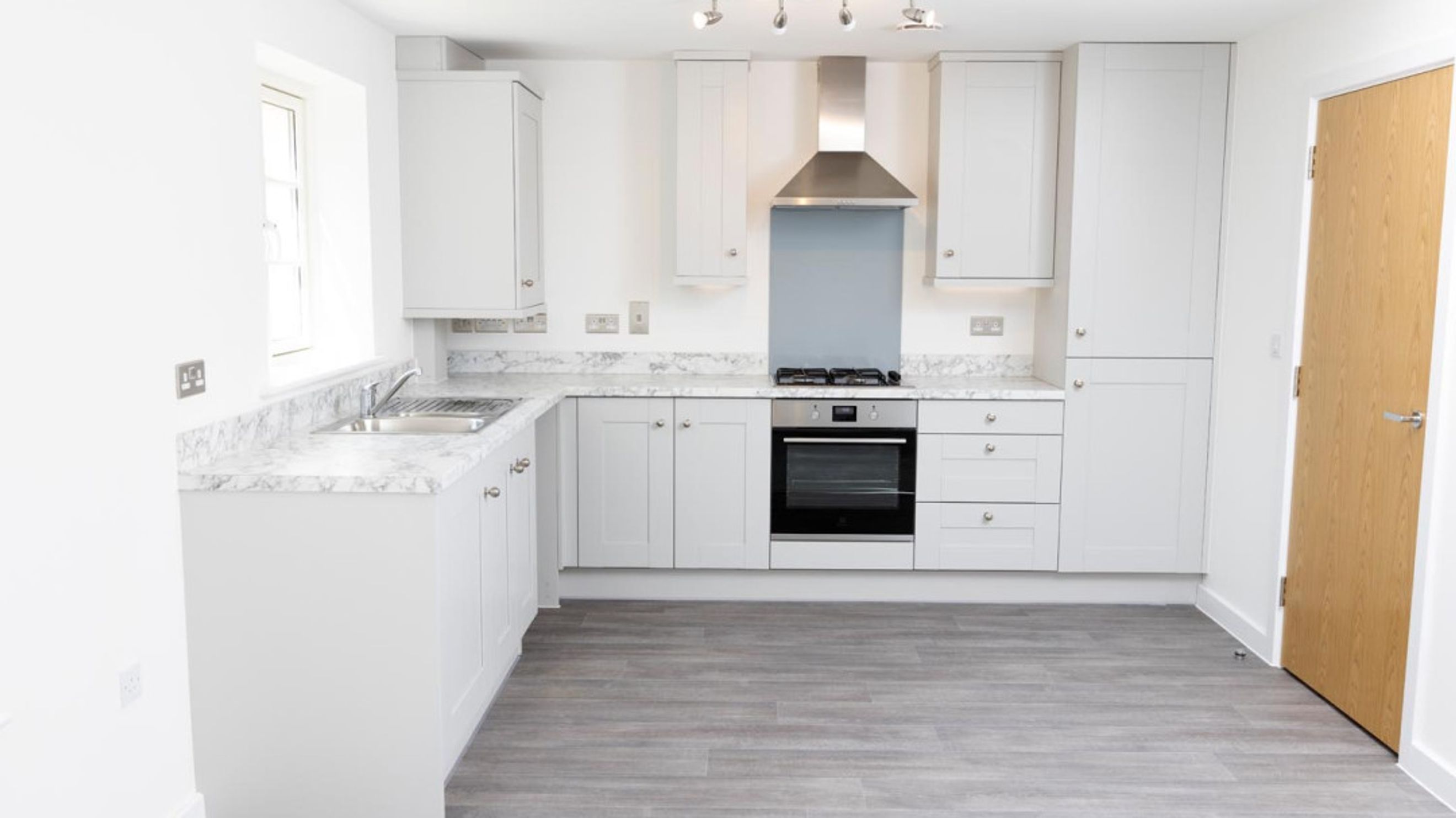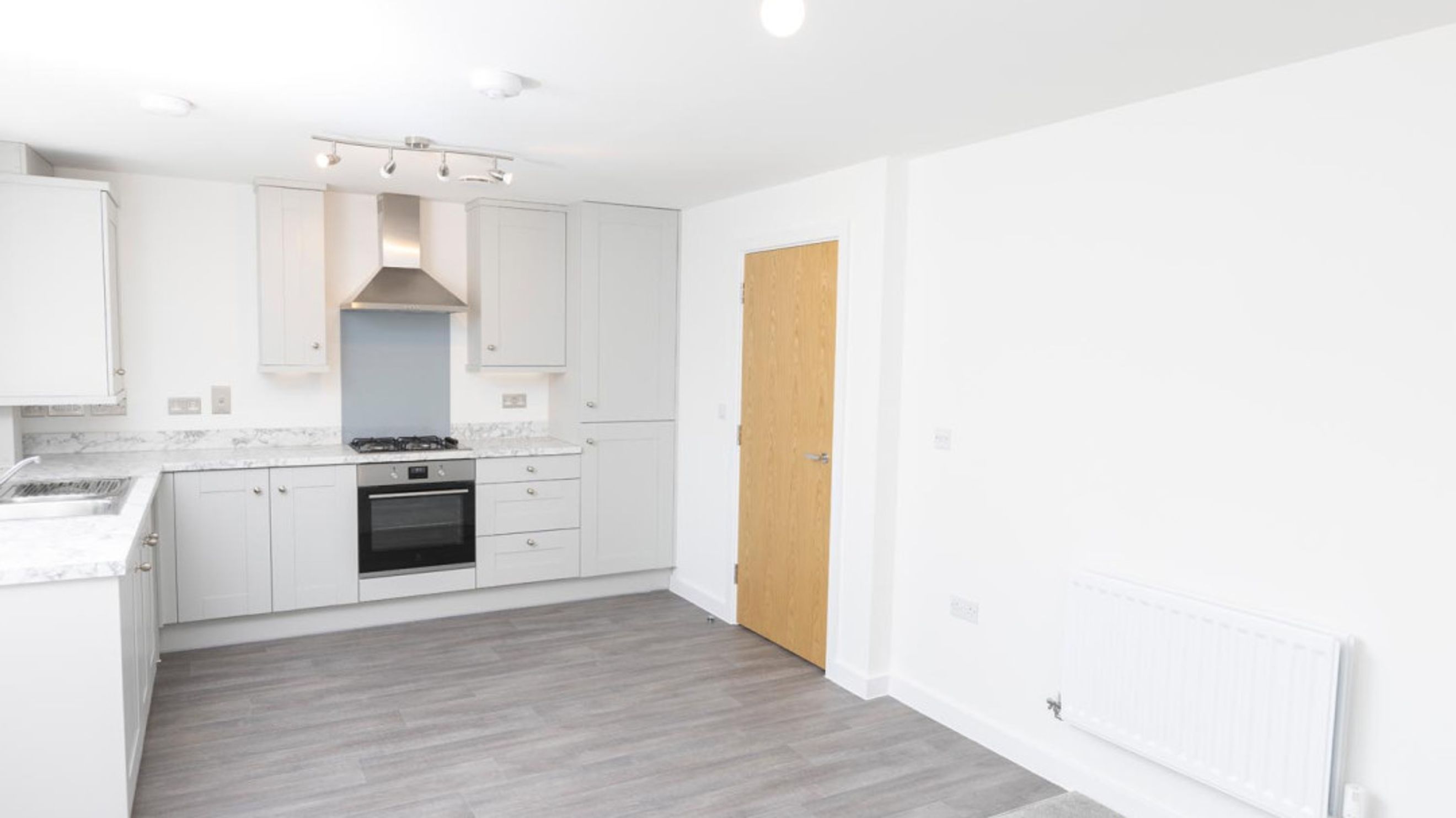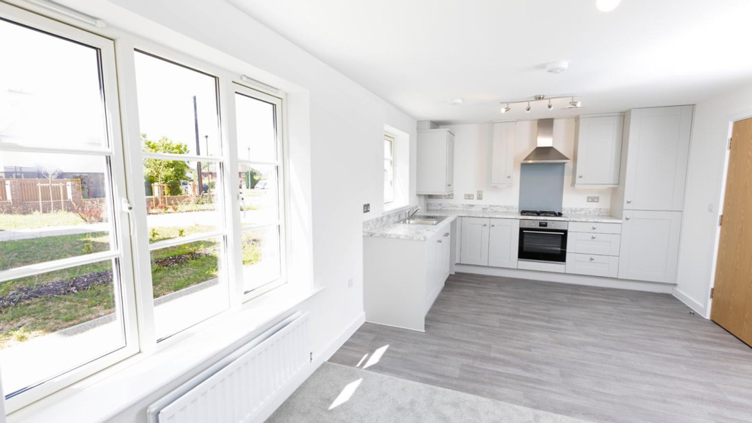 A spacious entrance hall featuring two built in storage cupboards along with a built in airing cupboard leads to the open plan kitchen/living/dining area. This room is a bright and sociable area, the kitchen has a range of base and wall units including a built in oven, hob and extractor fan. Spaces for a fridge/freezer and washer/dryer.