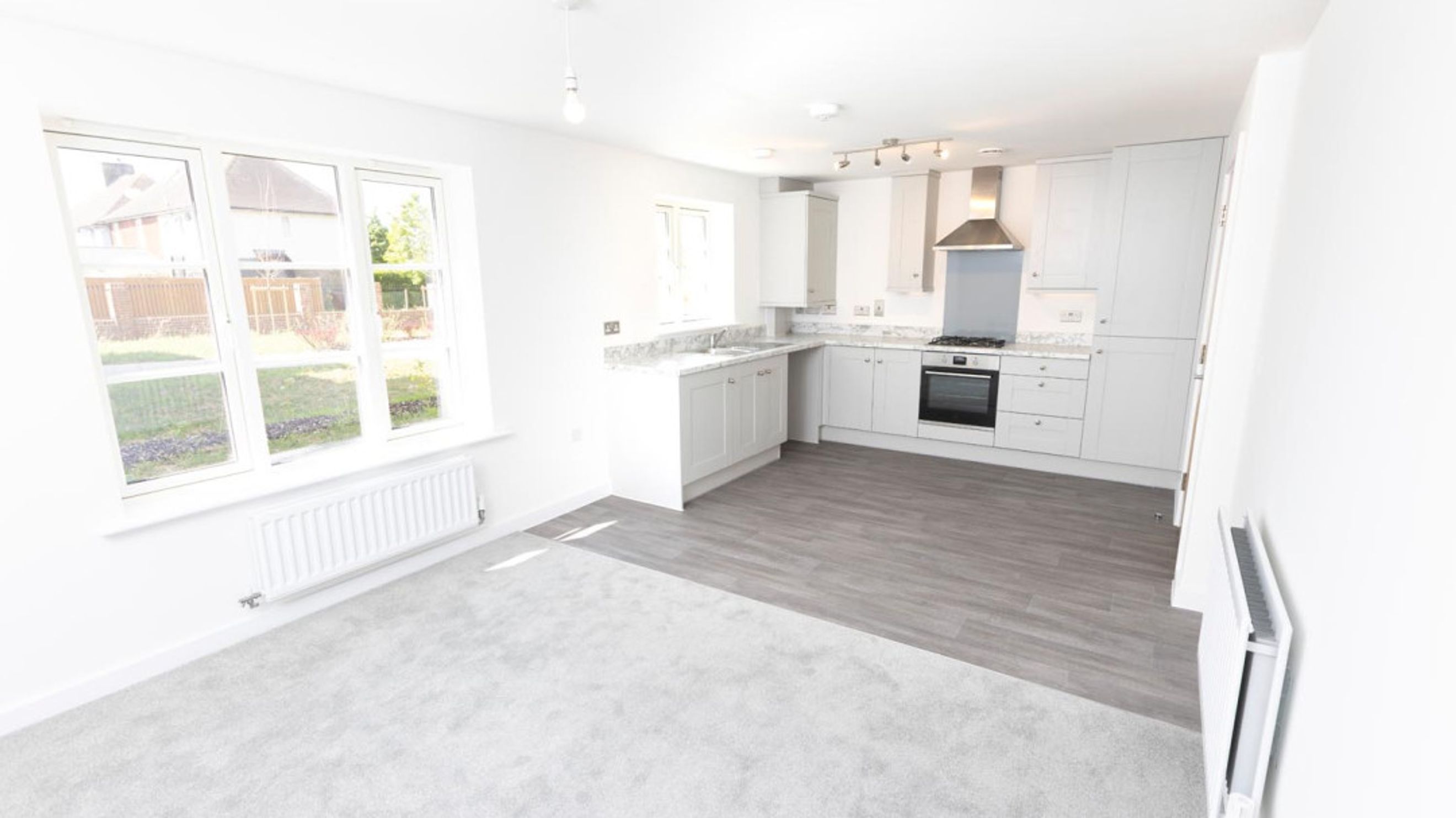 A spacious entrance hall featuring two built in storage cupboards along with a built in airing cupboard leads to the open plan kitchen/living/dining area. This room is a bright and sociable area, the kitchen has a range of base and wall units including a built in oven, hob and extractor fan. Spaces for a fridge/freezer and washer/dryer.