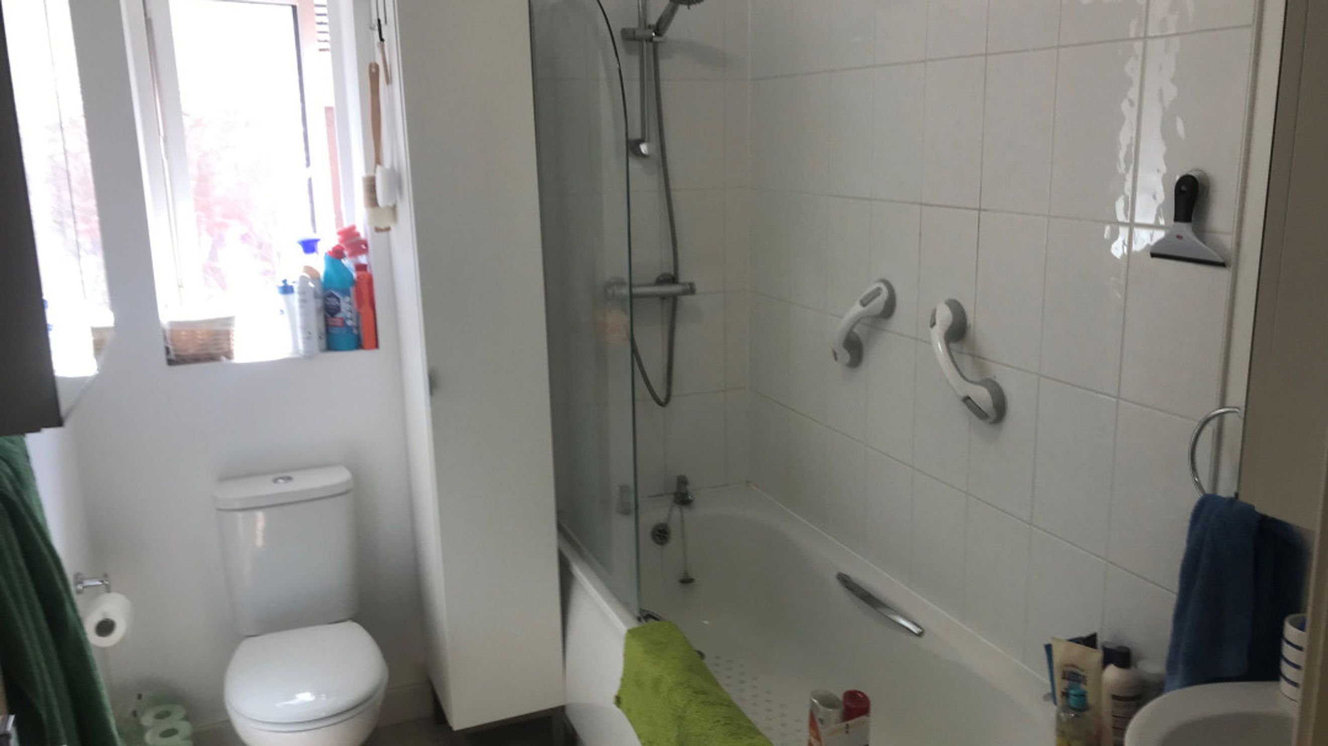 The family bathroom boasts laminate flooring and a modern white suite, including a shower over the bath with a shower screen.