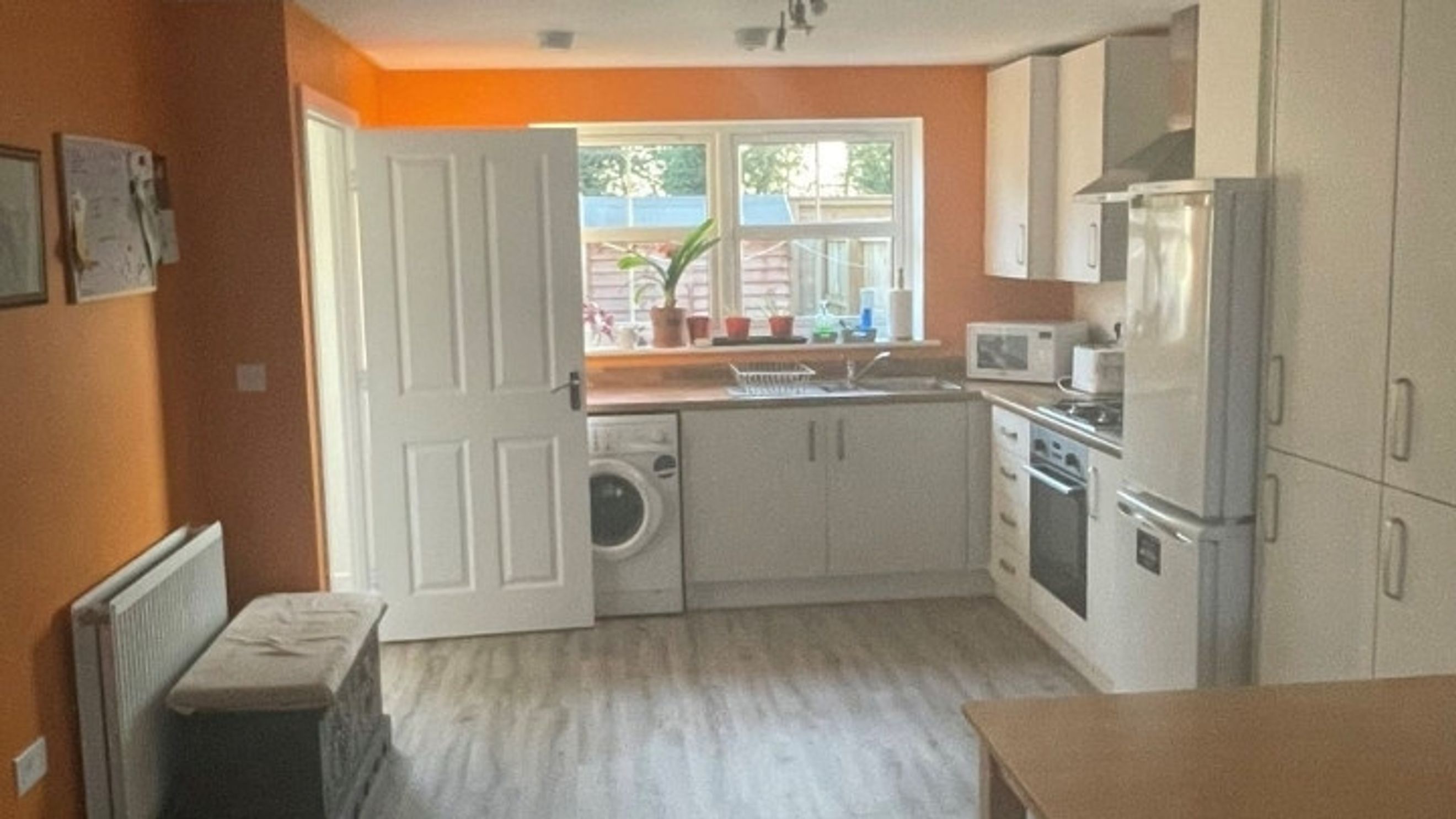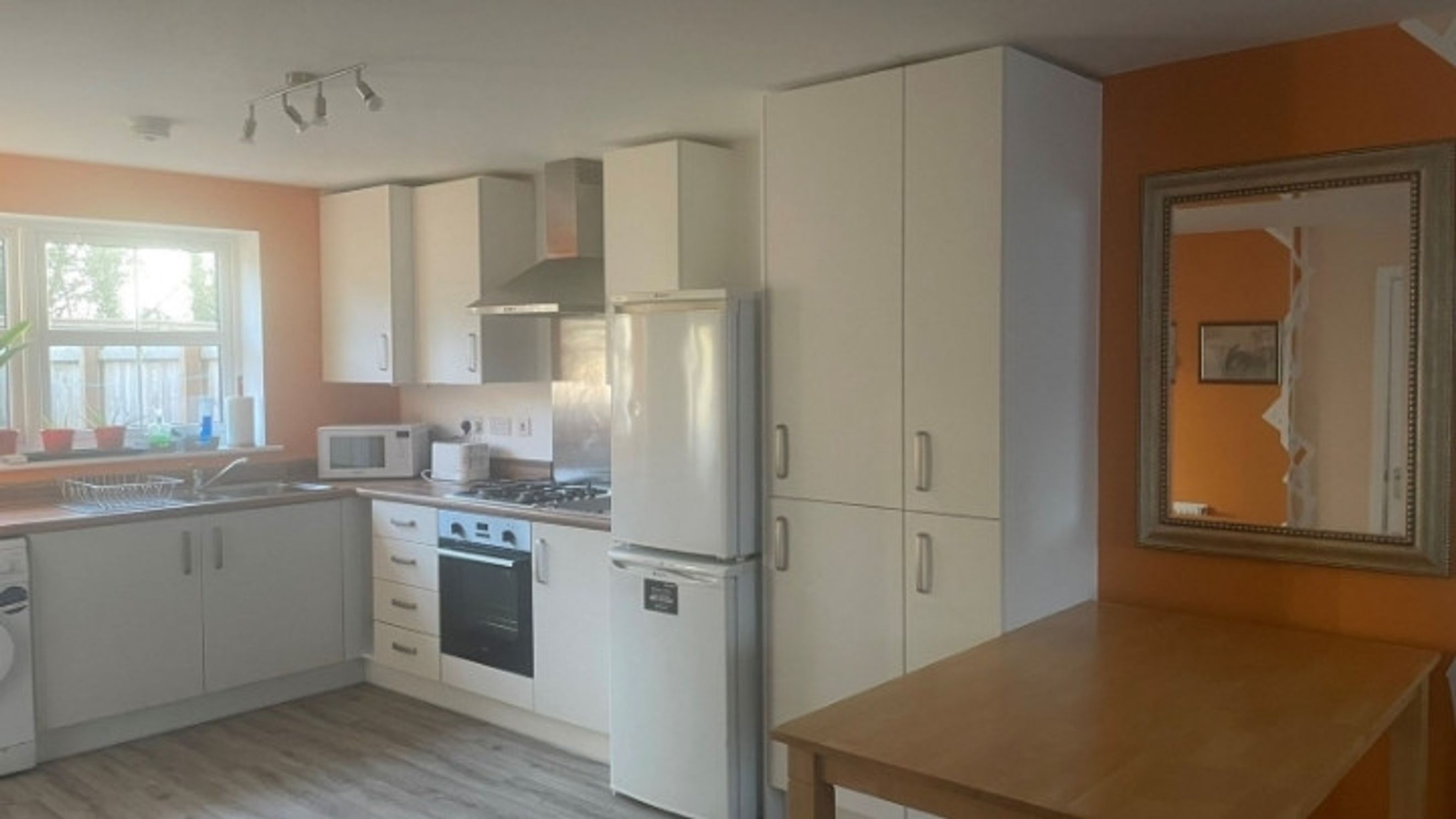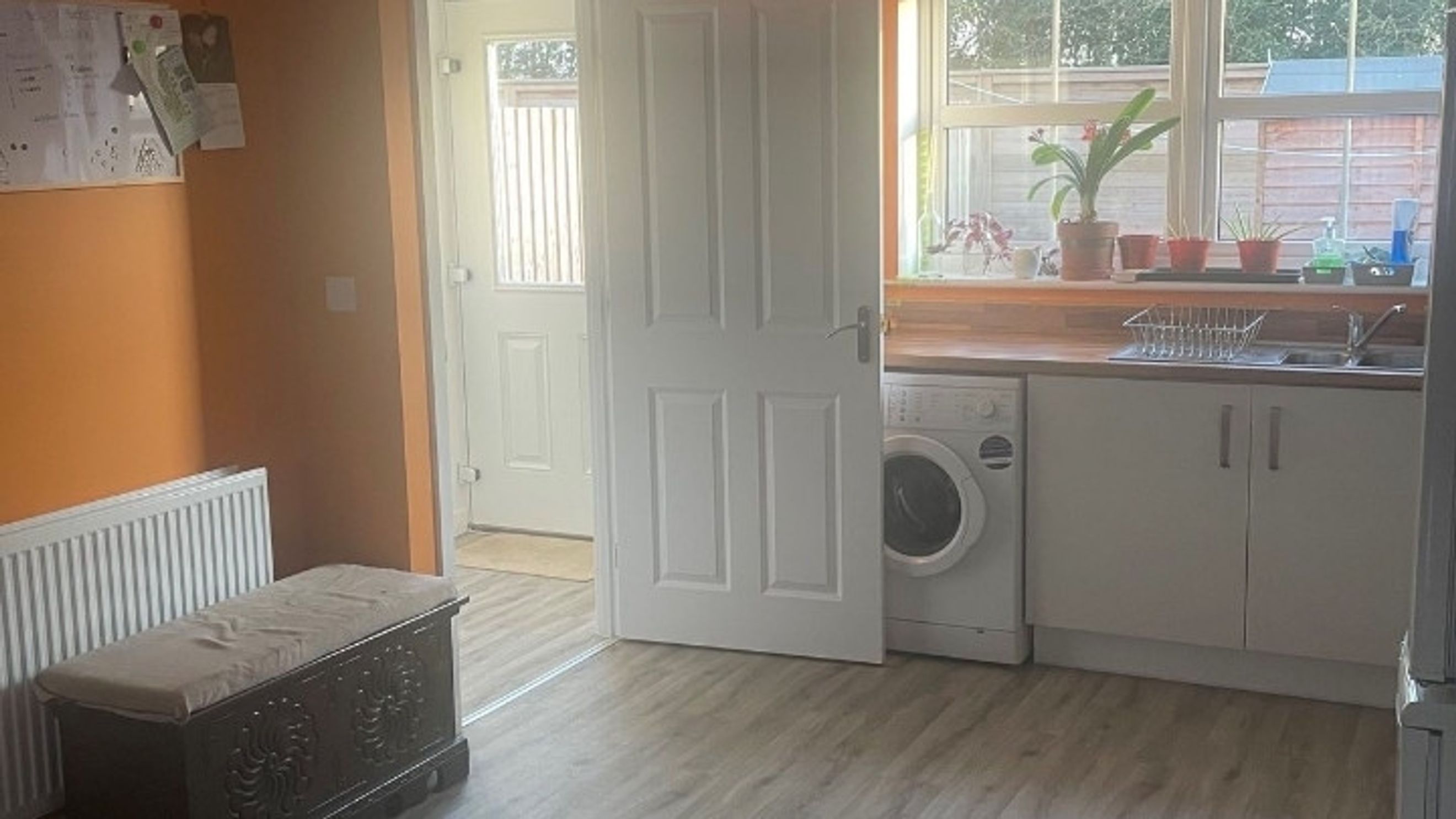 Upon entering, you're welcomed by laminate flooring in the entrance hall, which seamlessly flows into the spacious open-plan kitchen and living area. The kitchen is well-equipped with a gas hob, electric oven, and designated spaces for a fridge/freezer and washer/dryer. The living area also features a telephone point and TV aerial point, making it ideal for contemporary living. A convenient understairs storage cupboard and a downstairs WC add to the functionality of the ground floor.