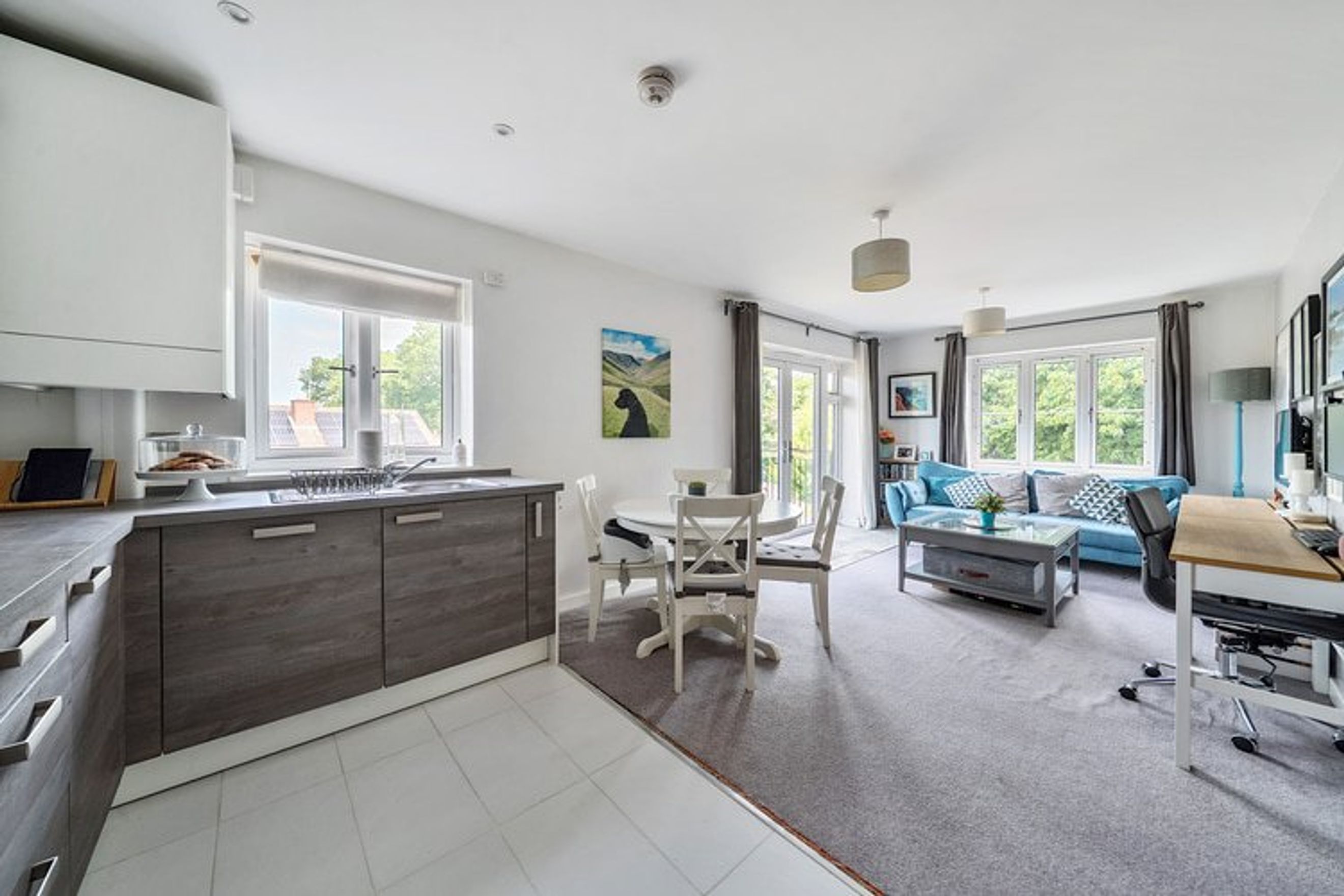 The property on the first floor comprises an entrance hall with fitted storage cupboards, a spacious living room with a modern open-plan kitchen, two bedrooms, and a bathroom.