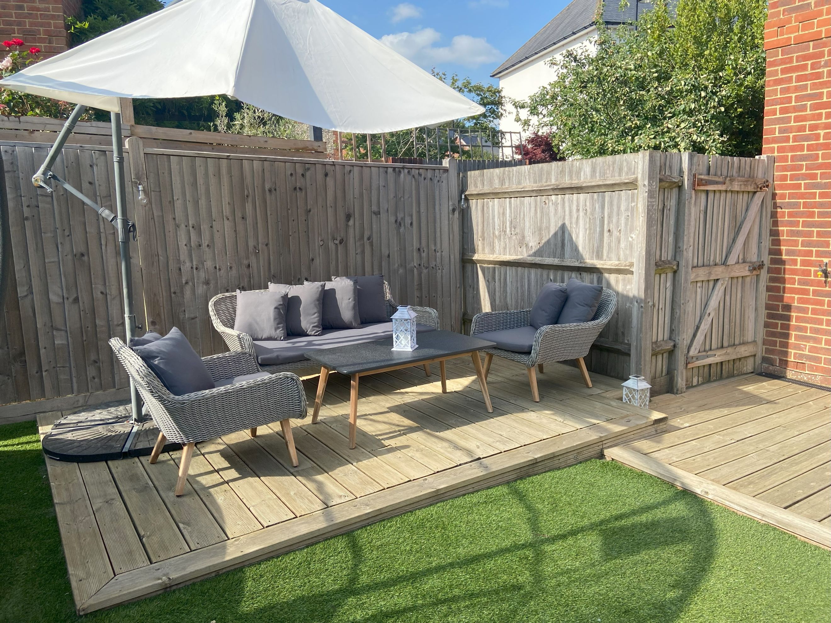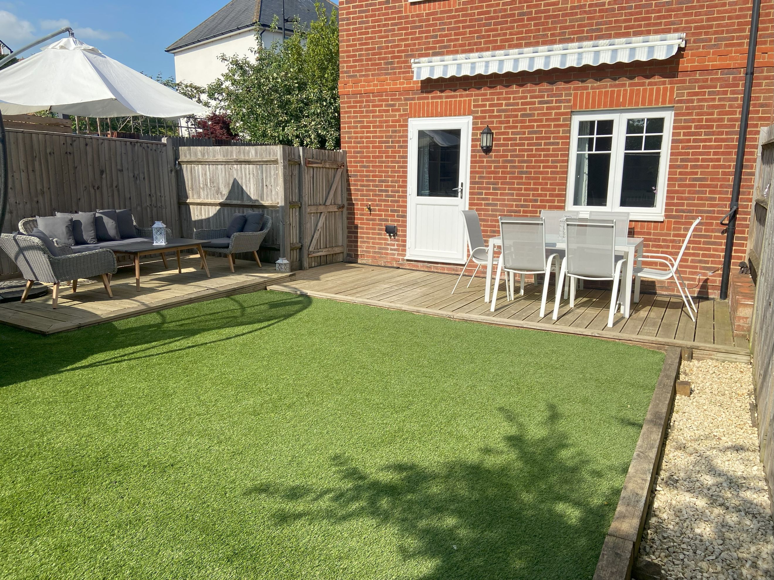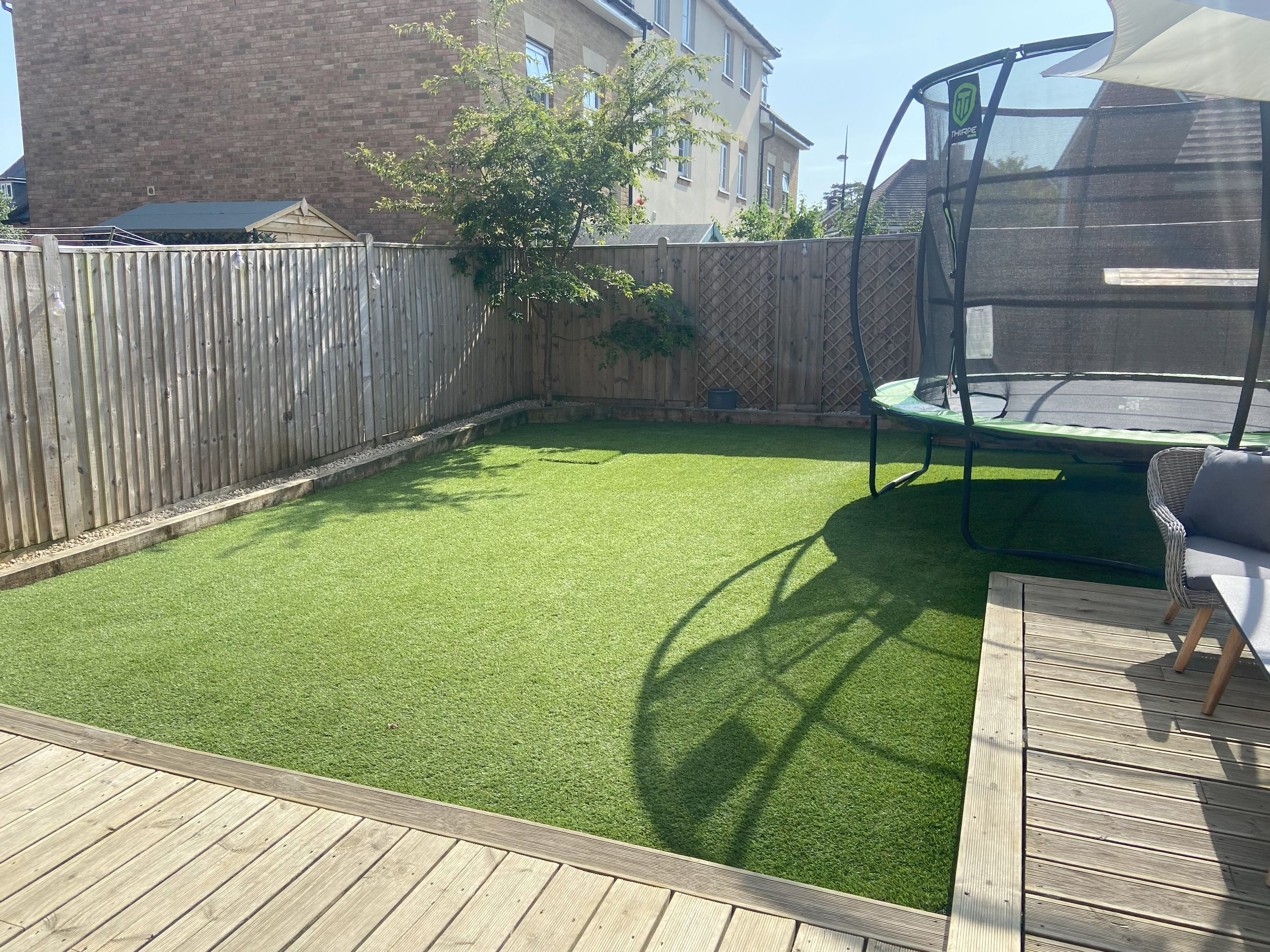 Good-sized, landscaped, and low-maintenance garden. Fitted with a high-quality, professionally installed, artificial grass and large decked areas for seating and storage.