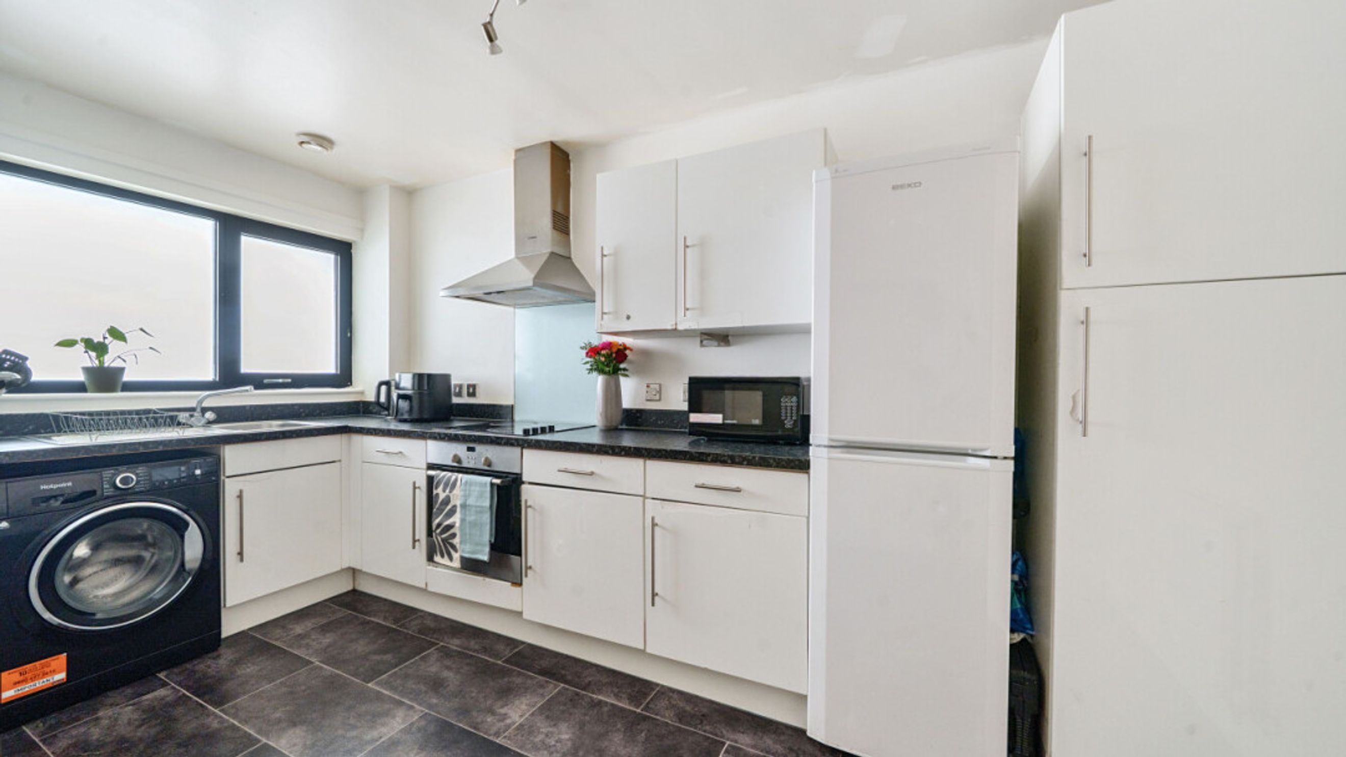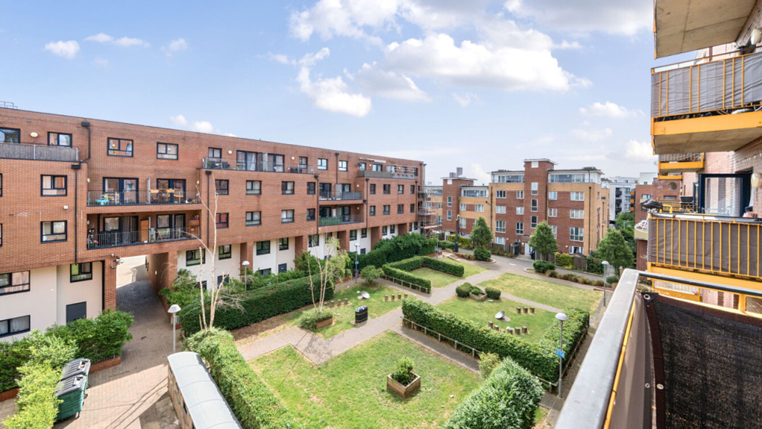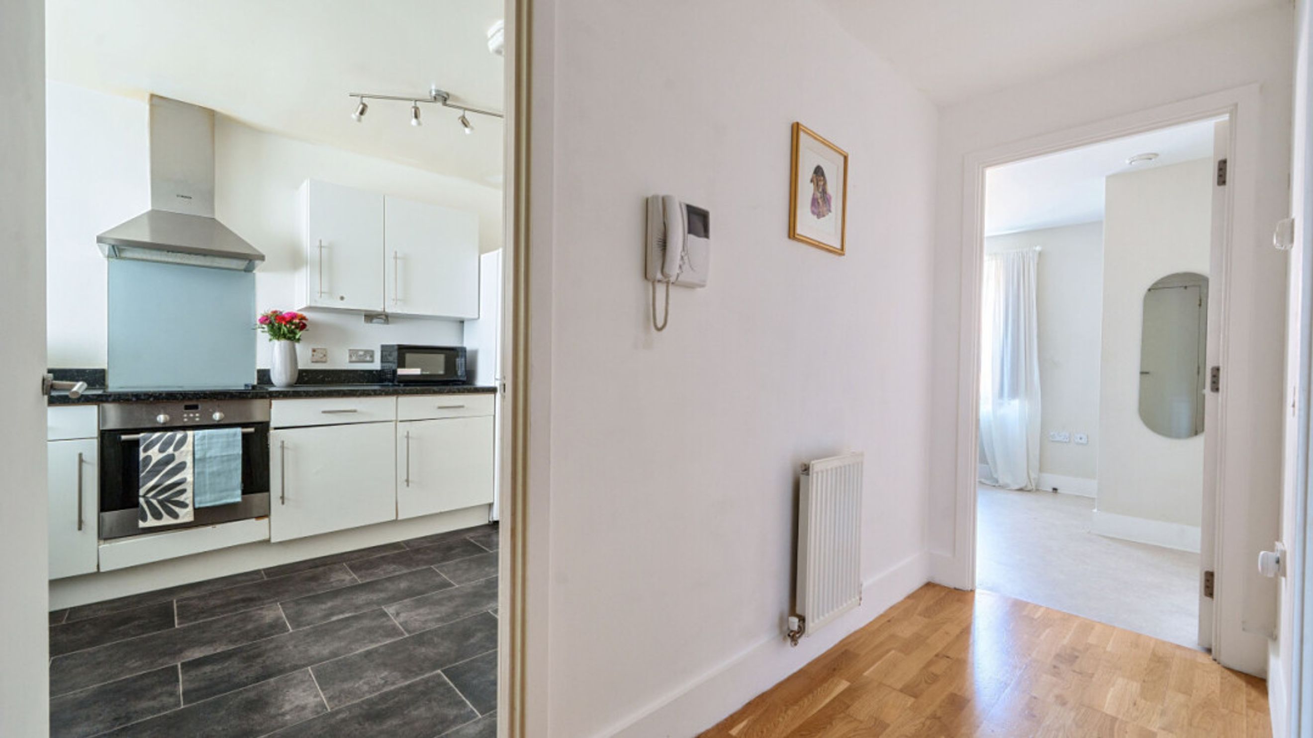 Enter this dual aspect third floor apartment via a central entrance hall with storage. The separate kitchen is to your left and fitted with a range of white wall and base units with black worktops. There is an integrated oven, hob and estractor and spaces for white goods as well as room for a dining table. A double bedroom with in-built sotrage faces east as does the main reception room that has doors to a privte balcony overlooking the communal gardens. A bathrom with shower over bath, completes the accommodation.