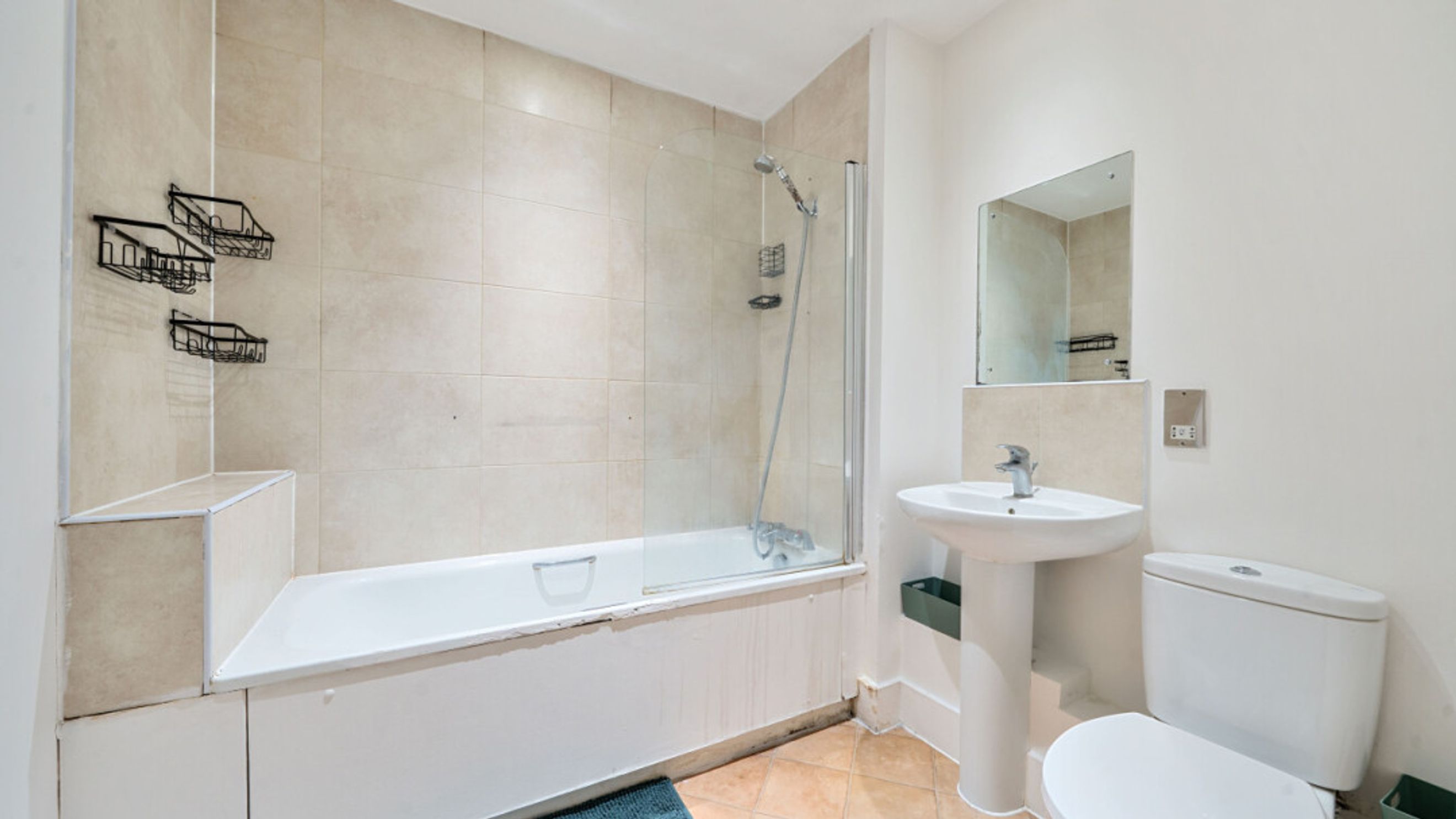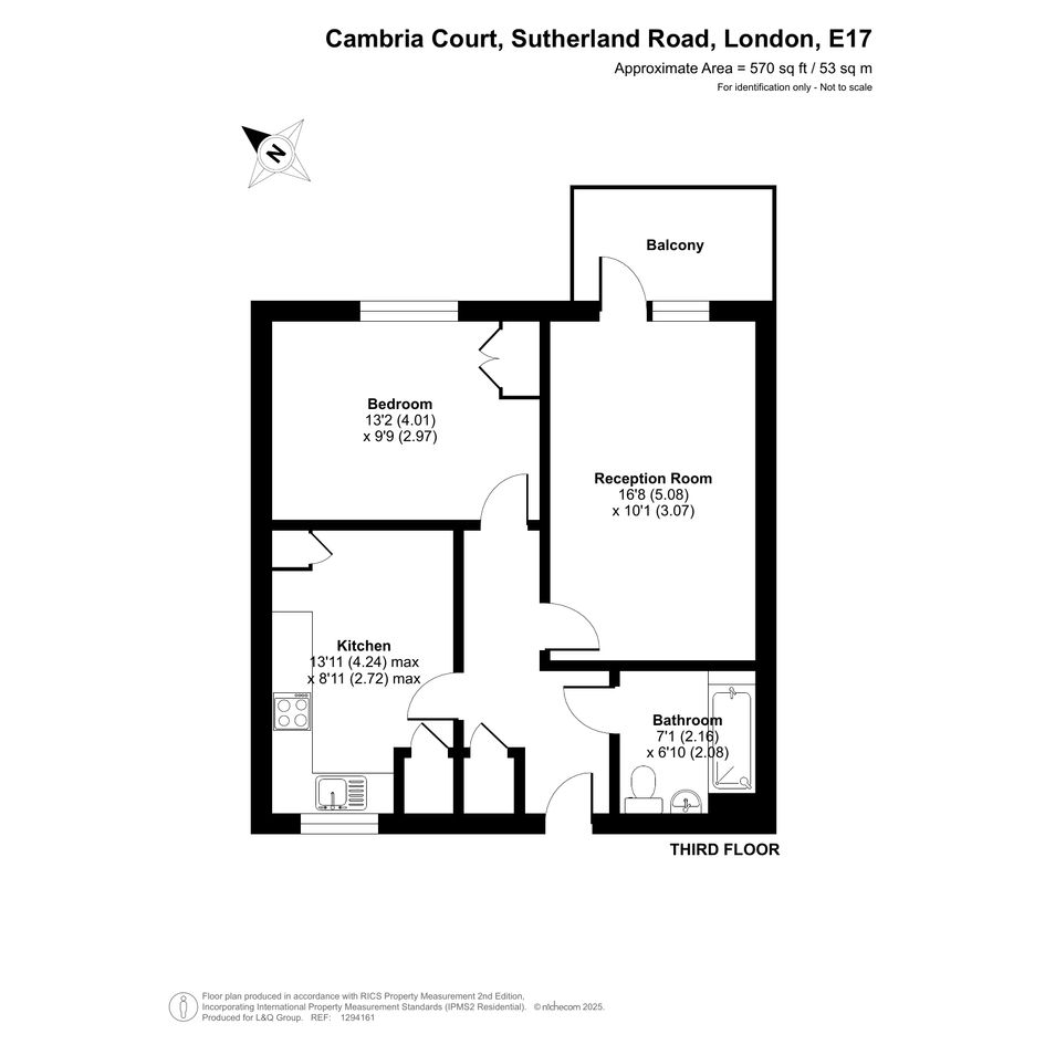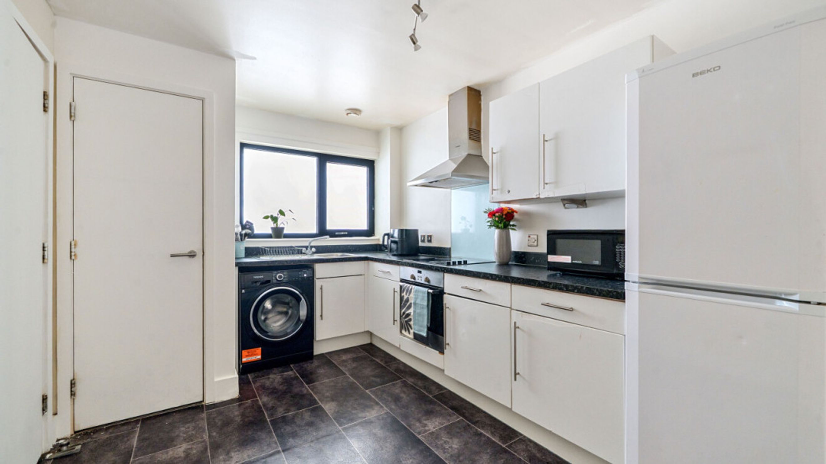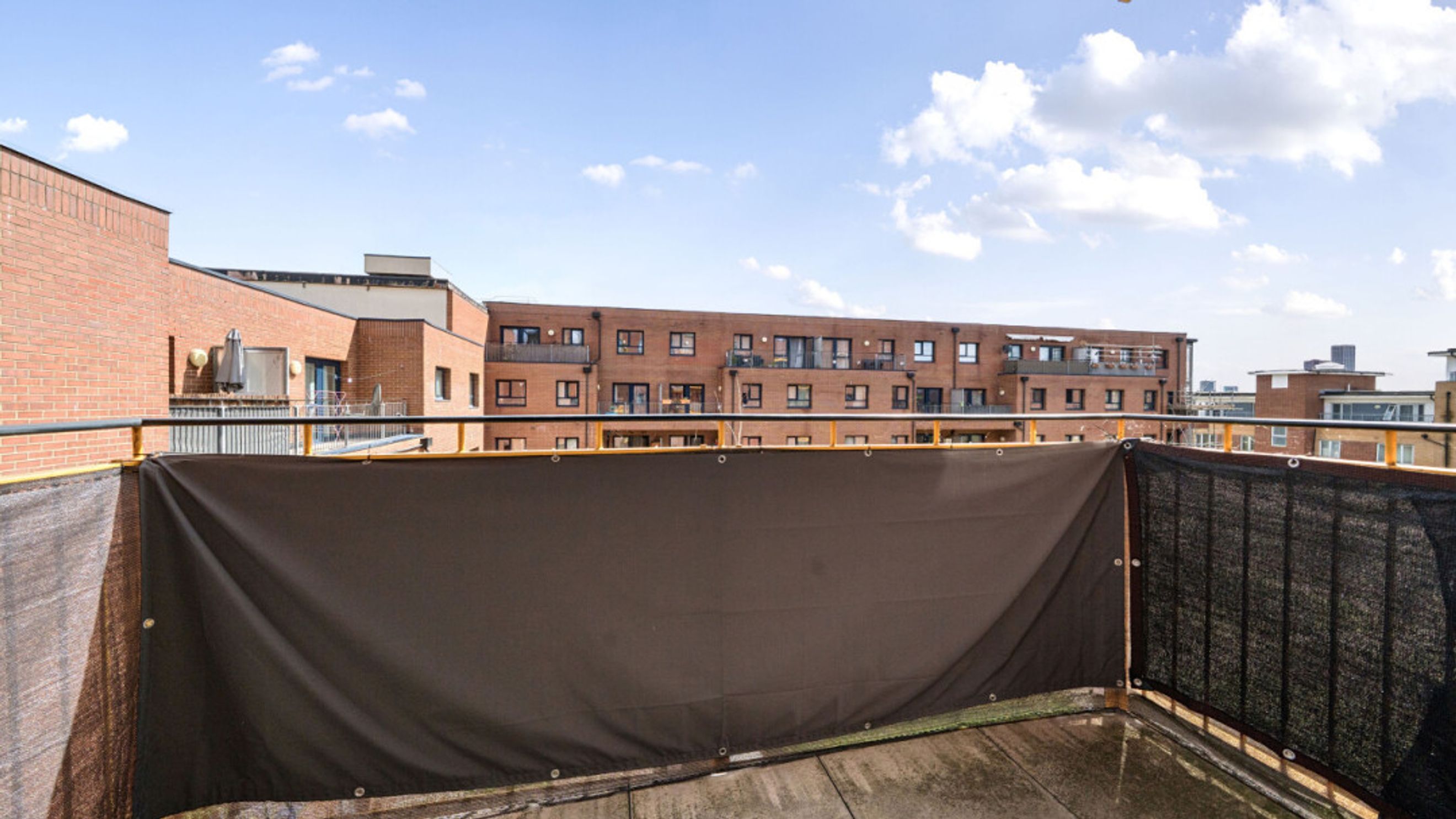 Enter this dual aspect third floor apartment via a central entrance hall with storage. The separate kitchen is to your left and fitted with a range of white wall and base units with black worktops. There is an integrated oven, hob and estractor and spaces for white goods as well as room for a dining table. A double bedroom with in-built sotrage faces east as does the main reception room that has doors to a privte balcony overlooking the communal gardens. A bathrom with shower over bath, completes the accommodation.