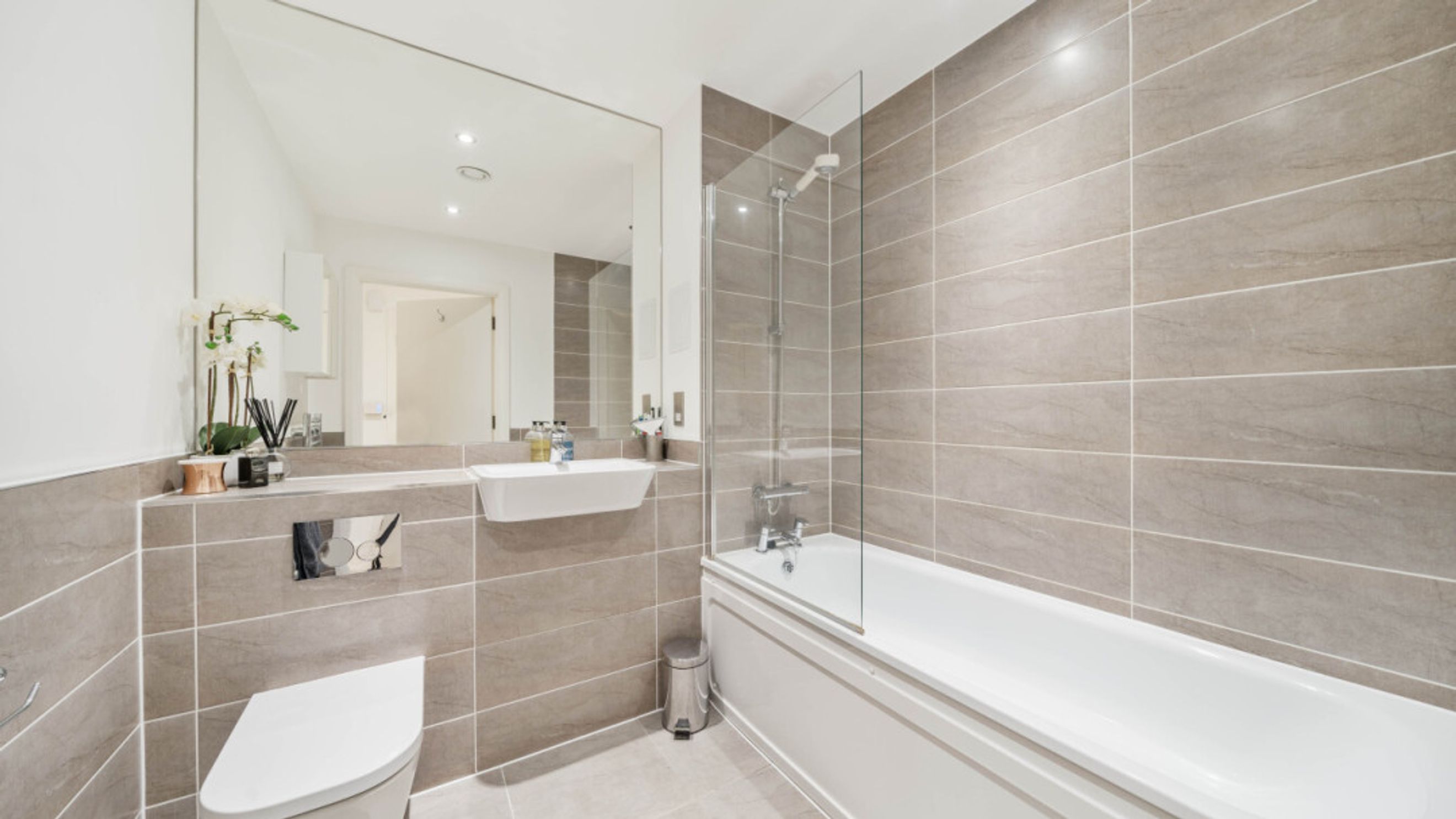 The bathroom is contemporary and complete with a white three-piece suite with a shower over bath and a stone tile surround and heated towel rail. Access to Concierge service, On-site Gym, Large communal roof terrace and central podium.