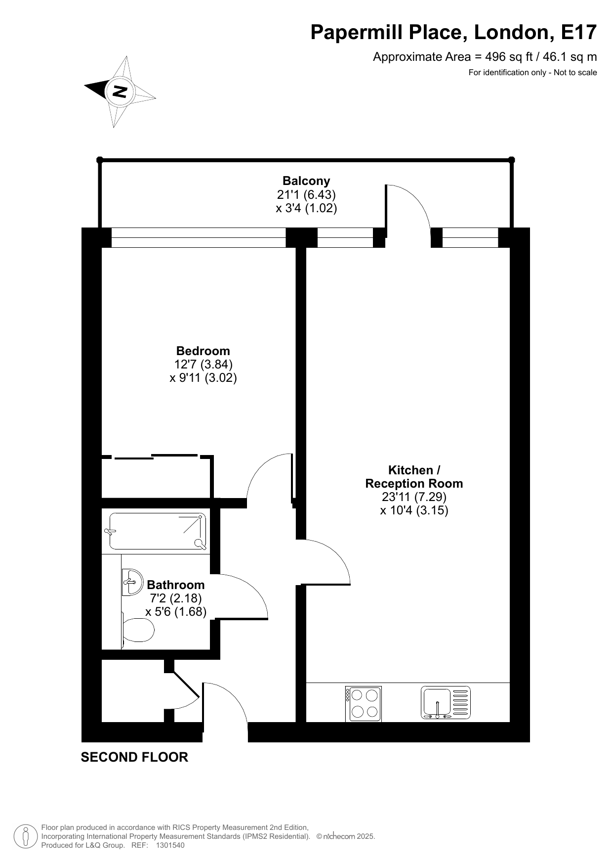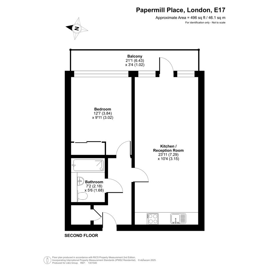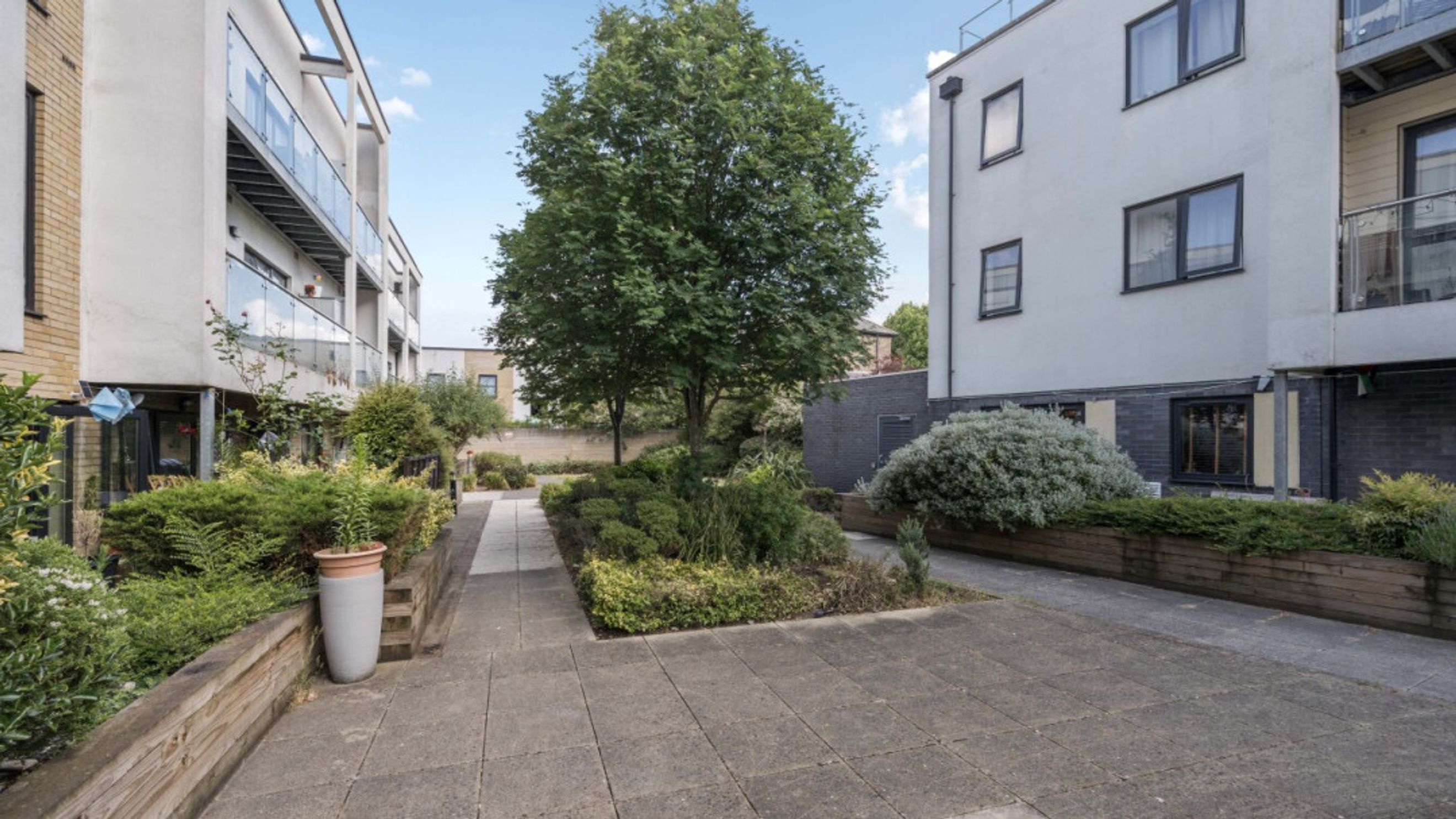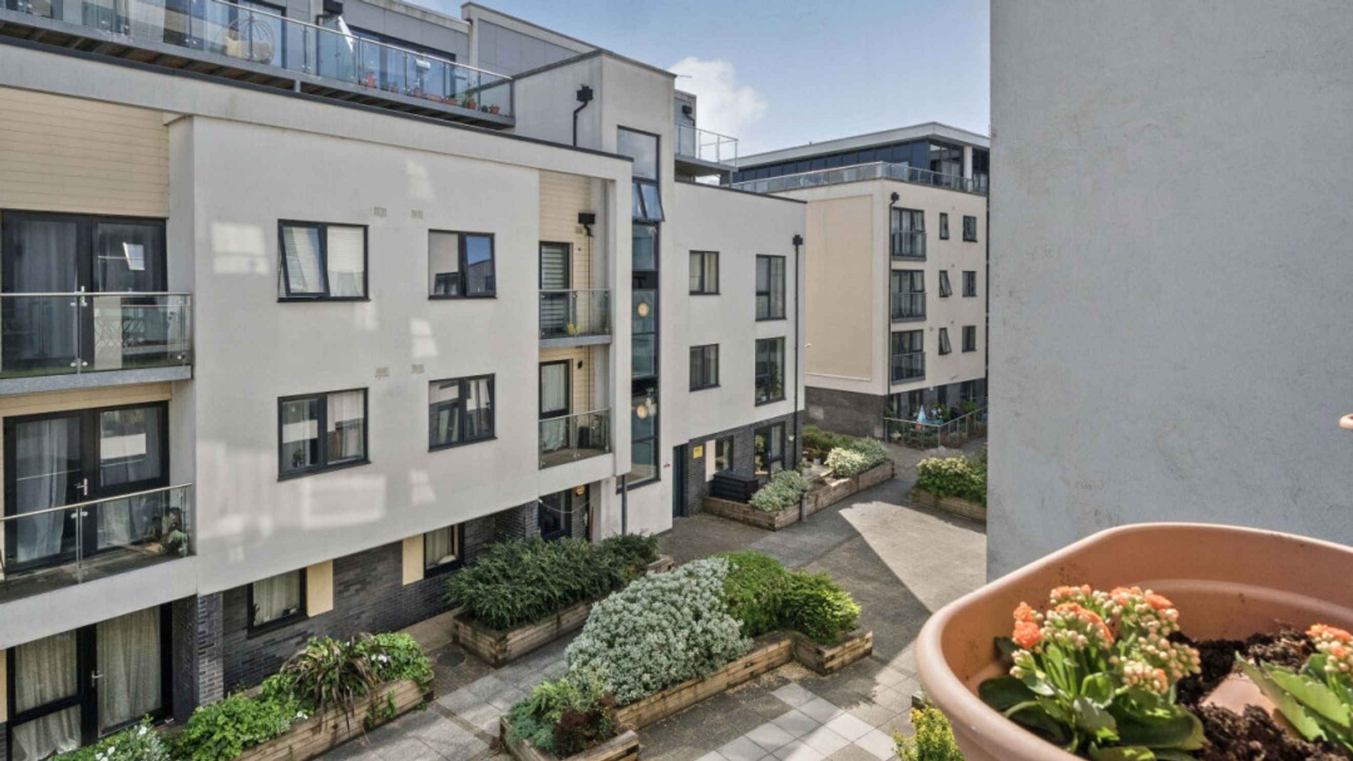 This east facing second floor apartment has an open-plan kitchen and living area opening onto a full width private balcony overlooking a quiet courtyard. The kitchen is fitted with a range of beech wall and base units with integrated oven, hob and extractor and spaces for white goods. The double bedroom, which overlooks the balcony includes built in storage. A contemporary tiles bathroom with a shower over bath and glass shower screen completes the accommodation. There is a designated parking space in the underground secure car park. Bike storage is subject to availability.