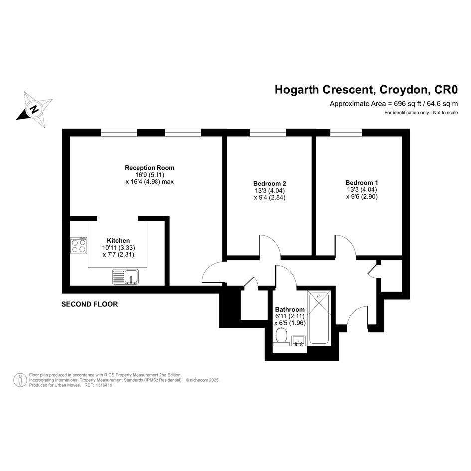This well-presented flat is on the second floor (building has a lift) and has a reception/dining room with a doorway leading through to a good-sized kitchen. There are two spacious double bedrooms and a simple, white-tiled bathroom. A pair of built-in storage/utility cupboards have been provided in the entrance hallway and well insulated walls, modern double glazing and gas central heating make for a good energy-efficiency rating. Groombridge Court has communal grounds and a car park which includes a space for this flat. Both West and East Croydon Stations are within comfortable walking distance.