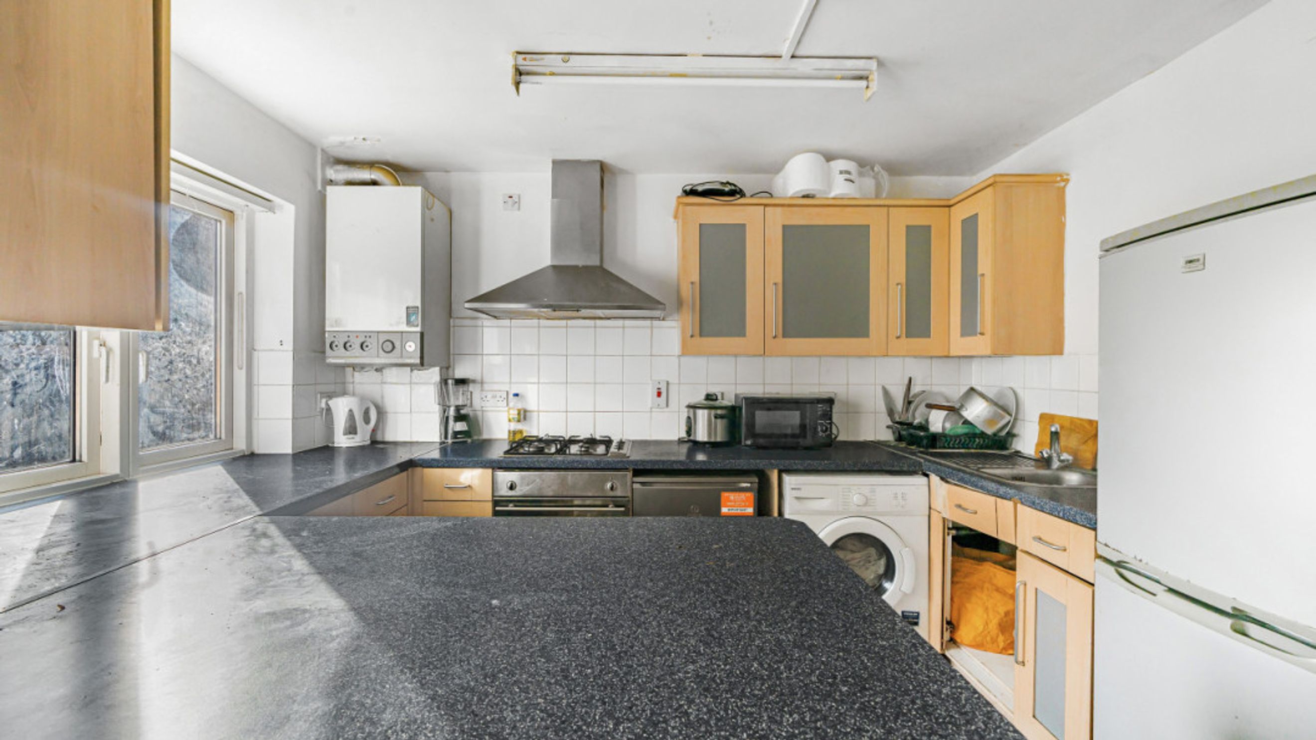 The apartment has a large dual aspect living area, open plan to a kitchen fitted with a range of beech wall and base units with integrated oven, hob and extractor and spaces for fridge/freezer and washing machine . Additionally, there are two double bedrooms and a family bathroom.