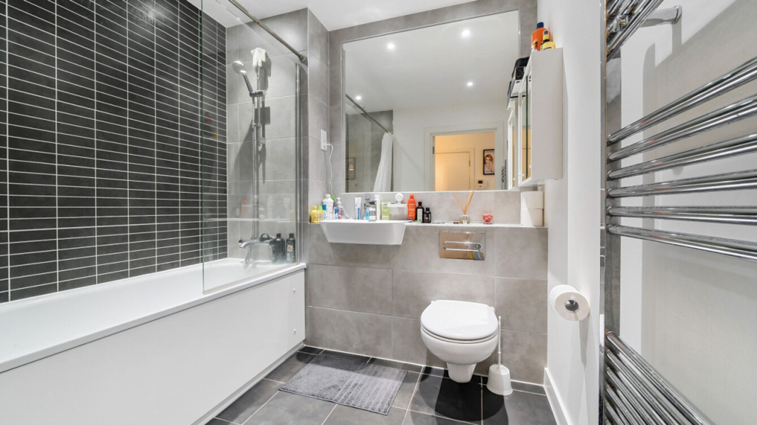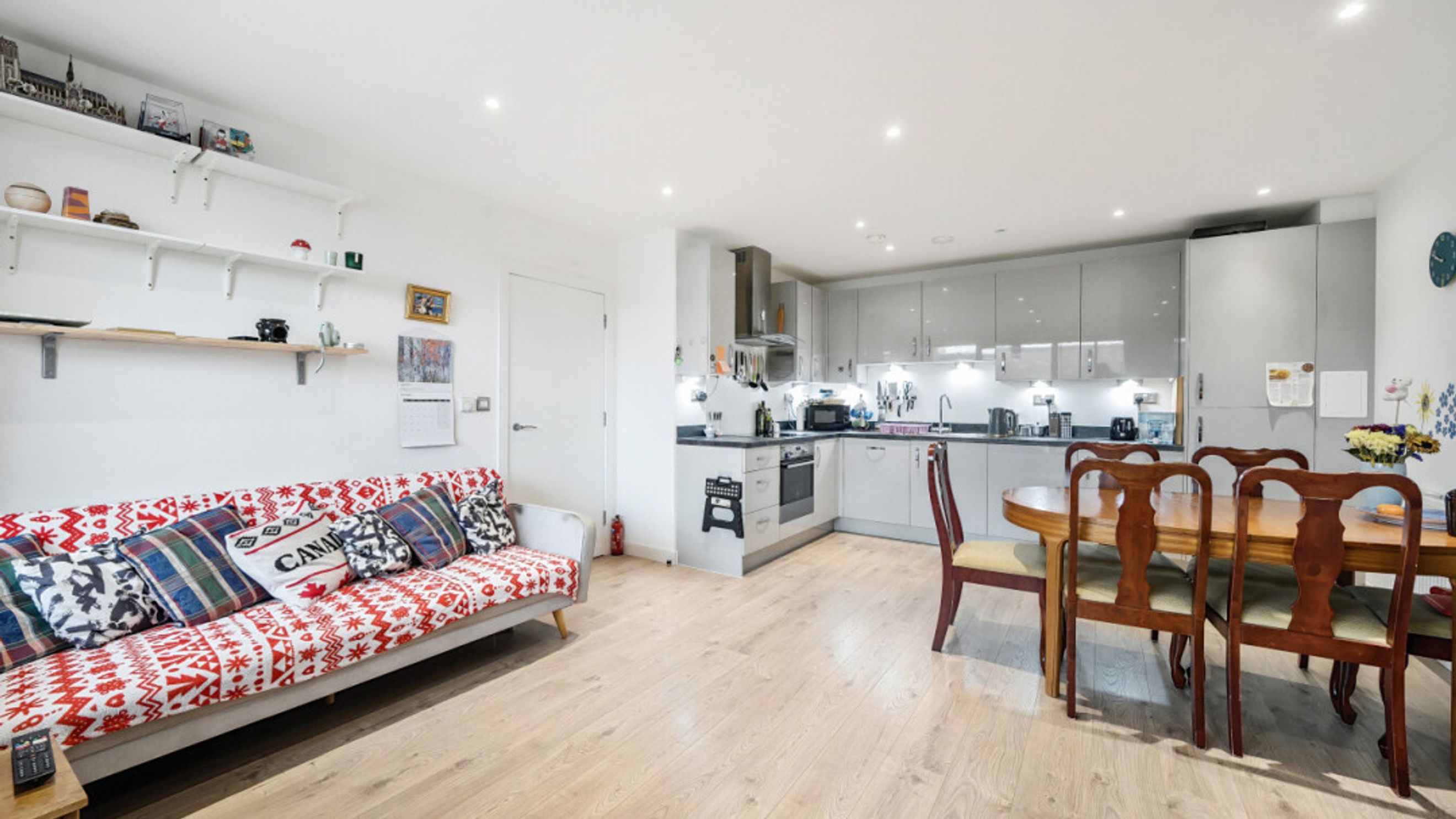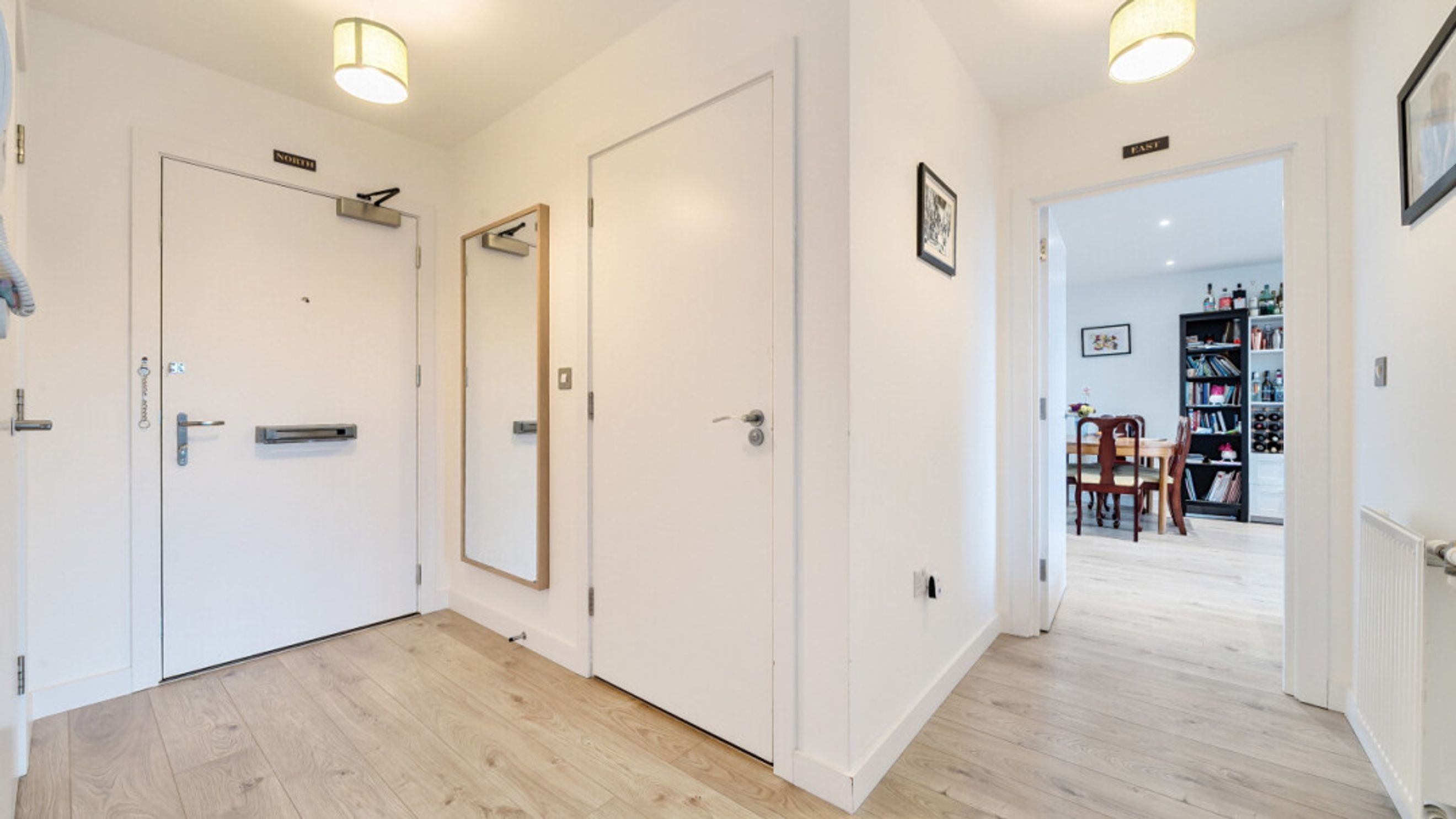 Entering this apartment find a utility cupboard and contemporary bathroom to your left. To your right is the master bedroom which benefits from fitted wardrobe and en-suite shower room and a door to the full width balcony. The second double bedroom has a dual aspect and provides a perfect place to work from home. The light and airy spacious open plan living area is also dual aspect providing views over a green roof and then of the locale via the balcony , which provides a place to sit and relax or to eat outside.
