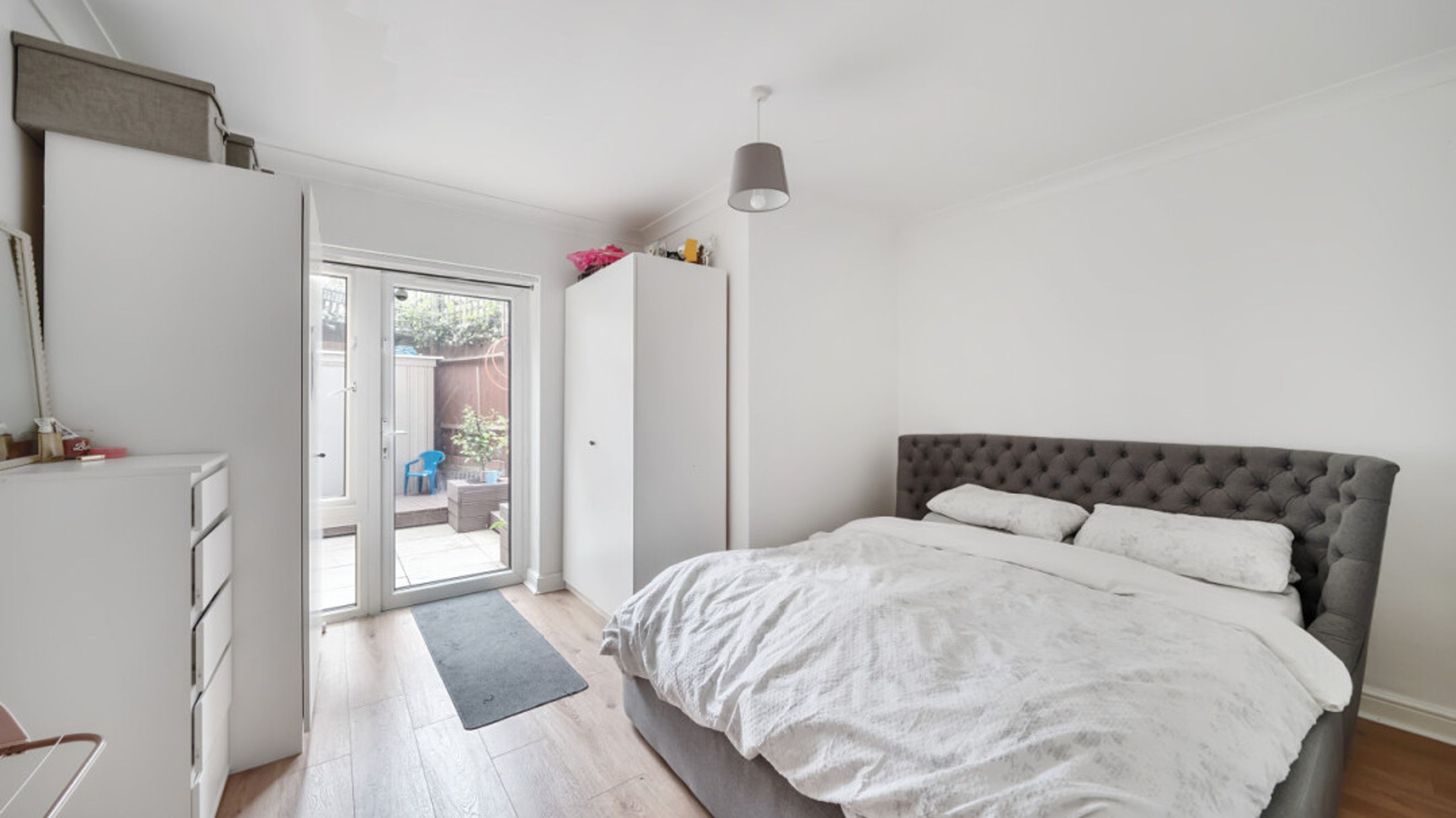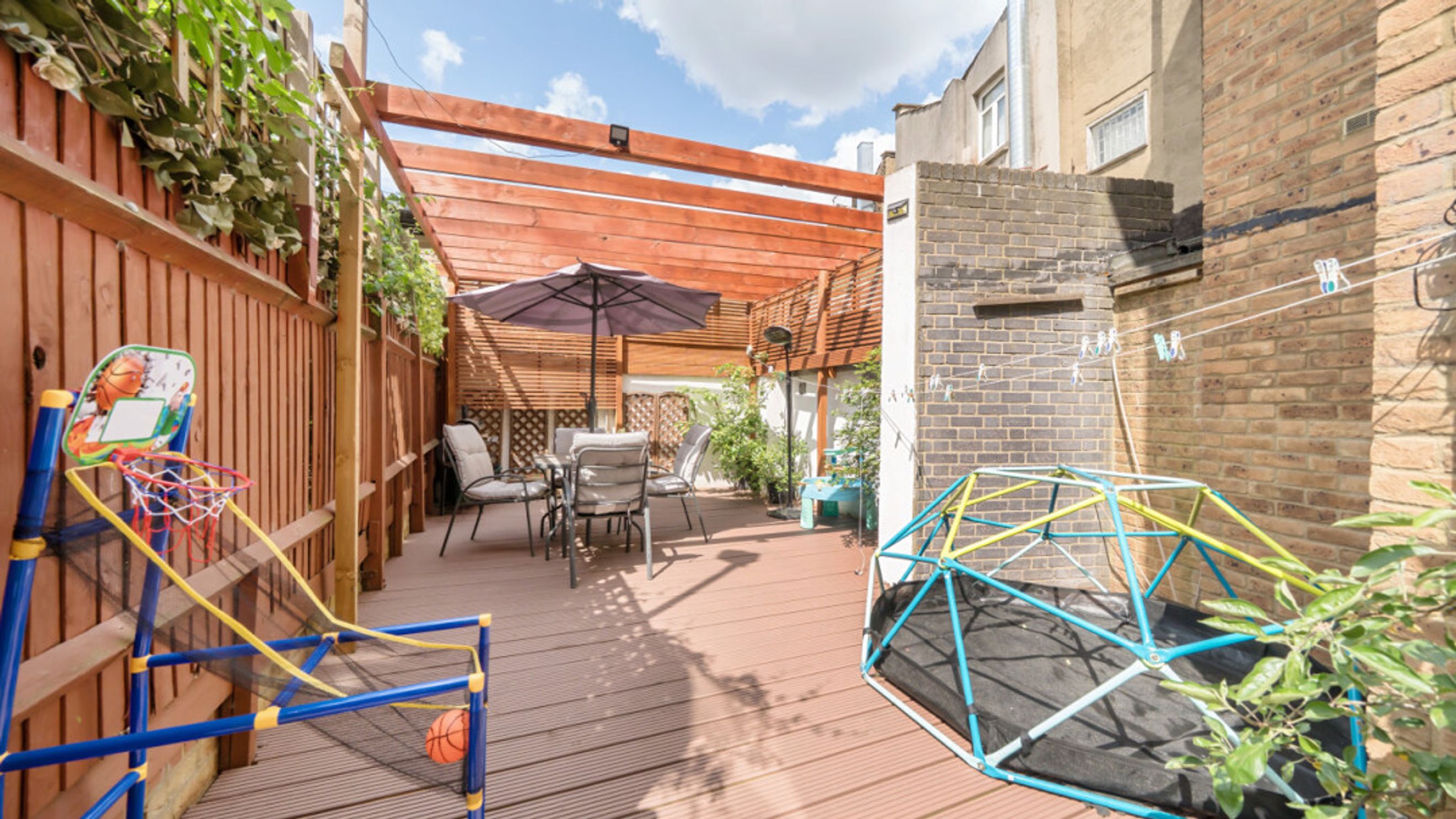 Enter this ground floor apartment via a spacious hallway, including storage cupboards, at the end of which is a contemporary family bathroom.. A large reception room to your right is lined with south facing doors and windows opens onto a full width covered patio area. The kitchen area includes a range of Beech wall and base units with integrated oven, hob and extractor and spaces for white goods. On the opposite side of the hallway, find two double bedrooms, one of which will accommodate a King sized bed and includes in-built storage. Both bedrooms open onto a good sized rear garden laid to patio and decking and including a large pergola.