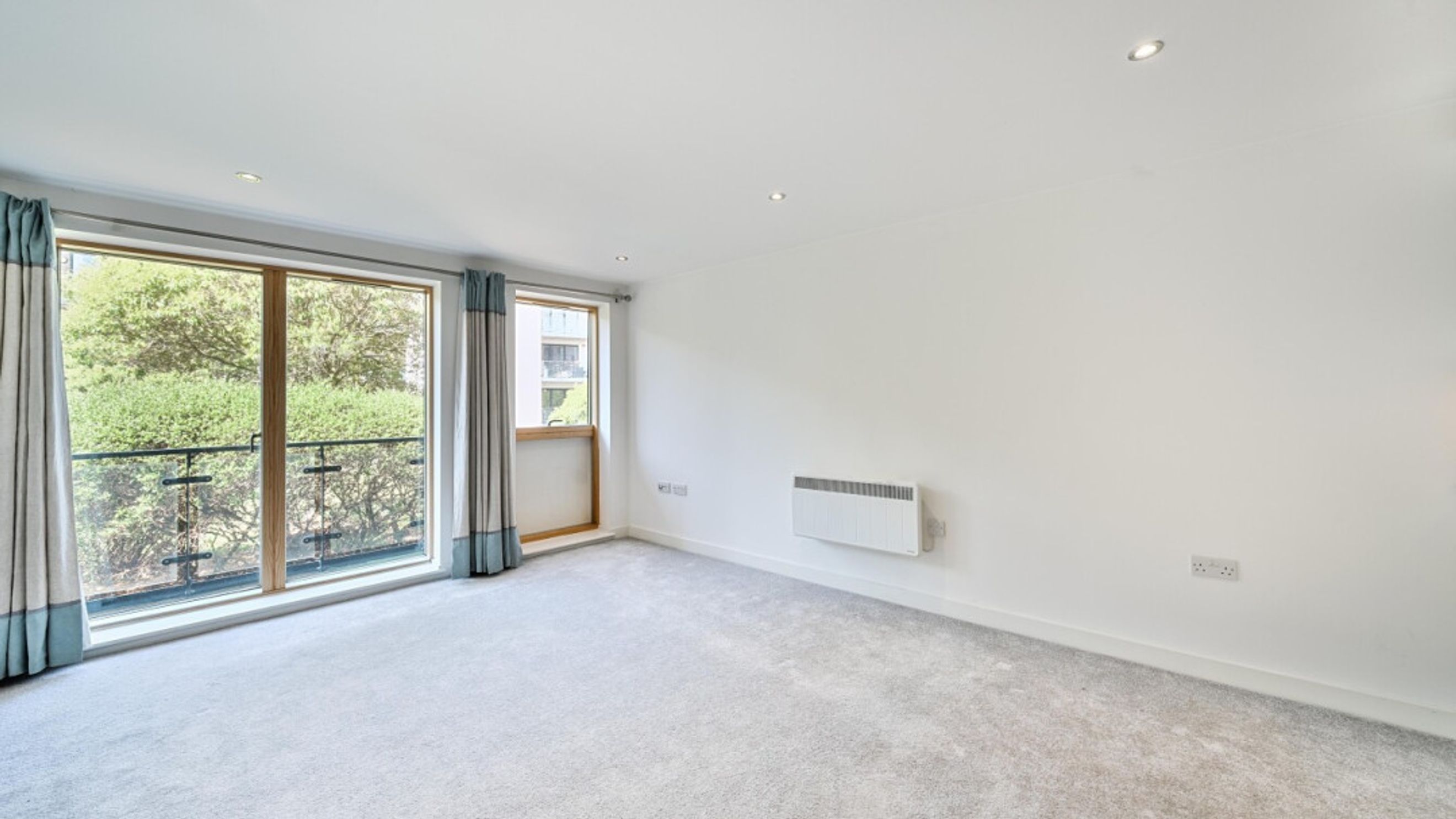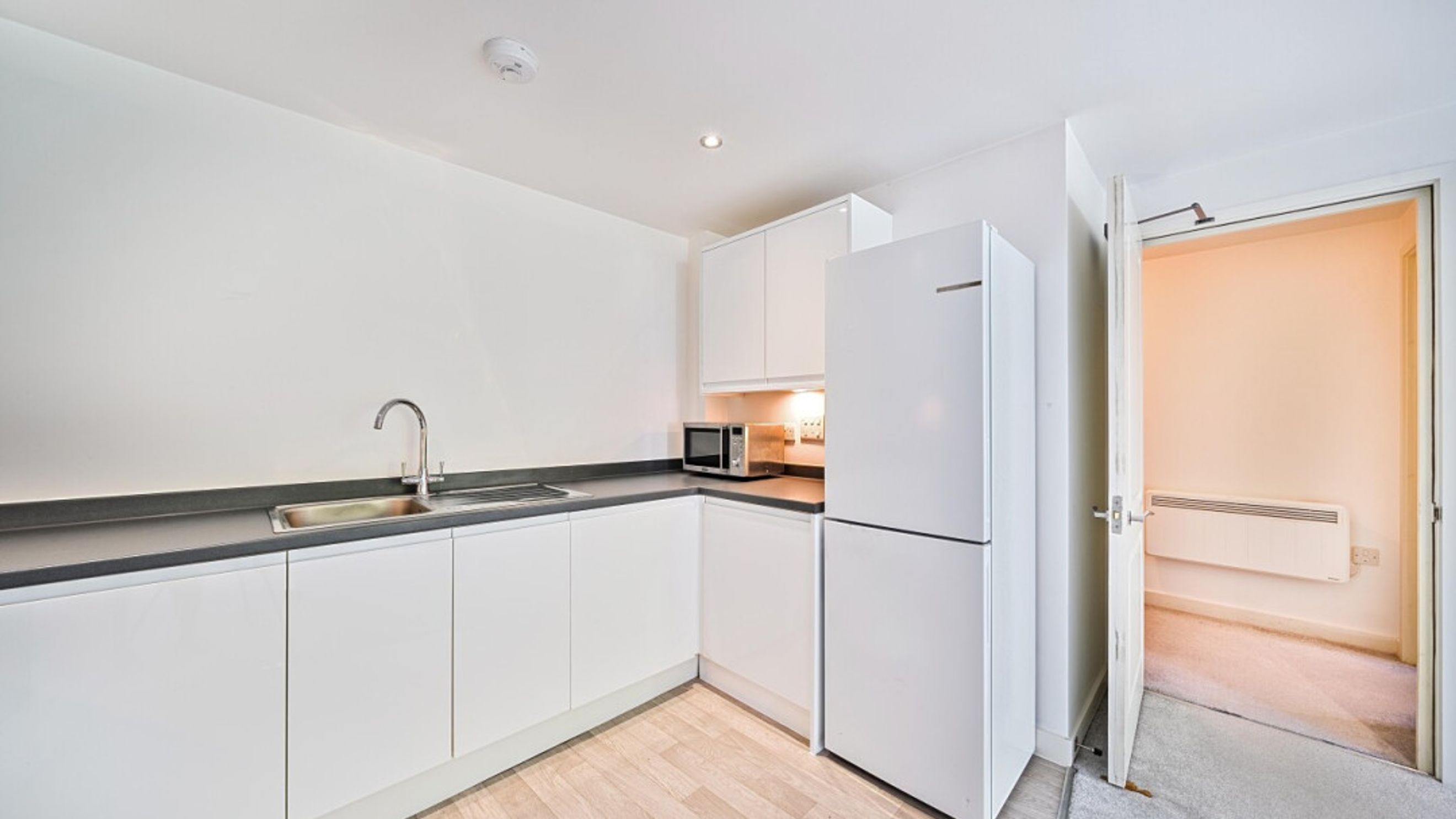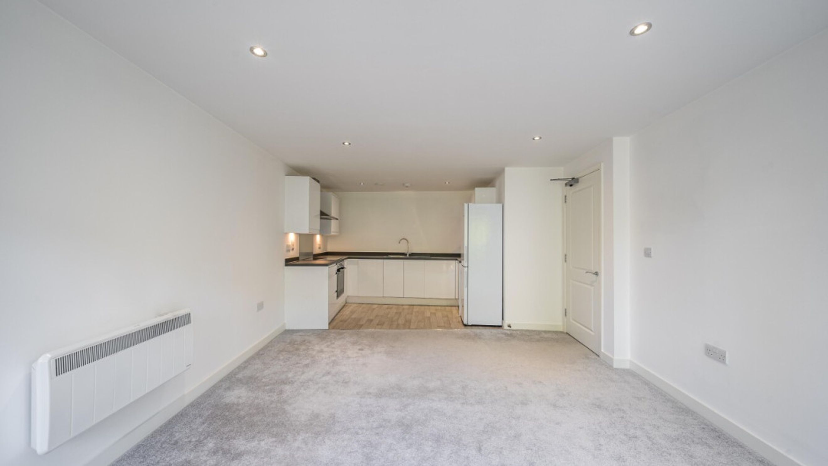 All rooms lead off a central hallway in this bright and airy apartment. the open-plan kitchen and living area is flooded with natural light from the floor length doors opening onto a private balcony, which is not overlooked. The kitchen is fitted with white wall and base units and a dark worktops. It also benefits from integrated a oven, hob and extractor fan. A spacious double bedroom comes complete with fitted wardrobe and a modern bathroom, with a white three-piece suite with a shower over bath and a tile surround, completes the accommodation.