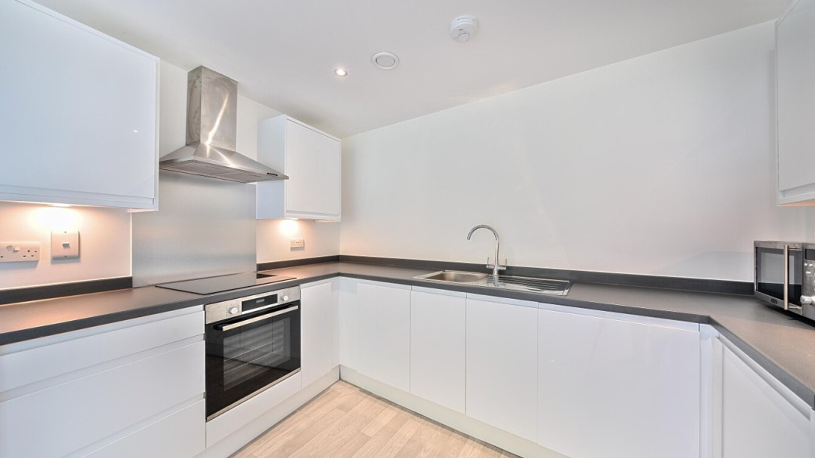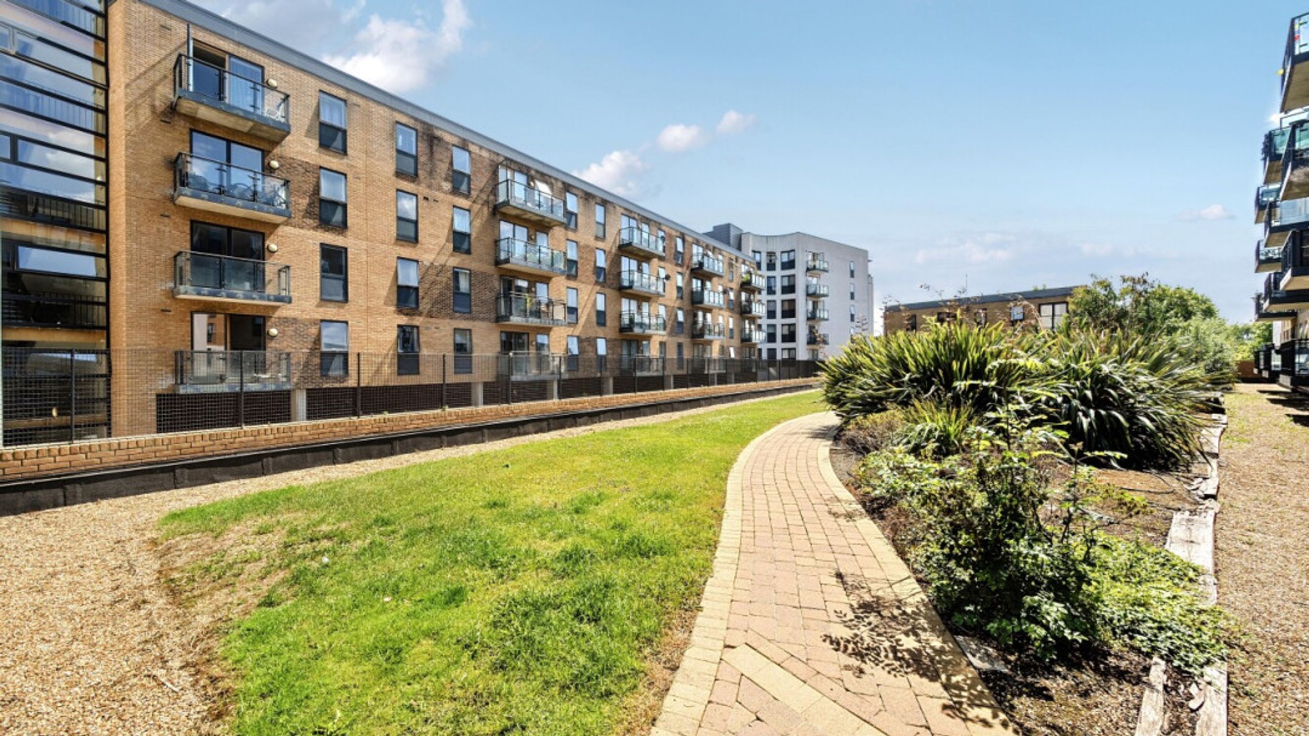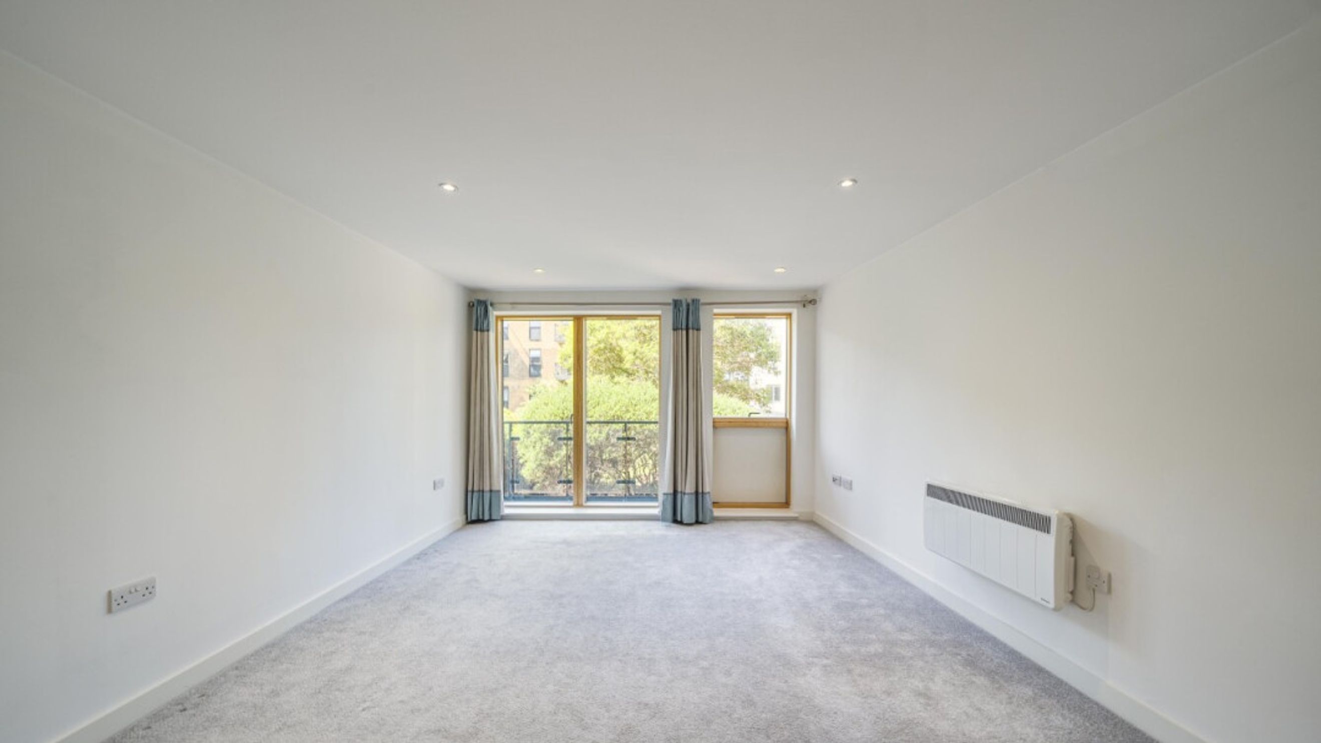 All rooms lead off a central hallway in this bright and airy apartment. the open-plan kitchen and living area is flooded with natural light from the floor length doors opening onto a private balcony, which is not overlooked. The kitchen is fitted with white wall and base units and a dark worktops. It also benefits from integrated a oven, hob and extractor fan. A spacious double bedroom comes complete with fitted wardrobe and a modern bathroom, with a white three-piece suite with a shower over bath and a tile surround, completes the accommodation.