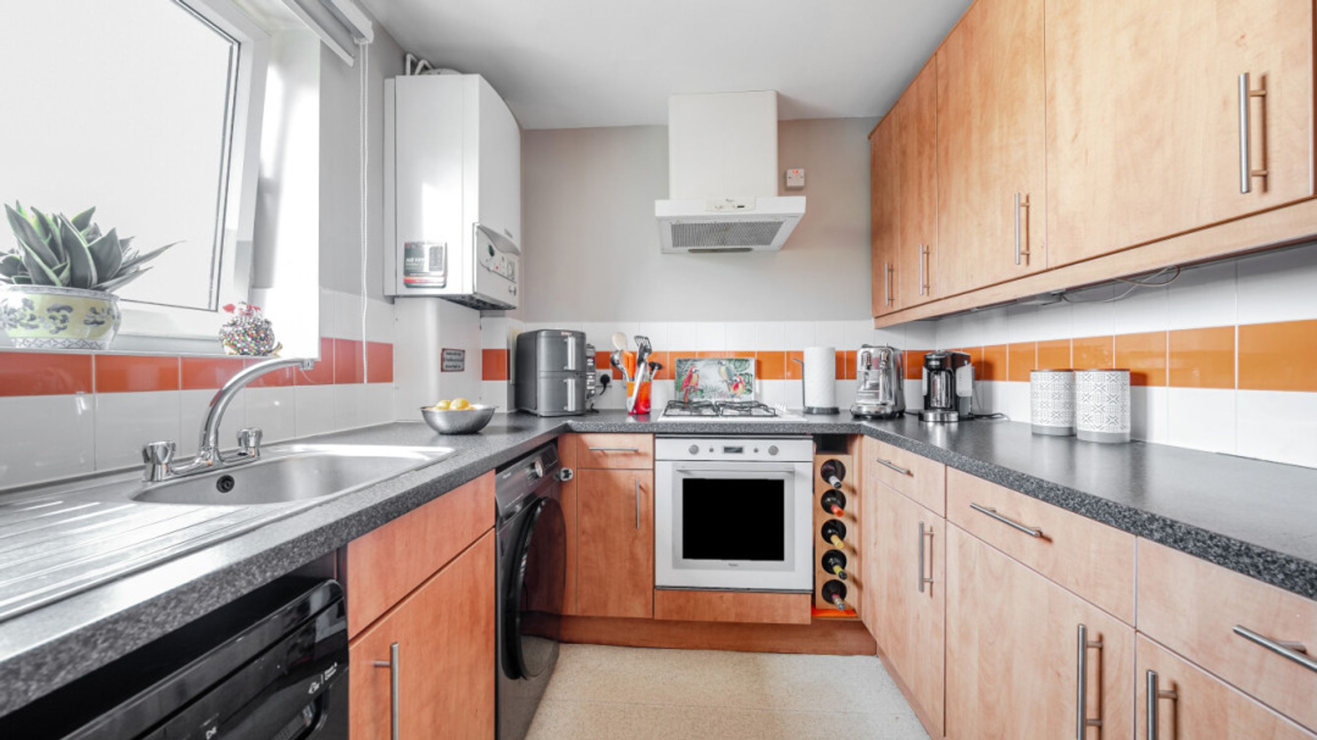 A square entrance hall with storage welcomes you into this immaculately presented apartment in a quiet corner position. The spacious dual aspect open plan reception area opens onto a generous sunny south facing balcony with space to dine or relax with friends. The kitchen, which opens from the reception room, includes a range of beech wall and base units incorporating an integrated oven, hob and extractor and spaces for a washing machine and fridge/freezer. A double bedroom with in-built storage and refurbished, tiled bathroom, complete the accommodation