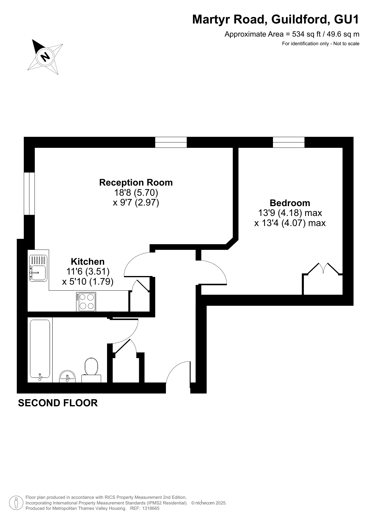 The property on the second floor comprises an entrance hall, a living room with a modern open-plan kitchen, one large bedroom, and a bathroom.