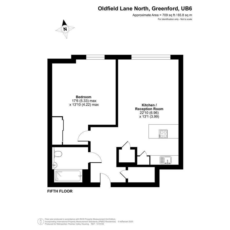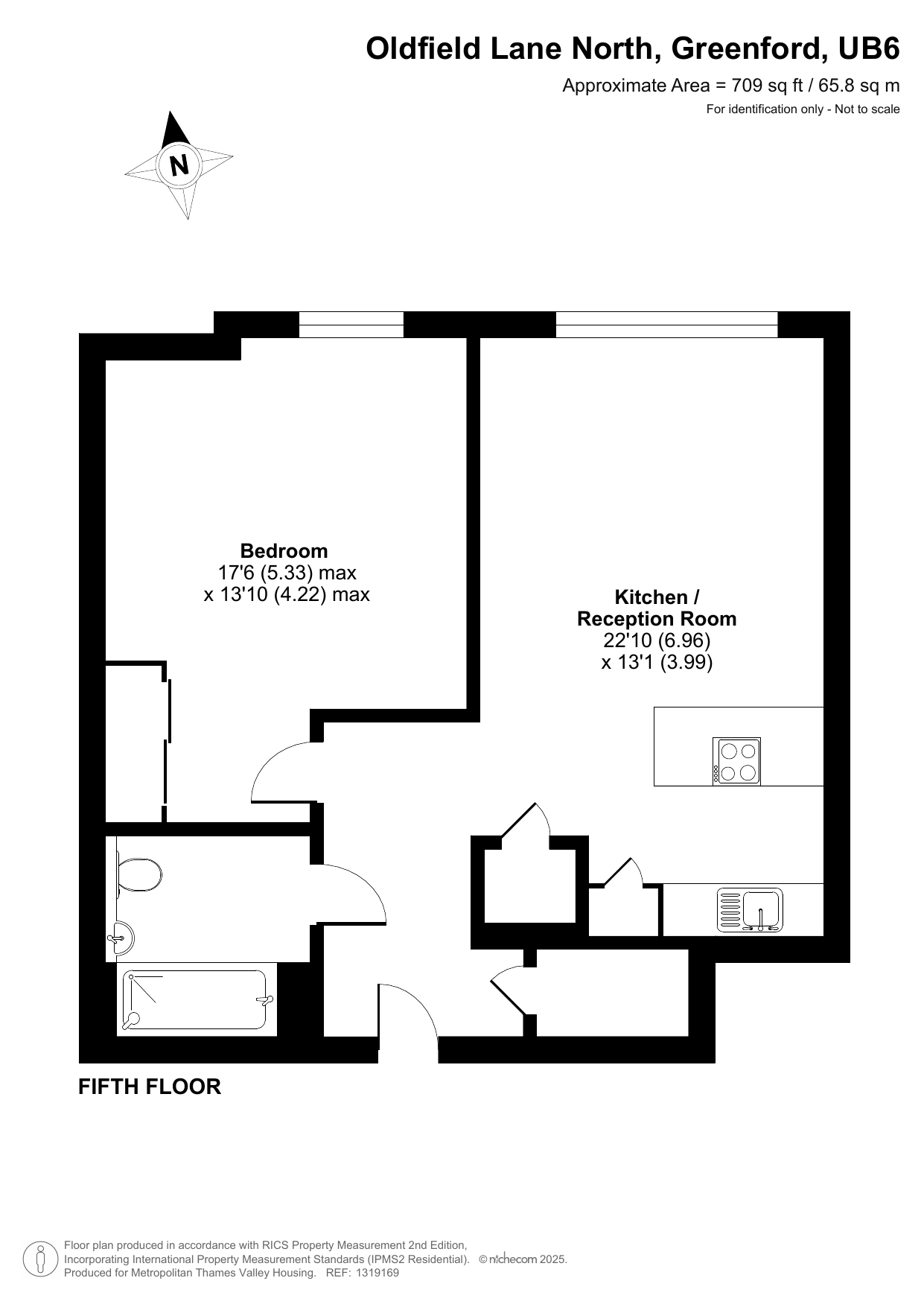 The property on the fifth floor comprises an entrance hall with a storage cupboard, a spacious living room with a modern open plan kitchen, one large bedroom and a bathroom.