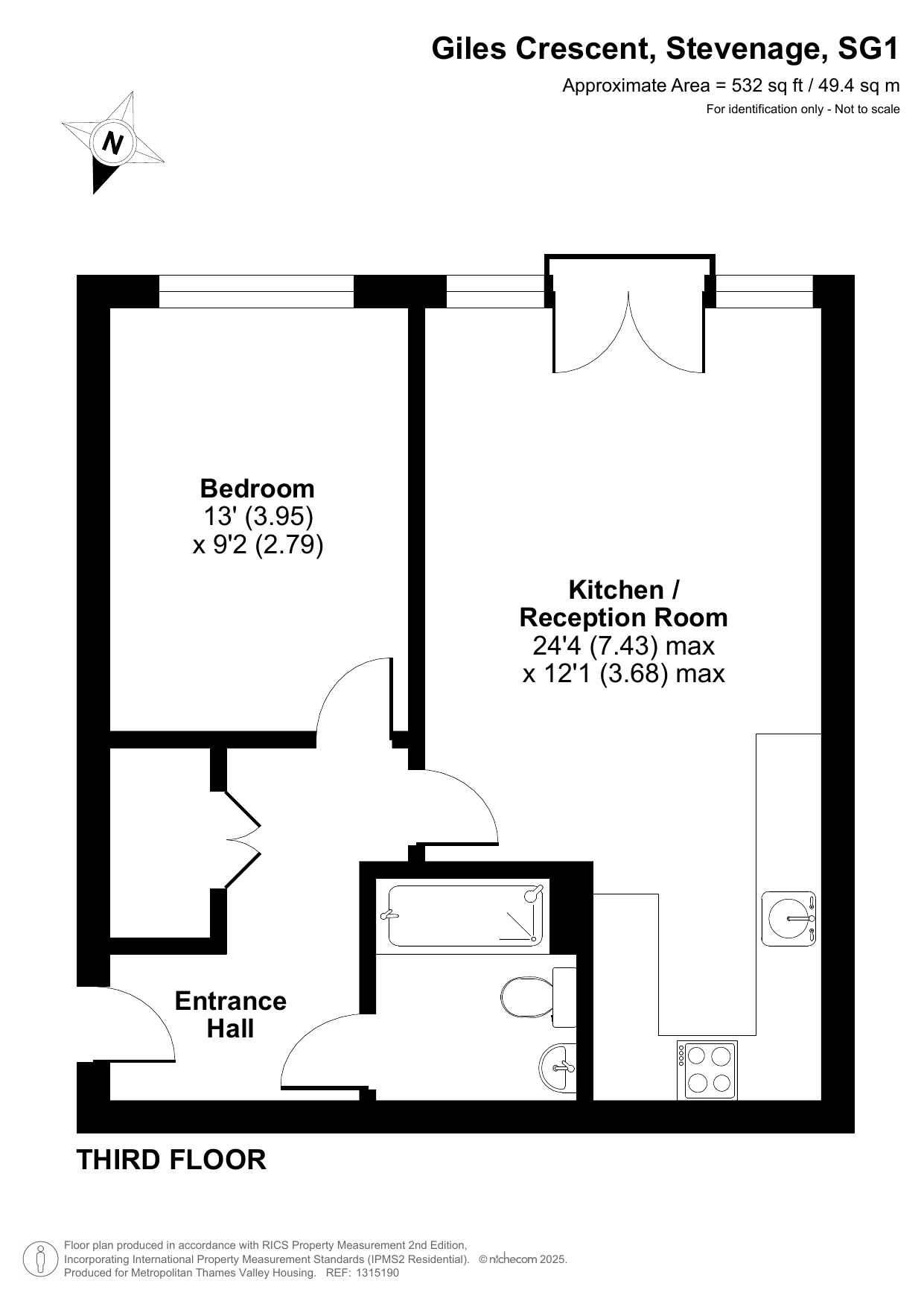The apartment features an entrance hall, a spacious open-plan living room and kitchen, one bedroom, and one bathroom.