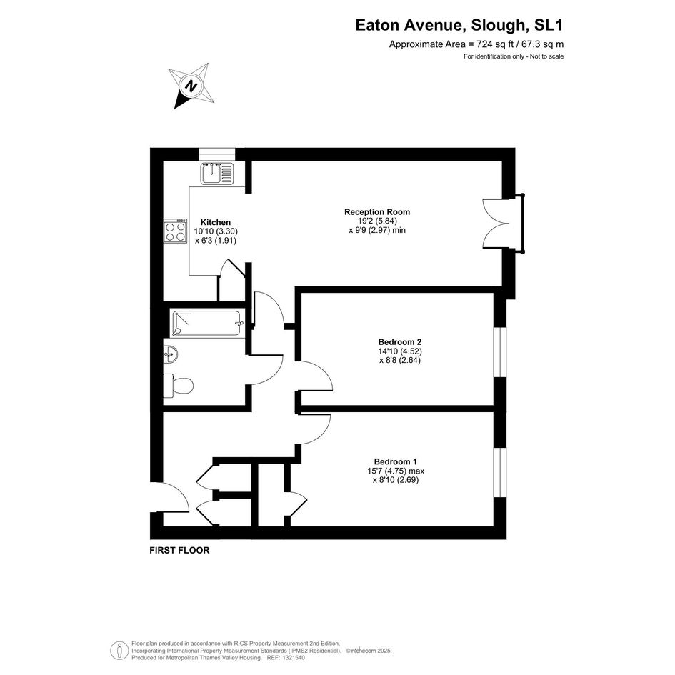 The property on the first floor comprises an entrance hall, a spacious living room with space for a dining room, a fitted kitchen, two double bedrooms, and a bathroom.