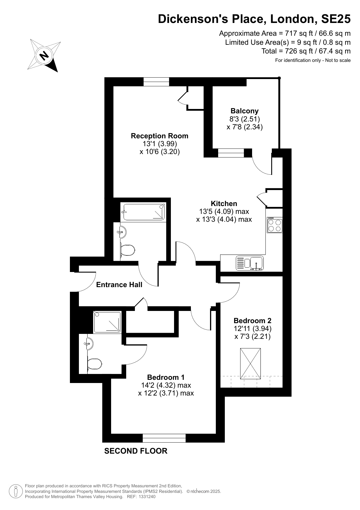 The flat features an open plan living room and kitchen, two bedrooms, and two bathrooms.