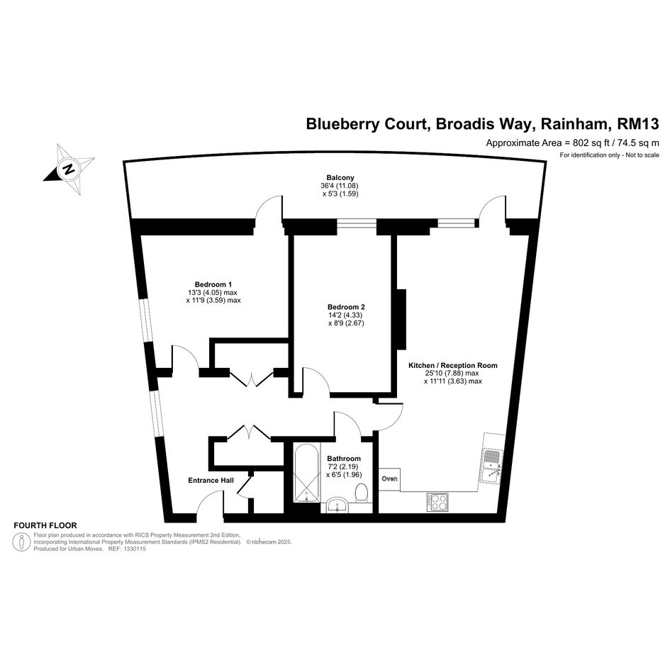 A smartly-presented apartment on the fourth (top) floor of this recently-constructed development. The spacious property has an approximately twenty-six-foot reception room with fitted TV unit and open-plan kitchen area featuring attractive, walnut-style units. A door which leads out onto an east/south-east-facing balcony, the elevation affording a sweeping view over Mardyke Greenway and the low-level neighbouring houses. The bedrooms are both good-sized doubles, there is a sleek, modern bathroom and a pair of large storage/utility cupboards have been provided in the naturally-lit entrance hallway. Demanding insulation standards, high performance glazing and a communal heating/hot water system make for a very good energy-efficiency rating. Blueberry Court has a communal courtyard and a gated, underground car park which includes an allocated space for this apartment. The A13 offers a direct route into central London or out to the M25 and Rainham town centre or railway station can also be easily reached by bus or bike. Nearby Beam Parklands Country Park provides many acres of outside space to explore.